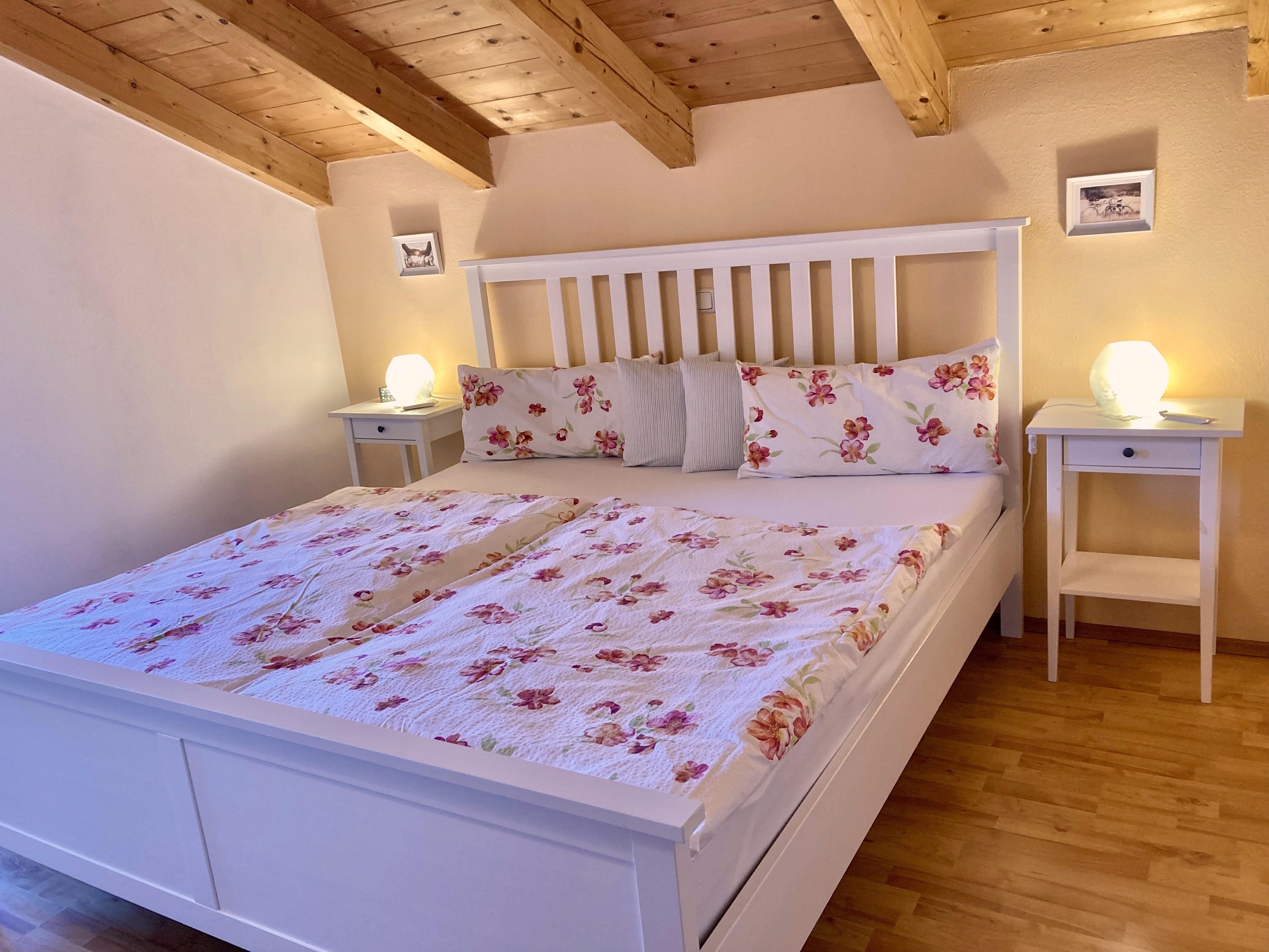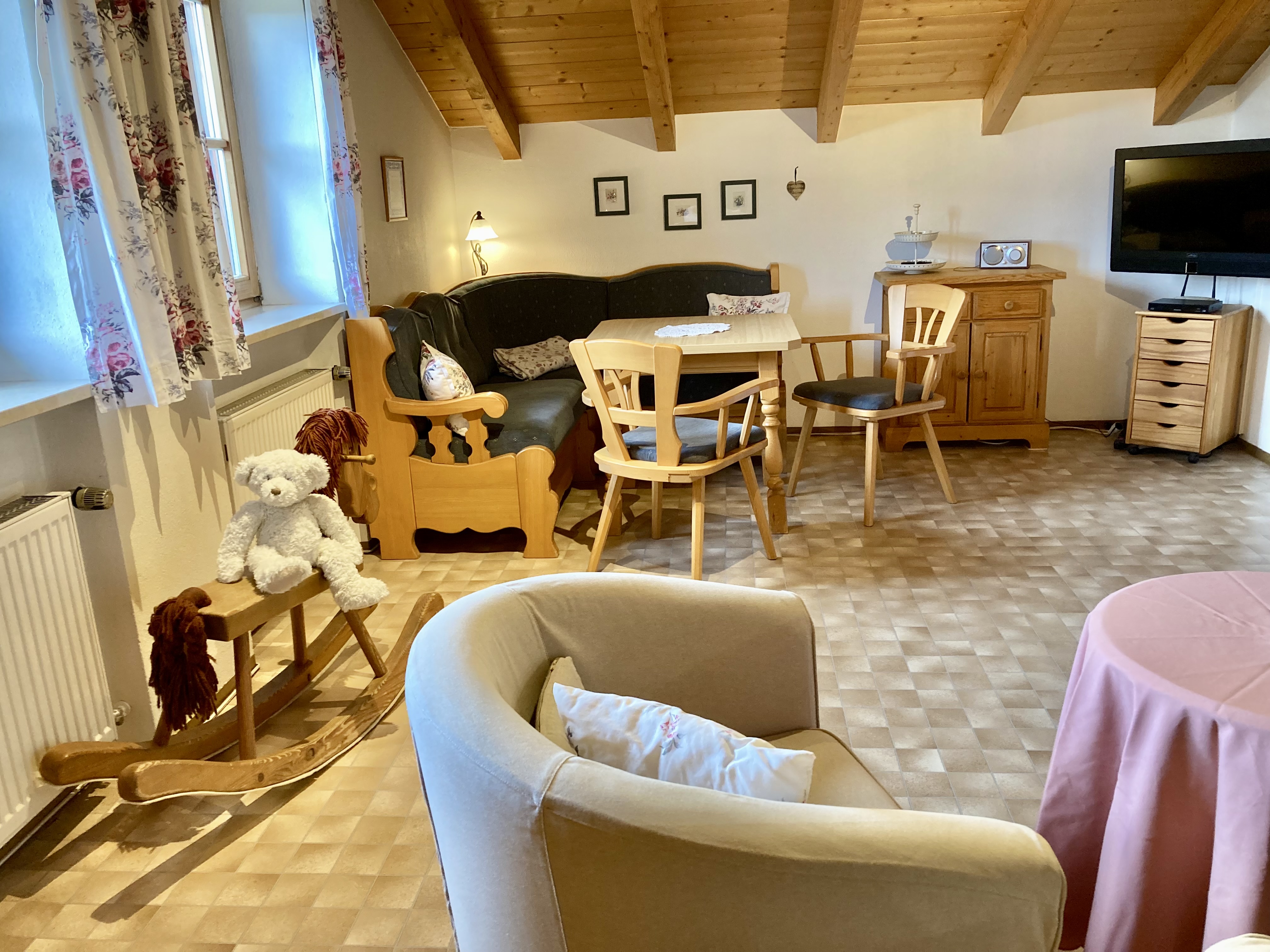 Unsere gemütliche Ferienwohnung mit Ostbalkon befindet sich in im Obergeschoß in ruhiger Ortsrandlage in unserem Einfamilienhaus. Die vollständig eingerichtete Küche und der Wohnbereich lassen keine Wünsche offen. WLAN Anschluß ist vorhanden, ein zusätzliches Reisebett für Ihre Kleinen hat genügend Platz. Wir stellen ein separates Kinderbett auf Anfrage gerne für Sie bereit.