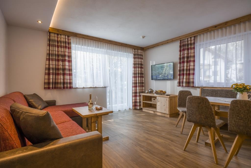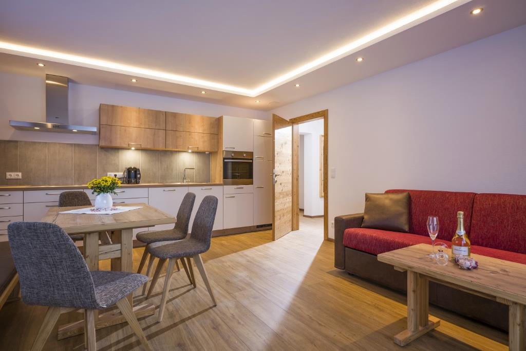 ca. 80m², moderner alpiner Landhausstil mit hochwertigen Zirbenholz Möbeln, 2 Schlafzi., 3 TVs, Diele, getrenntes WC, 2 Badezimmer teilw. mit grosser Badewanne und Walkin Dusche. Wohn-Essbereich mit Küche, gemütliche Couchlandschaft (für 2 Couchbetten geeignet), grosser Balkon mit Blick den Wandberg
