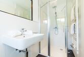 Das Badezimmer ist mit einer ebenerdigen großen Dusche sowie einem Handtuchwärmer und einer Fußbodenheizung ausgestattet.