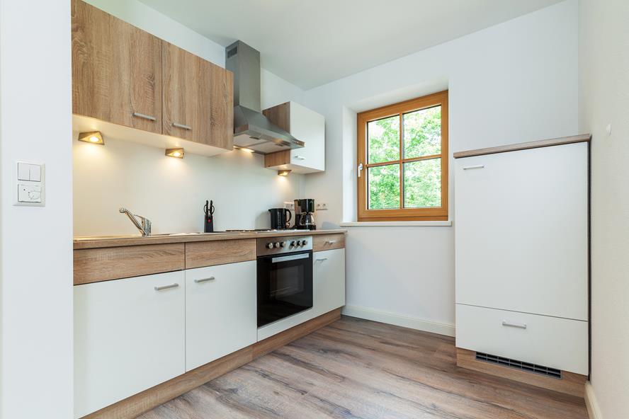 Die Küchenzeile im Wohn-Esszimmer verfügt über einen 4-Platten-Elektroherd mit Backofen, Kühlschrank und Gefrierfach. Ebenfalls stehen Ihnen eine Kaffeemaschine, Wasserkocher und ein Toaster zur Verfügung.