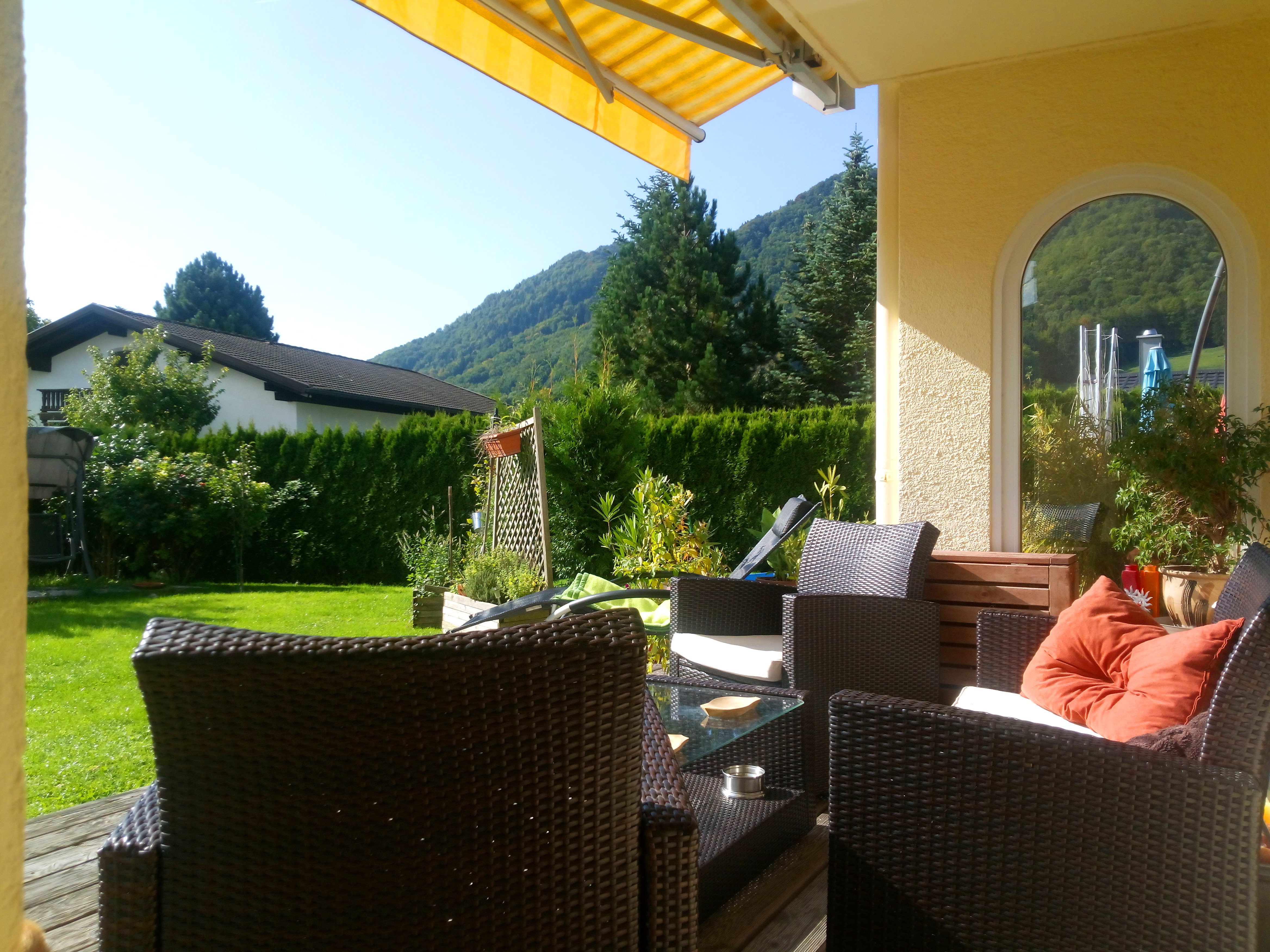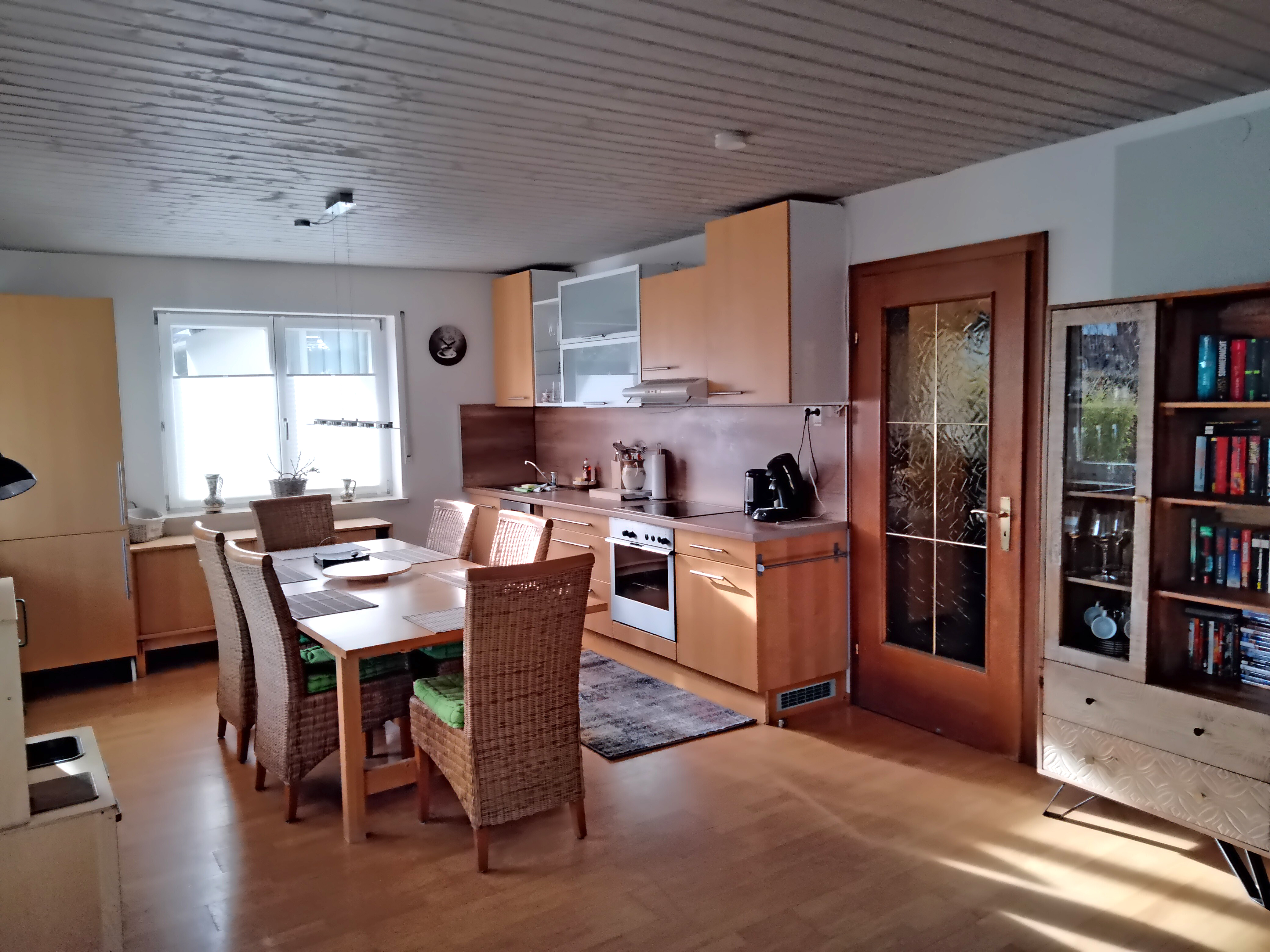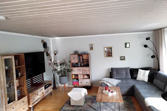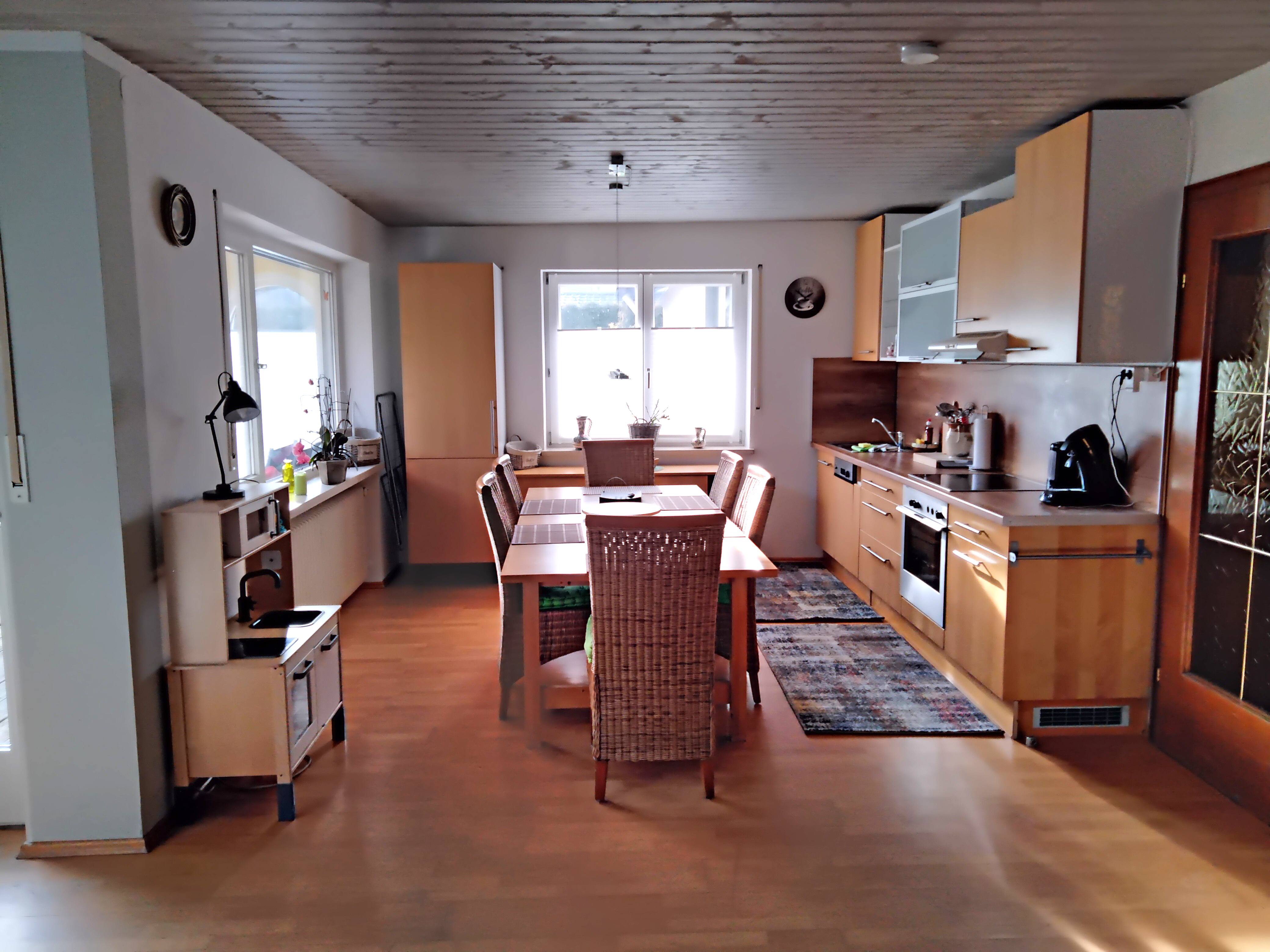 Nichtraucher Erdgeschoss-Wohnung 75 qm mit herrlichem Blick auf die Berge. Terrasse mit gemütlichen Rattan Möbeln und schönem Garten. Großzügiger und heller Wohnraum mit offener Küche und Esstisch. Fühlen Sie sich wohl im gemütlich eingerichteten Wohnraum mit großer Couch, Flat-Kabel-TV und kostenloses WLAN. Vollausgestatte Küche mit Spülmaschine, Herd mit Backofen, Kaffee-Pad-Maschine und großem Esstisch. Ein separates Schlafzimmer mit Doppelbett und zwei Einzelbetten als Stockbett. Badezimmer mit Dusch-/Badewanne, WC, Fön und Waschmaschine. Für Kinder haben wir eine Spielecke mit Spiel-Küche eingerichtet. Ein Hund darf gegen Aufpreis gerne mitgebracht werden.