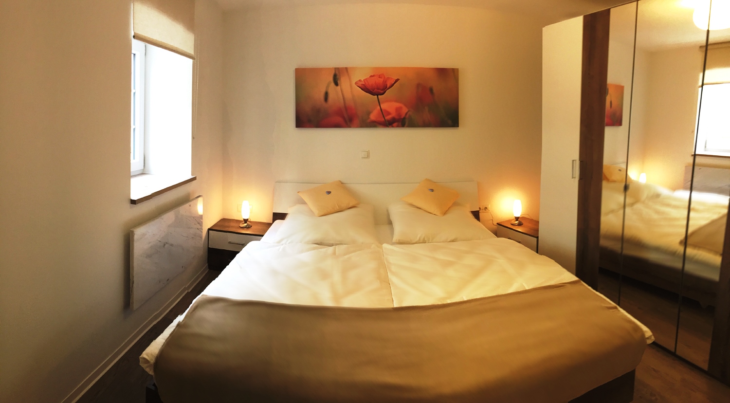 Das schöne moderne Appartement mit ca. 40 m² Wohnfläche lädt Sie zum Wohlfühlen ein. In der Wohnung befindet sich ein Schlafzimmer mit Doppelbett (1,80 x 2,00m) sowie ein Wohnraum mit Schlafcouch (1,60 x 2,00m). Die Wohnung ist ideal für zwei Erwachsene, aber auch für eine Familie mit zwei Kindern. Weitere Personen sind bei telefonischer Anfrage beim Gastgeber möglich. Die Wohnung verfügt über ein Bad mit großer Dusche, einen Fernseher sowie kostenfreies WLAN. Eine voll ausgestattete Einbauküche mit Wasserkocher, Kaffeepadmaschine sowie Salz, Pfeffer etc. ermöglicht es Ihnen, sich Ihr Frühstück oder Essen selbst zuzubereiten.