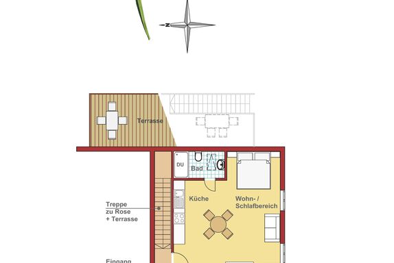 Diese Wohnung hat ein kleines Kinderschlafzimmer mit zwei Betten, einen großen Wohnschlafraum mit Doppelbett in der Nische, der Essecke mit Fernseher, der Küche mit Spülmaschine, Kühlschrank, Gefrierfach, Backofen, Ceranfeld, Wasserkocher, Kaffeemaschine, Toaster und einen Tisch auf der darunter liegenden überdachten Terrasse zum draußen sitzen. Diese Wohnung befindet sich im Dachgeschoss 2. Stock.