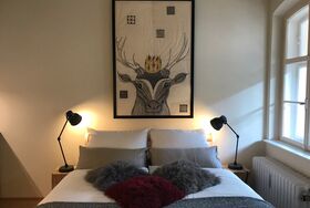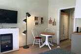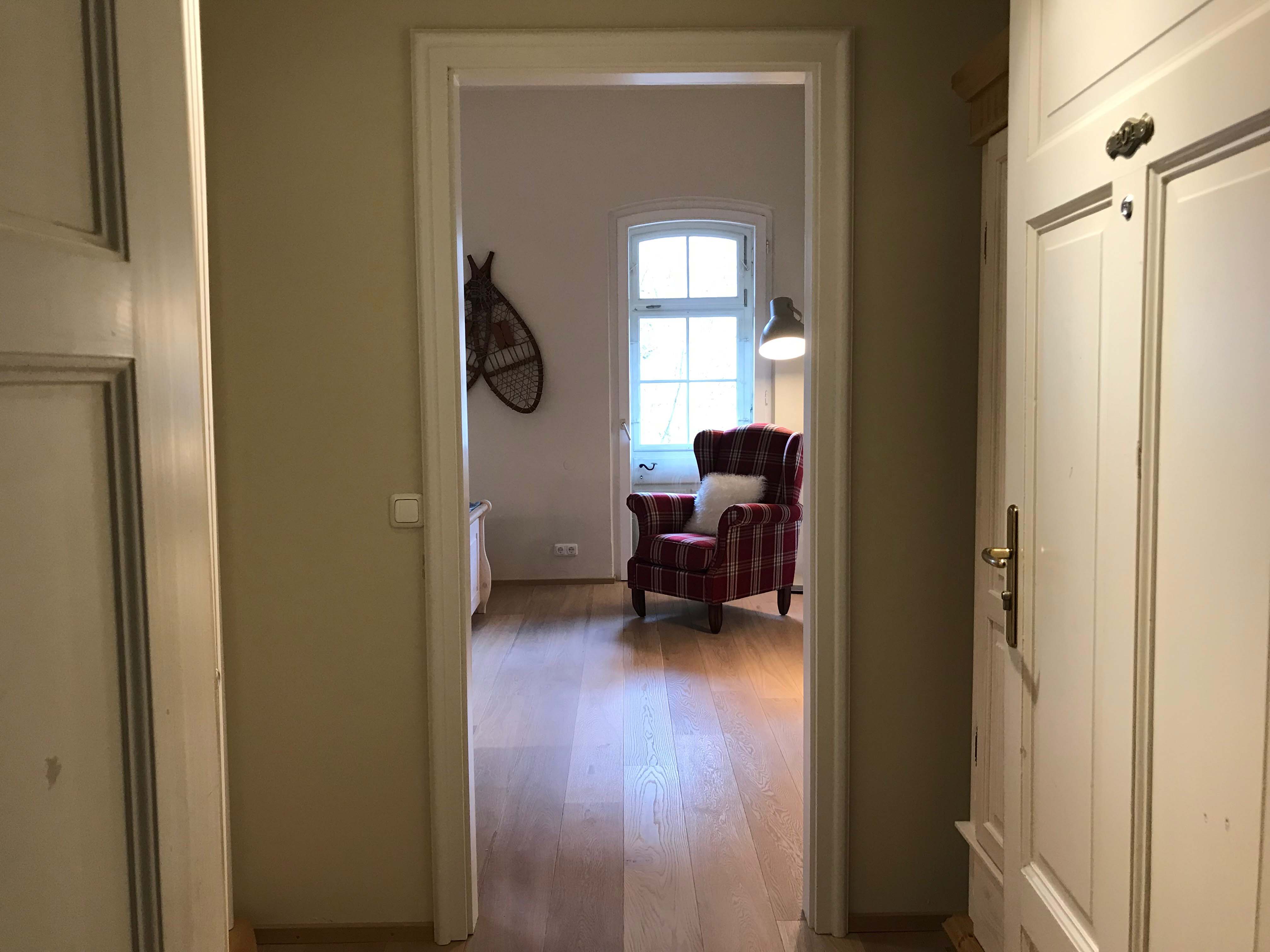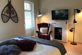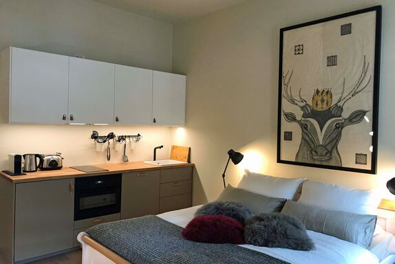 Die Ferienwohnung ist mit Eichenparkett ausgelegt und eingerichtet mit einem 160 cm breiten Bett aus Massivholz, einem Ohrensessel, einer Sitzecke, einem elektrischen Kamin, kostenloses WLAN, einer vollausgestatteten Küchenzeile mit einer Nespresso Kaffeemaschine und Spülmaschine sowie einem geräumigen Bad. Ein Kleiderschrank befindet sich in der Eingangsdiele.
