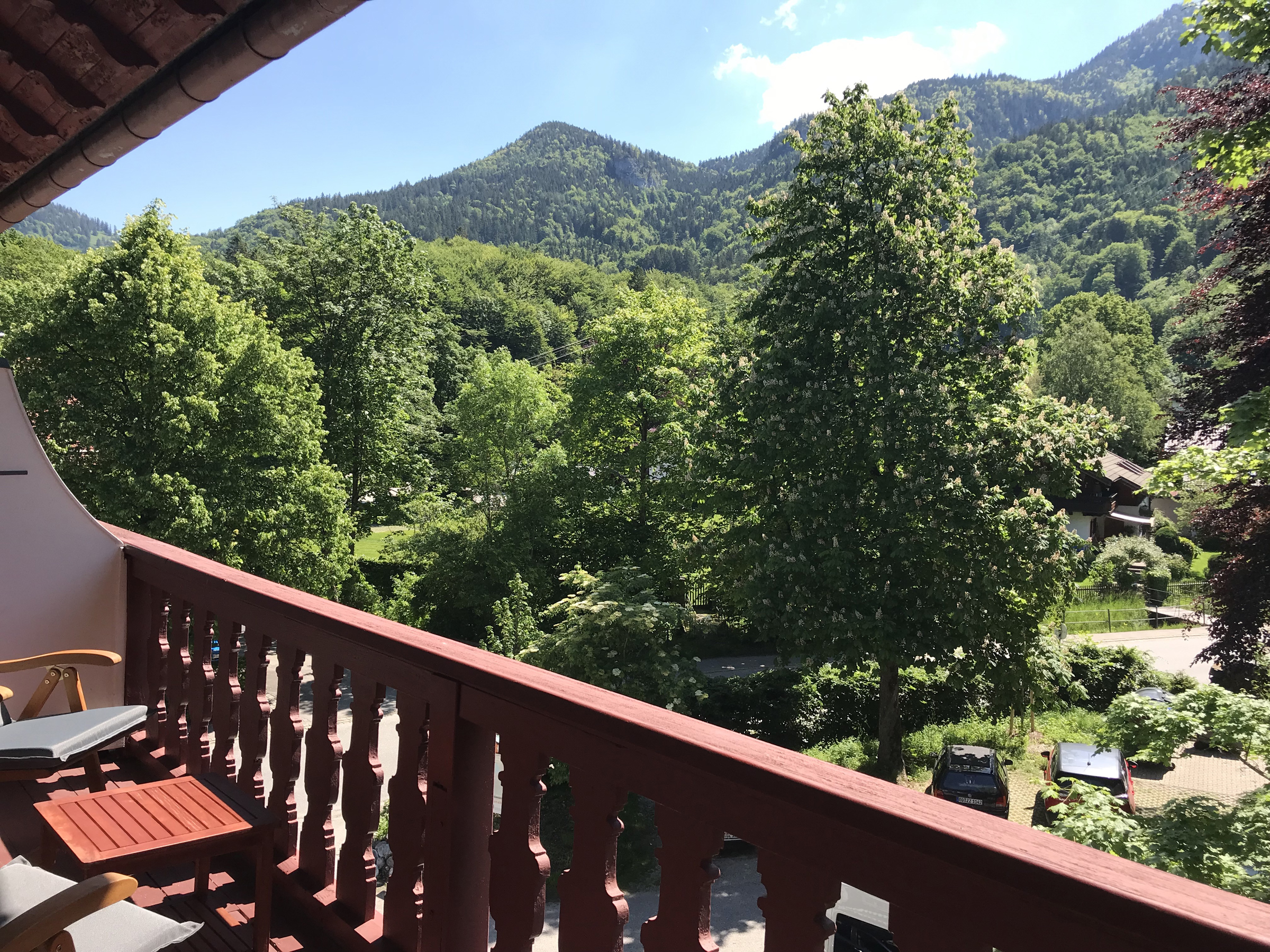 Vom großen Balkon aus lassen sich auf verstellbaren Holz-Lehnstühlen die Gondeln auf ihrer Fahrt zum Gipfelplateau der 1669 m hohen Kampenwand, die mit ihren markanten Zacken das Wahrzeichen der Chiemgauer Region ist, beobachten.