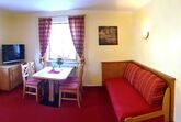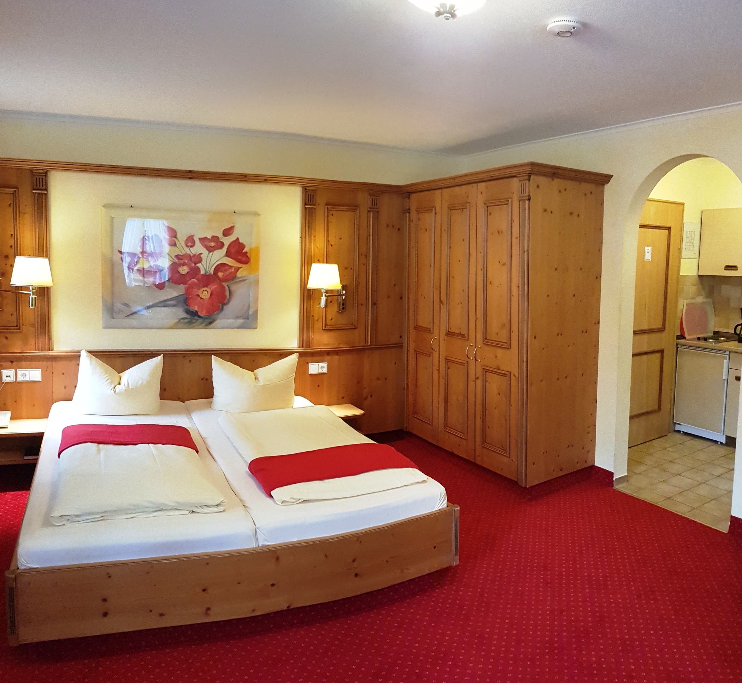 Wohn/Schlafraum, Doppelbett, Couch, Essecke, komplett eingerichtete Kochnische, 2-Platten-Herd, Mikrowelle, Kühlschrank/Tiefkühlfach, Dusche-/Badewanne/WC, Föhn, Balkon/Terrasse, Zimmersafe, Telefon, SAT-TV, kostenloses W-Lan, Radiowecker