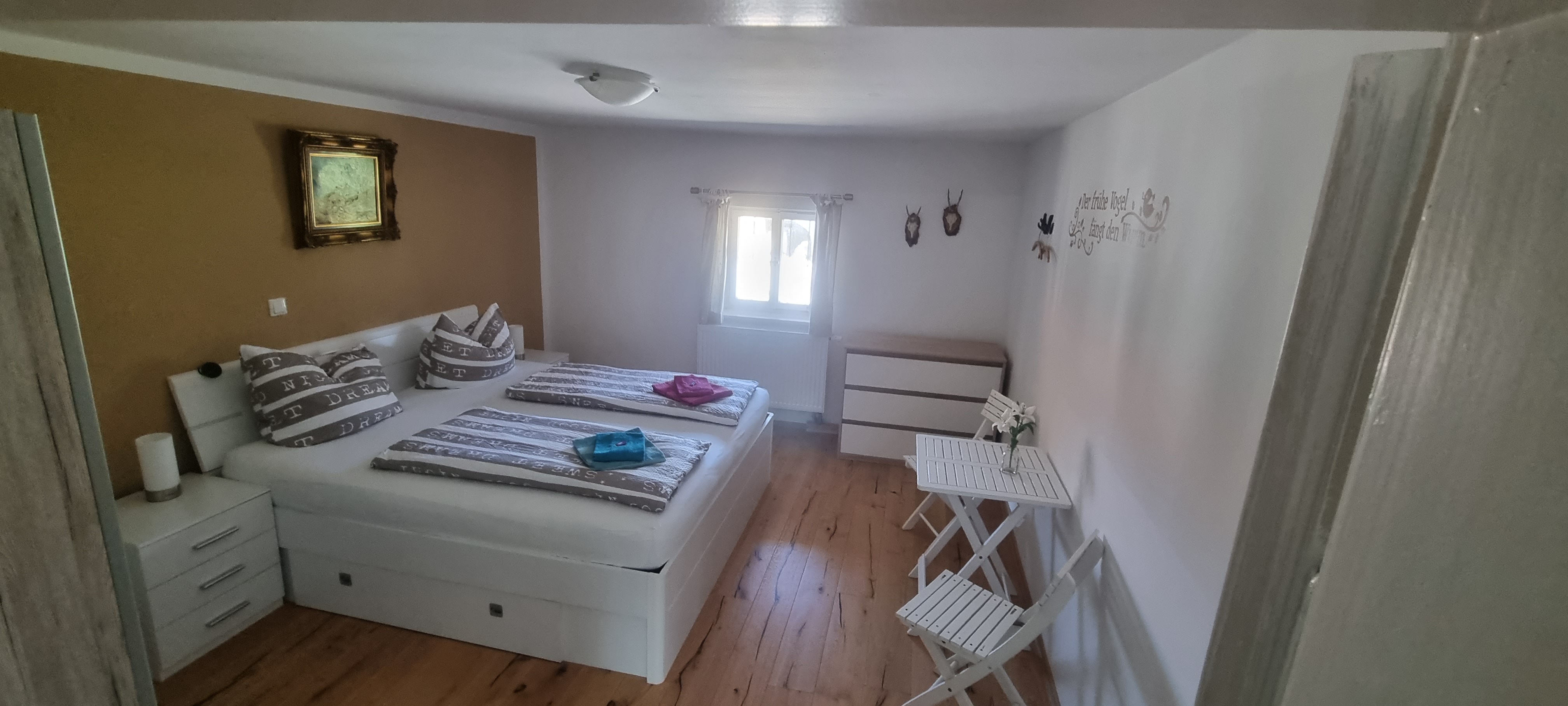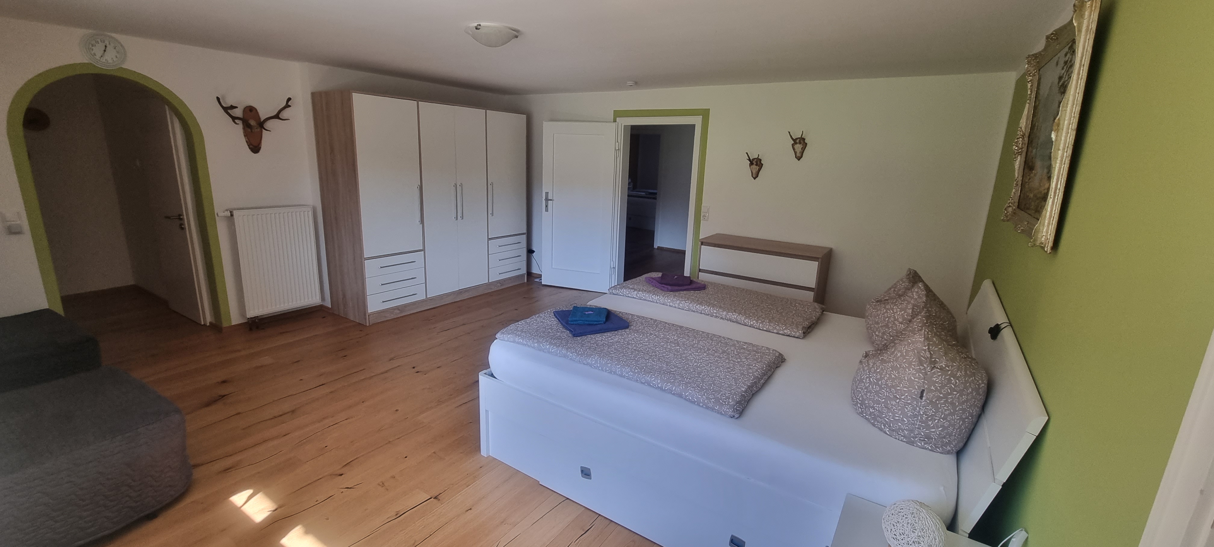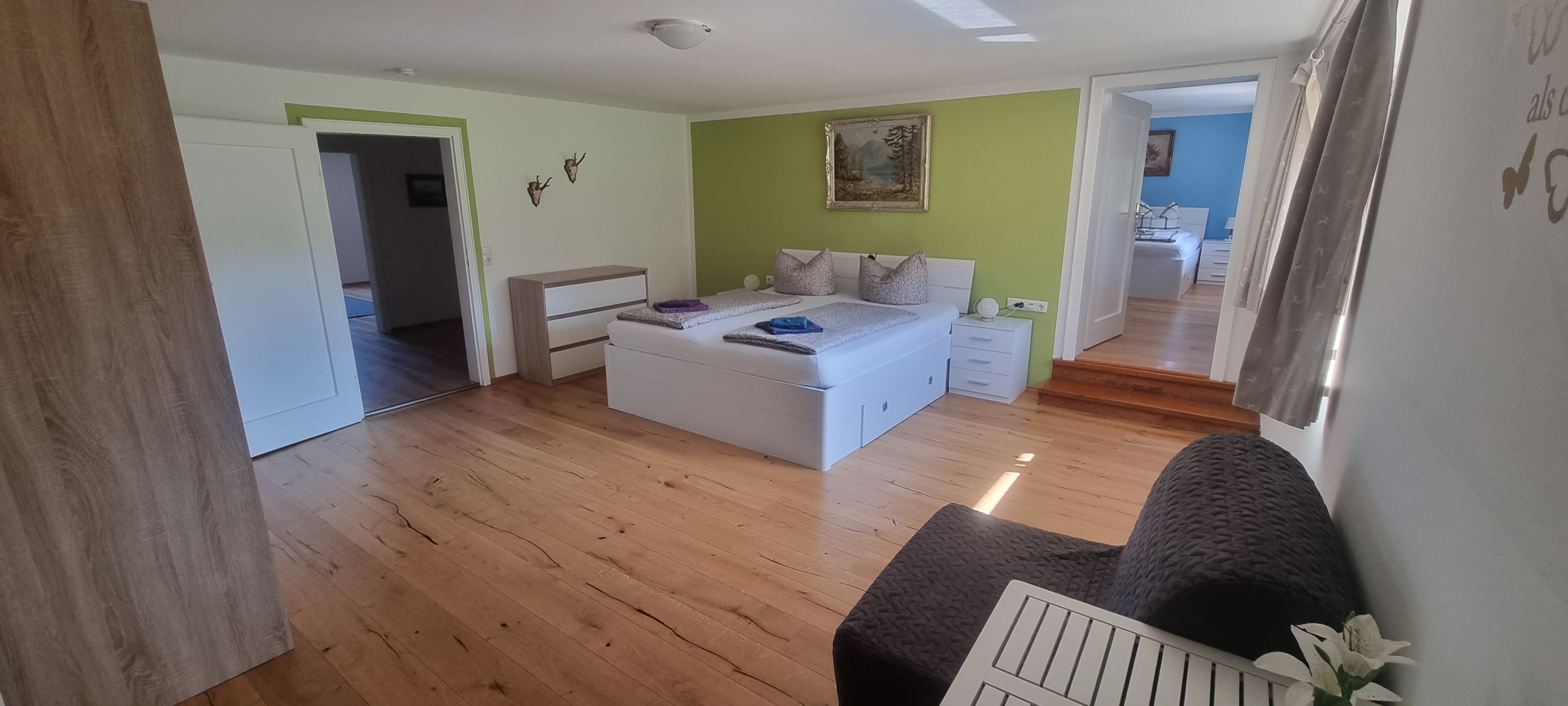 Die FeWo verfügt über 3 separate Schlafzimmer (24 qm/23 qm/16 qm) mit je einem Doppelbett. Das größte Zimmer verfügt über ein Bad en Suite mit Whirlpool und eigenem Zugang zur Sauna (gegen Gebühr, Handtücher für die Sauna müssen selbst mitgebracht werden). Den anderen Zimmern steht ein Duschbad zur Verfügung. Im mittelgroßen Zimmer lädt ein Südbalkon mit traumhaften Bergblick zum Erholen und Entspannen ein.