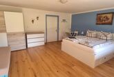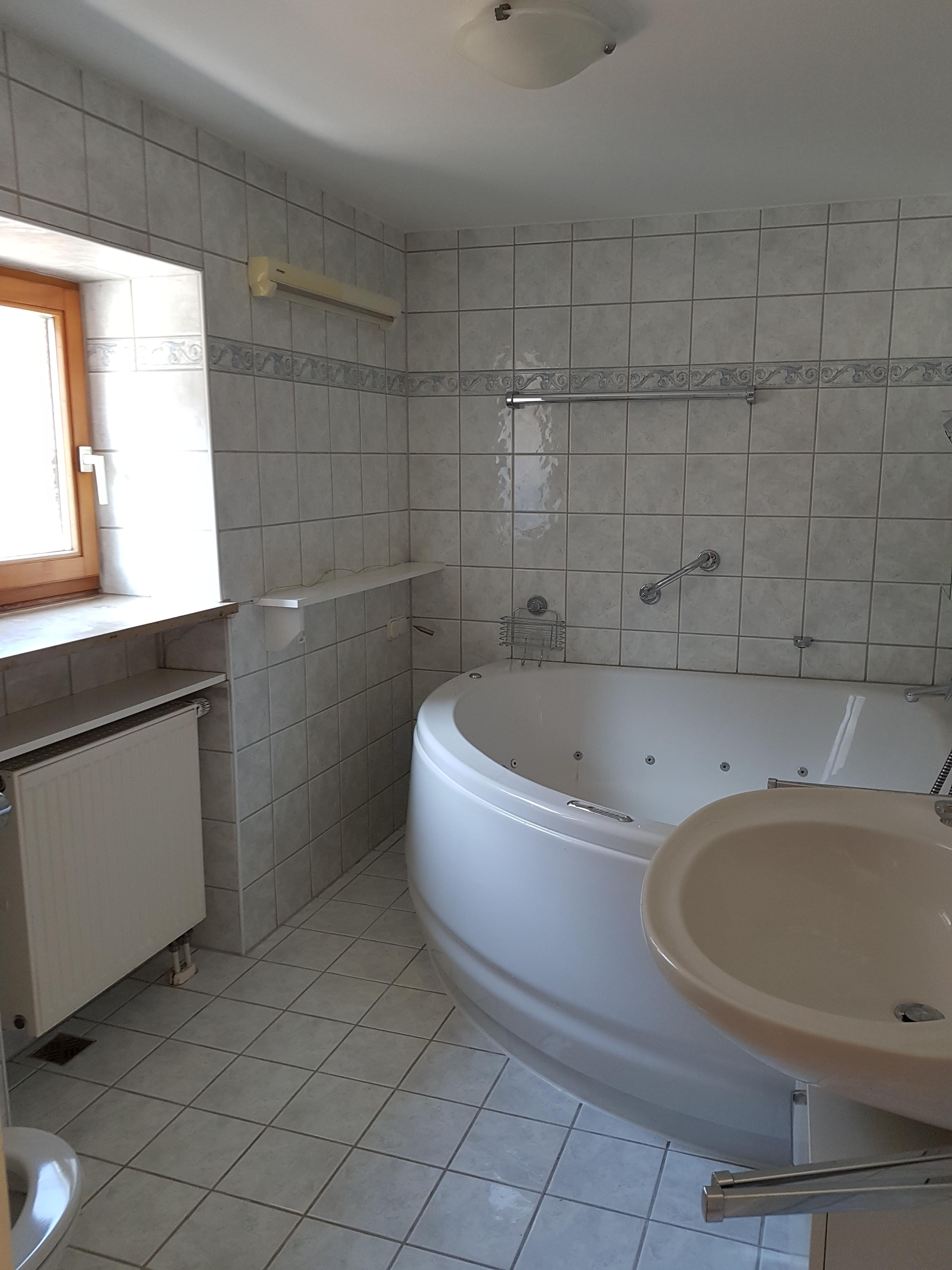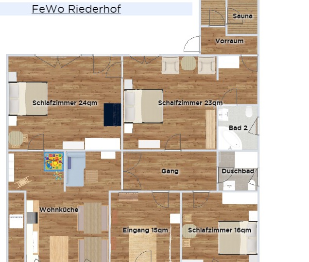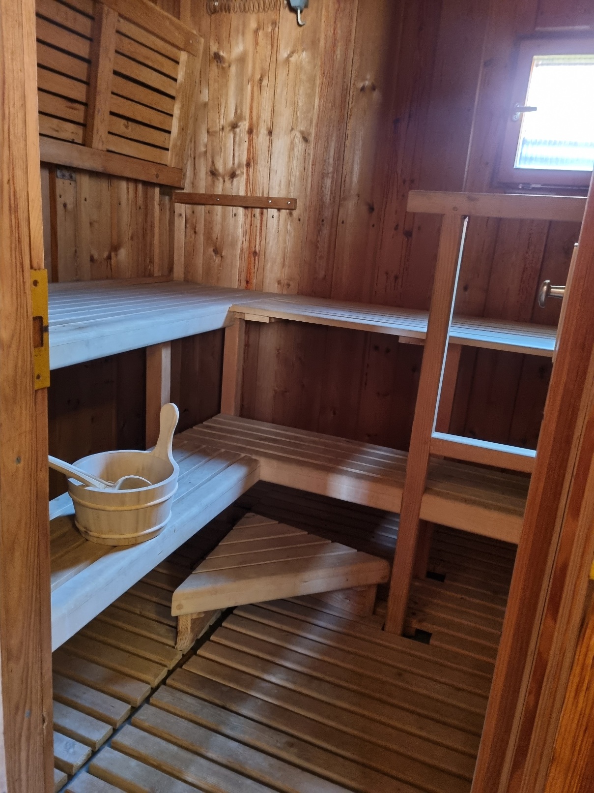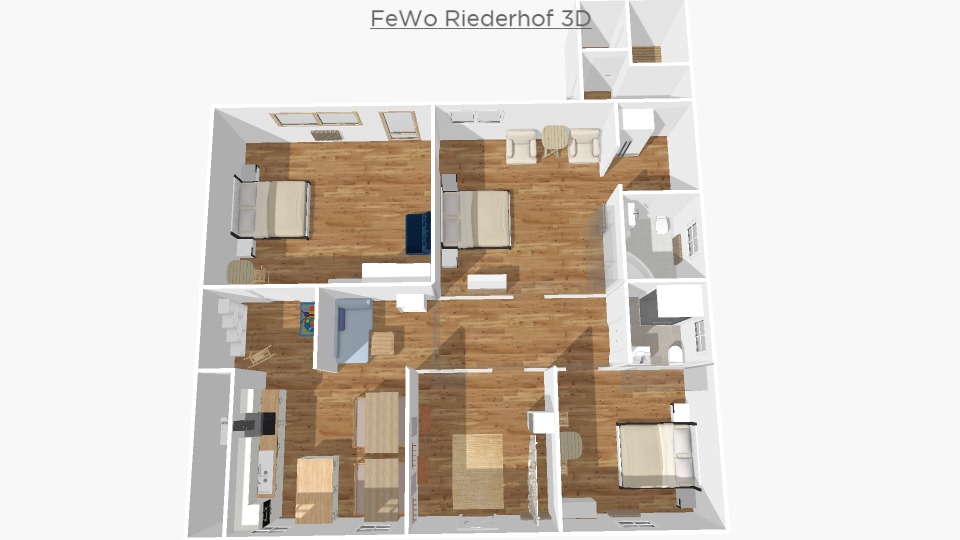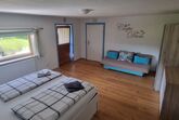 Die FeWo verfügt über 3 separate Schlafzimmer (24 qm/23 qm/16 qm) mit je einem Doppelbett. Das größte Zimmer verfügt über ein Bad en Suite mit Whirlpool und eigenem Zugang zur Sauna (gegen Gebühr, Handtücher für die Sauna müssen selbst mitgebracht werden). Den anderen Zimmern steht ein Duschbad zur Verfügung. Im mittelgroßen Zimmer lädt ein Südbalkon mit traumhaften Bergblick zum Erholen und Entspannen ein.