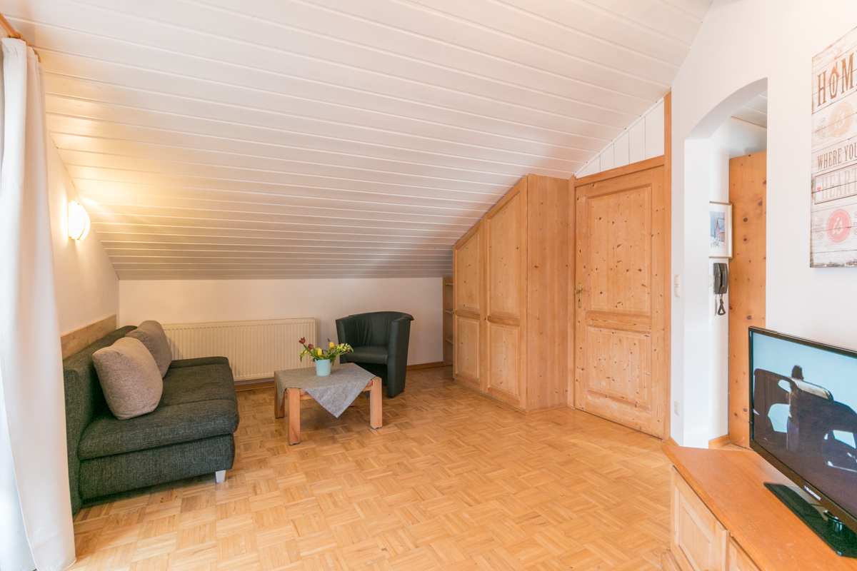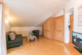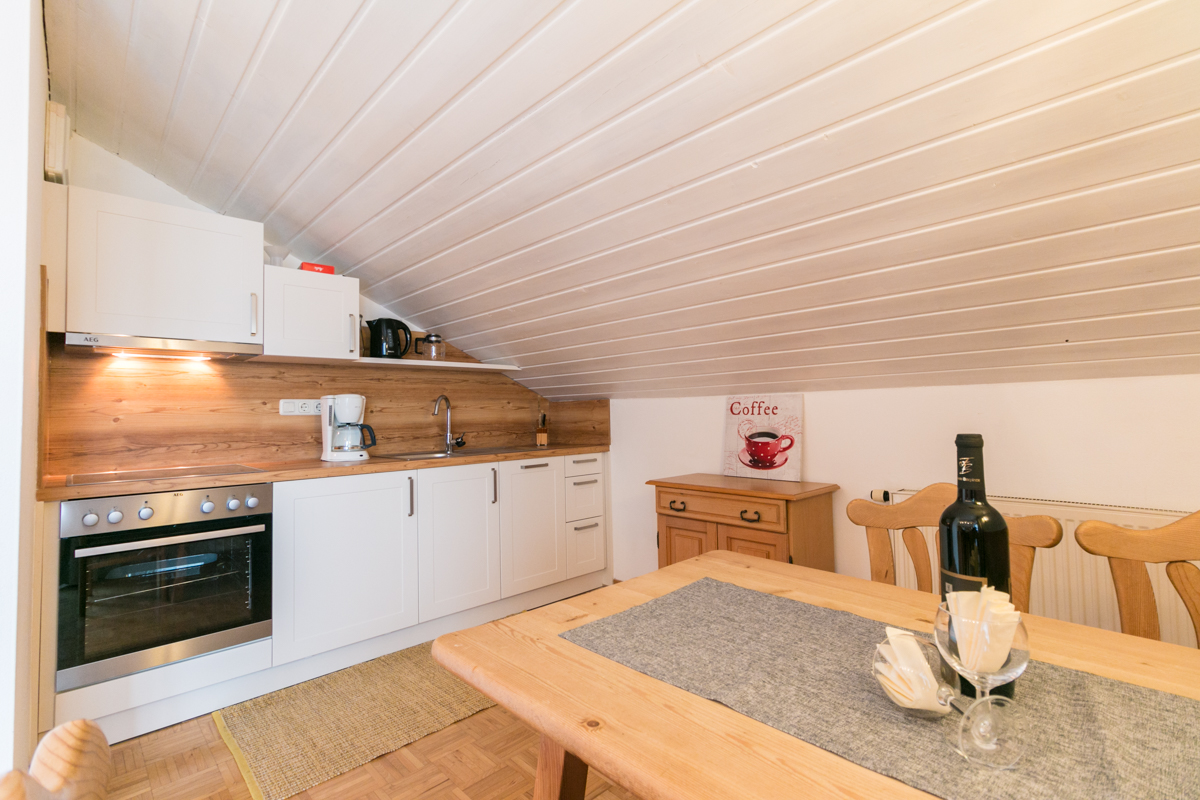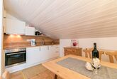 Komfortable 2-Zimmer Ferienwohnung für bis zu 4 Personen (2 Erwachsene und 2 Kinder bis max. 14 J.) mit moderner, voll ausgestatteter Küchenzeile in einer Dachschräge sowie einem ausziehbaren Doppelbett im Wohnbereich, einem modernen Badzimmer und einem extra Schlafzimmer.
