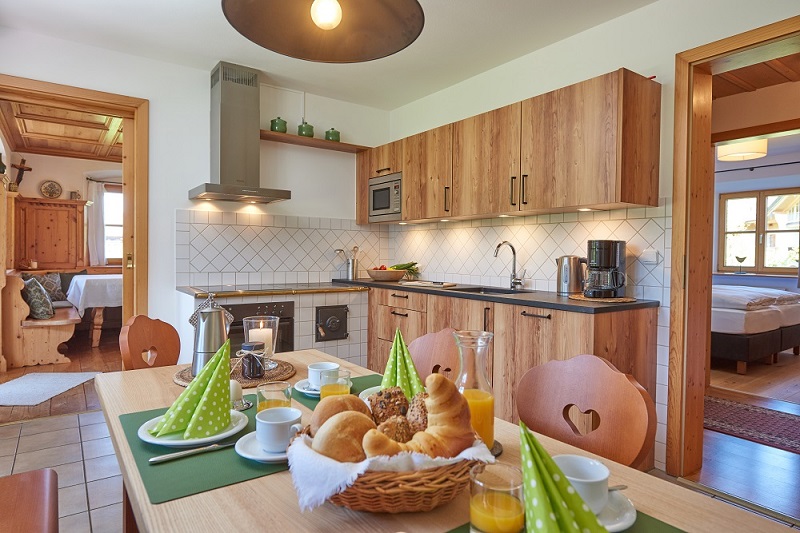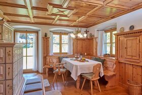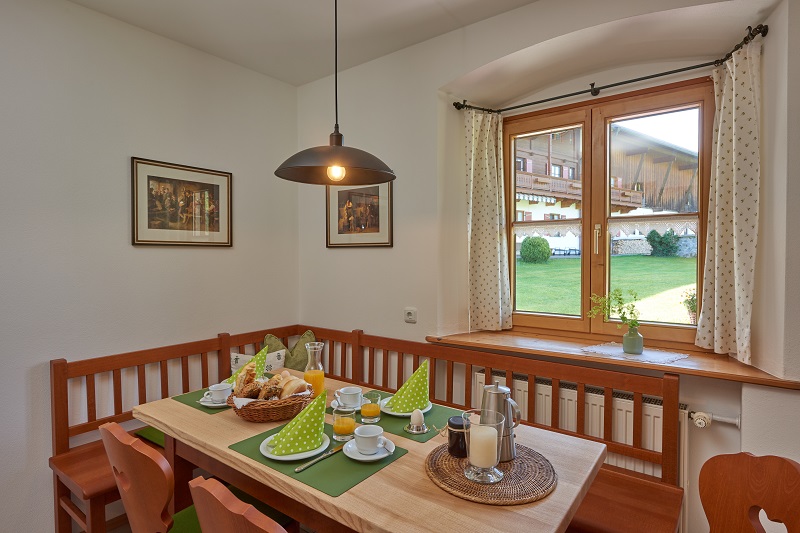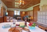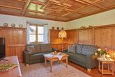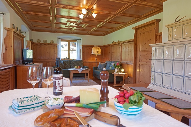 5-Sterne-Ferienwohnung 1-4(5) Personen, die großzügige Ferienwohnung hat eine Essecke in der Küche, sowie einen Essplatz im Wohnzimmer; Wohnzimmer mit gemütlicher Bauernstube und Kachelofen mit Sitzbankerl; Holzdielenböden und gekalkte Wände sorgen für ein besonders angenehmes Wohnklima. Im Untergeschoss finden Sie eine finnische Sauna mit Ruhebereich, sowie eine Waschküche mit Waschmaschine, Trockner, Bügelbrett, Bügeleisen etc. und einen Ski- und Schuhraum.