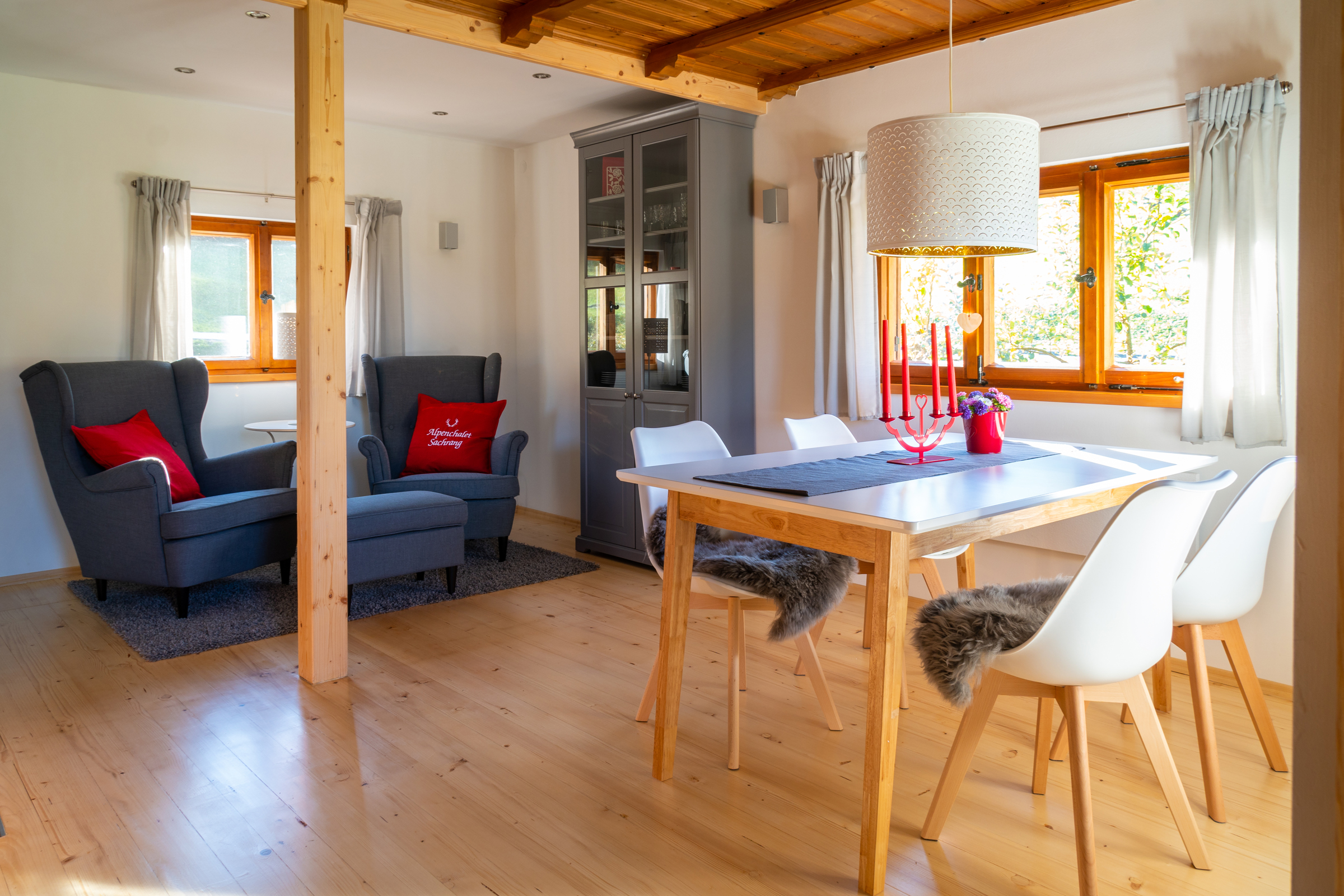 Das Alpenchalet liegt am Fuße des Spitzsteins auf 900 m Höhe. Bei uns finden Sie einen Rückzugsort zum Wohlfühlen und Entspannen, und das inmitten der Natur. Erleben Sie einen Urlaub mit dem gehobenen Komfort eines Hotels und der Urigkeit einer Berghütte. Das Alpenchalet ist ein neu renoviertes Ferienhaus, ca. 50 qm Wohnfläche und zwei Terrassen. Es verfügt über ein separates Schlafzimmer mit Doppelbett, komplett ausgestatteter Wohnküche, Dusche und WC, sowie kostenloses WLAN.