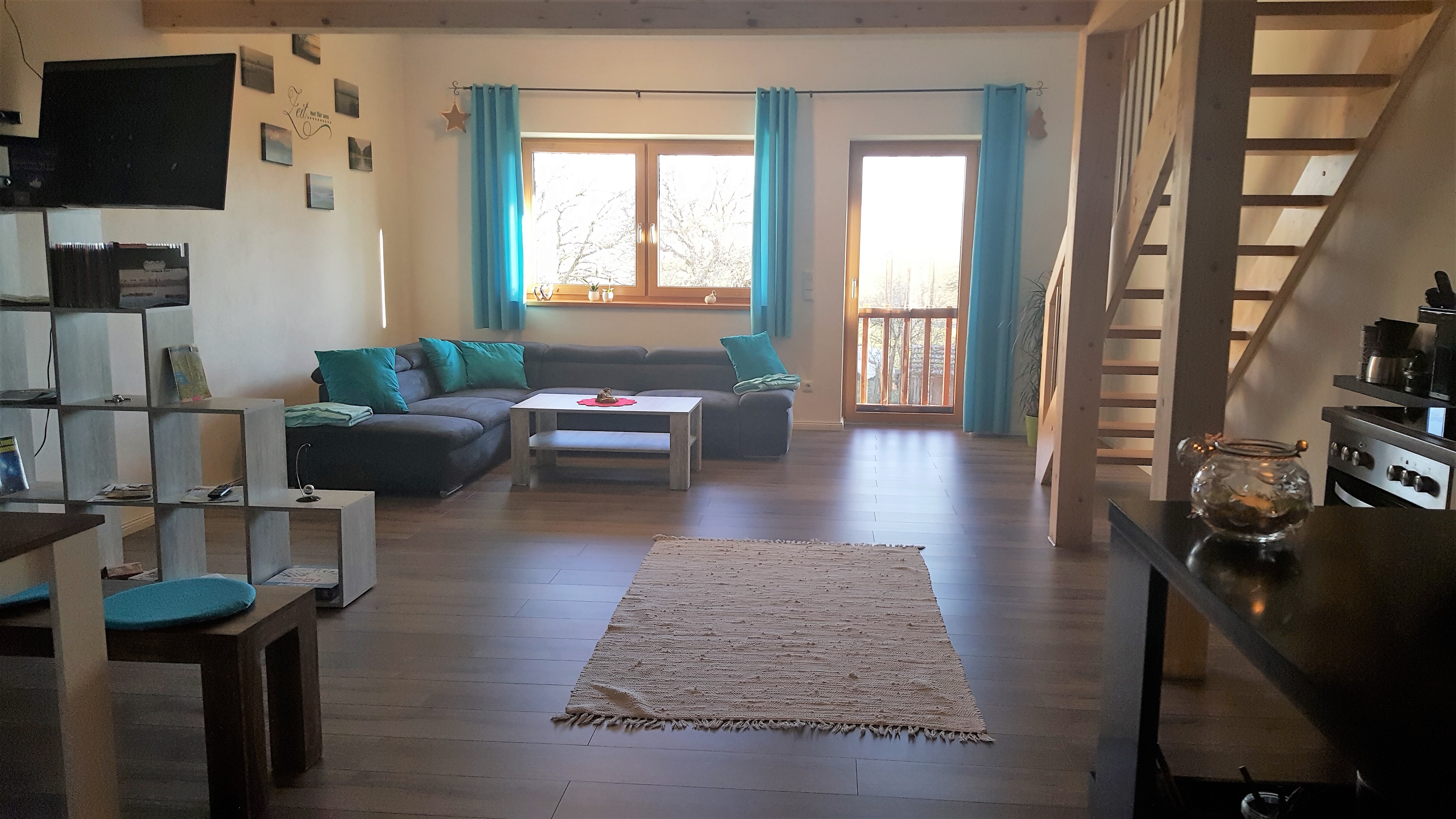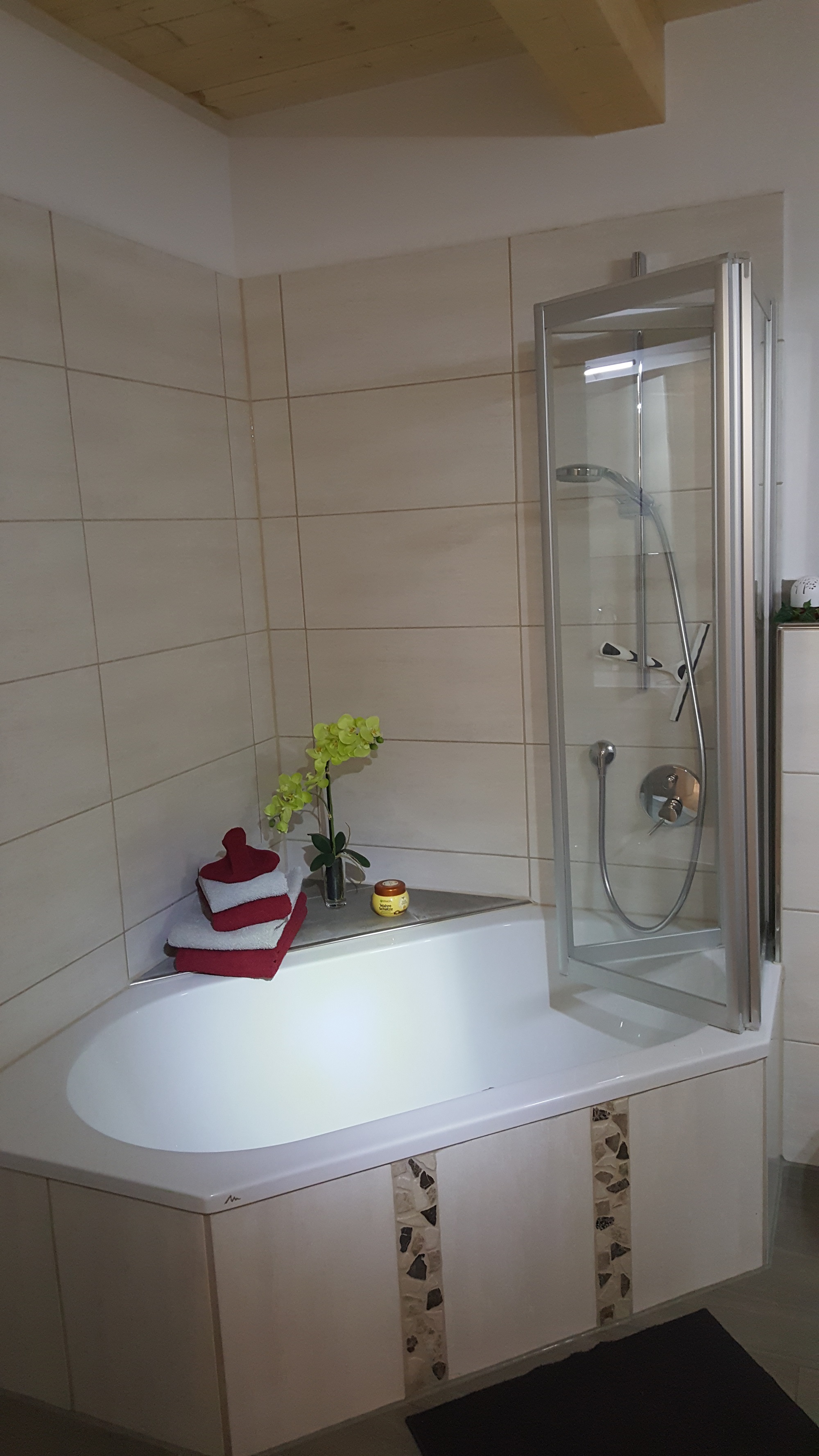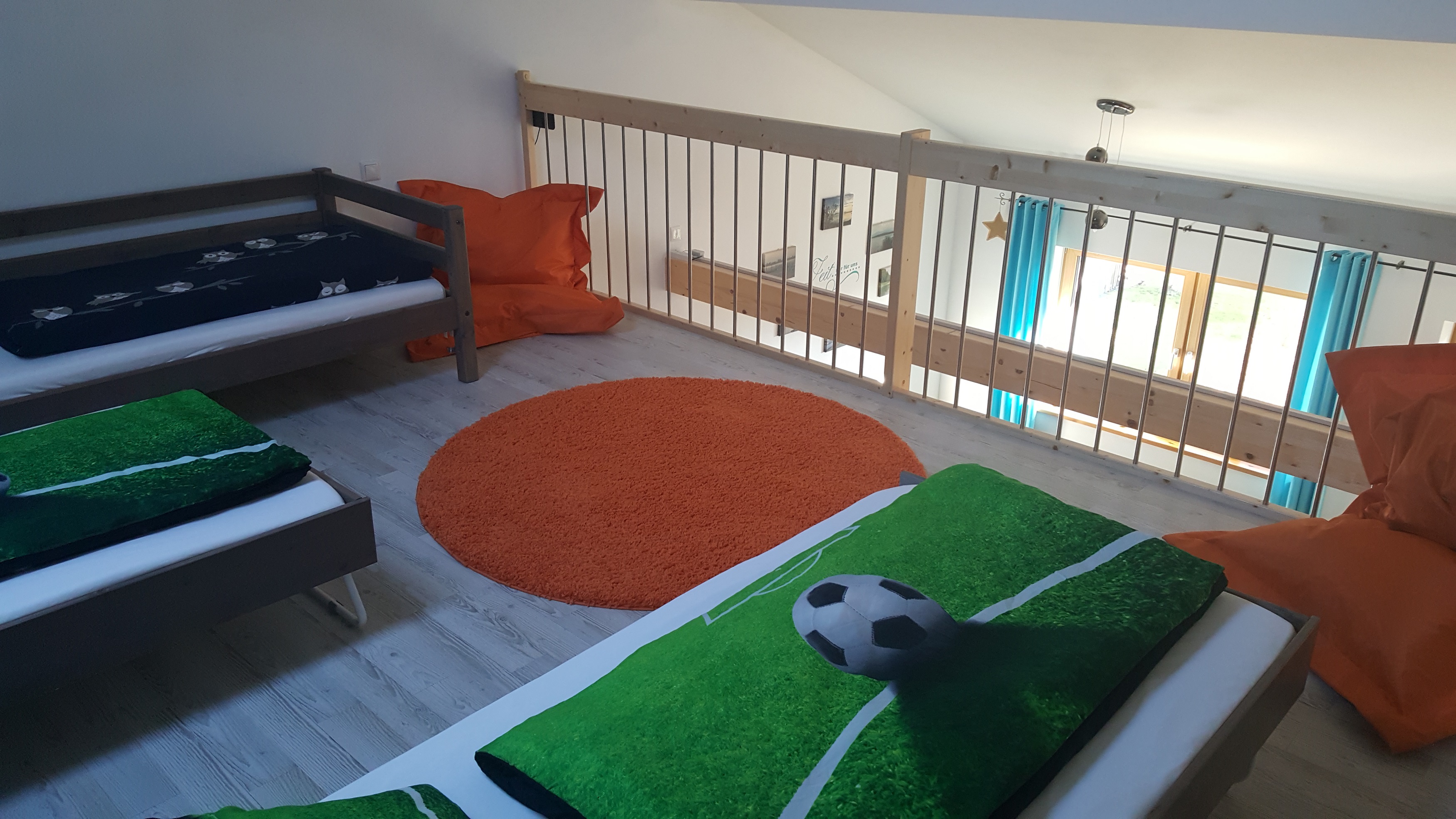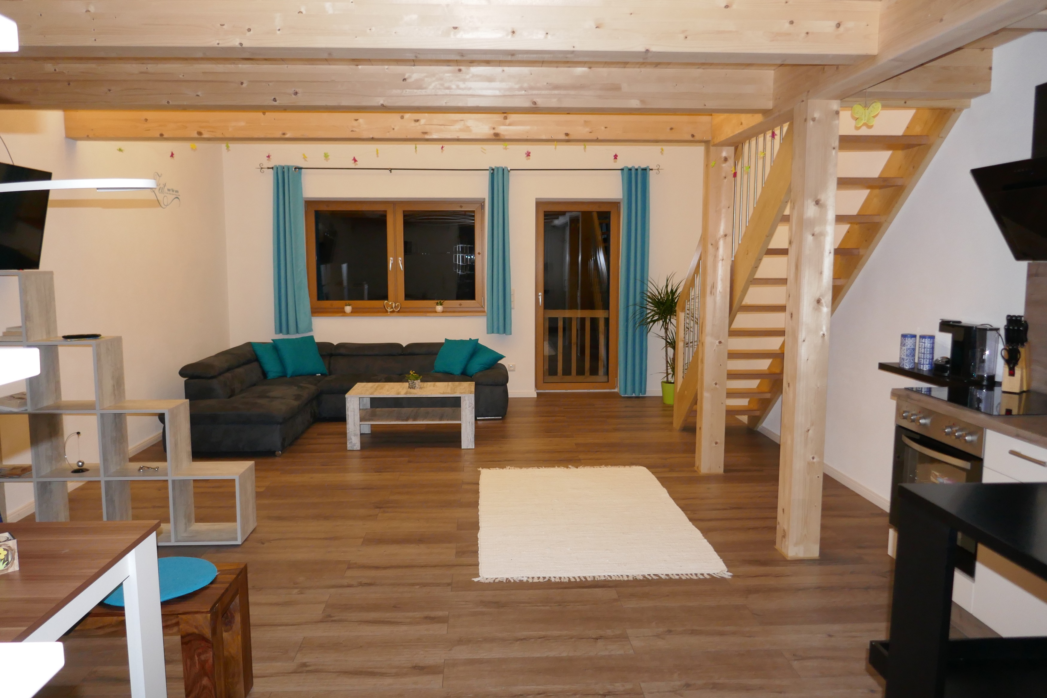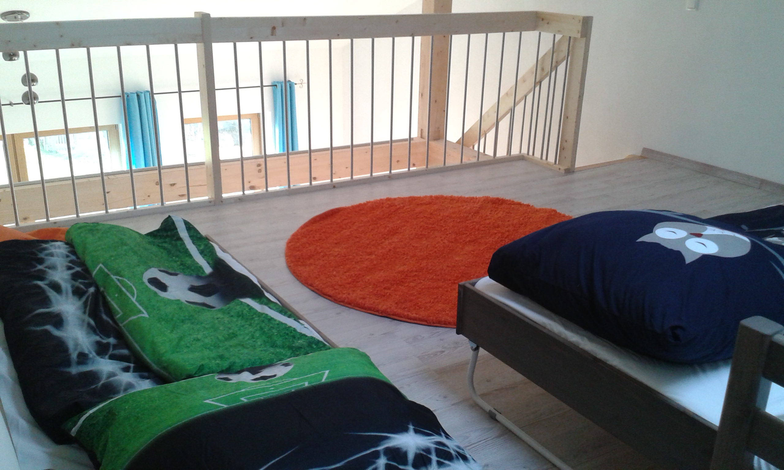 Unsere liebevoll und modern eingerichtete Ferienwohnung ChiemseeZeit ist im ersten Stock und bietet auf 90qm Platz für 2 bis 8 Personen, die auch alle auf dem geräumigen Balkon Platz finden :) Im Schlafzimmer schlafen sie im 180x200cm großem Doppelbett auf hochwertigen Kaltschaummatratzen. Das Kinderzimmer auf der offenen Galerie hat 4 Betten, (2 mit 90x200cm + 2 mit 90*190cm), in denen auch 4 Erwachsene schlafen können. In unserem individuell gestalteten Bad/WC finden Sie eine große Eckbadewanne mit Echtglas Duschwand vor. In der Küche ist neben den üblichen E-Geräten eine Senseo Switch Kaffeemaschine für Pad und Filter. Sitzen können Sie entweder an der Theke, am großen Esstisch mit Massivholzbänken, ganz gemütlich auf der großen Eckcouch aus Luxus-Microfaser, oder auf unserem großen Lärchenholz Balkon. Dort haben Sie auch Ihre Kids beim Spielen auf der Wiese im Blick, und können so ganz entspannt den Tag mit Blick auf Berge und See ausklingen lassen. Wir haben hochwertige Laminat- und Fliesenböden verlegt, so dass auch die Allergiker unter Ihnen gut durchschnaufen können. Natürlich sind Handtücher, Bettwäsche parken und WLAN kostenlos.
