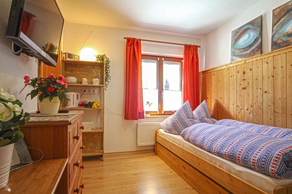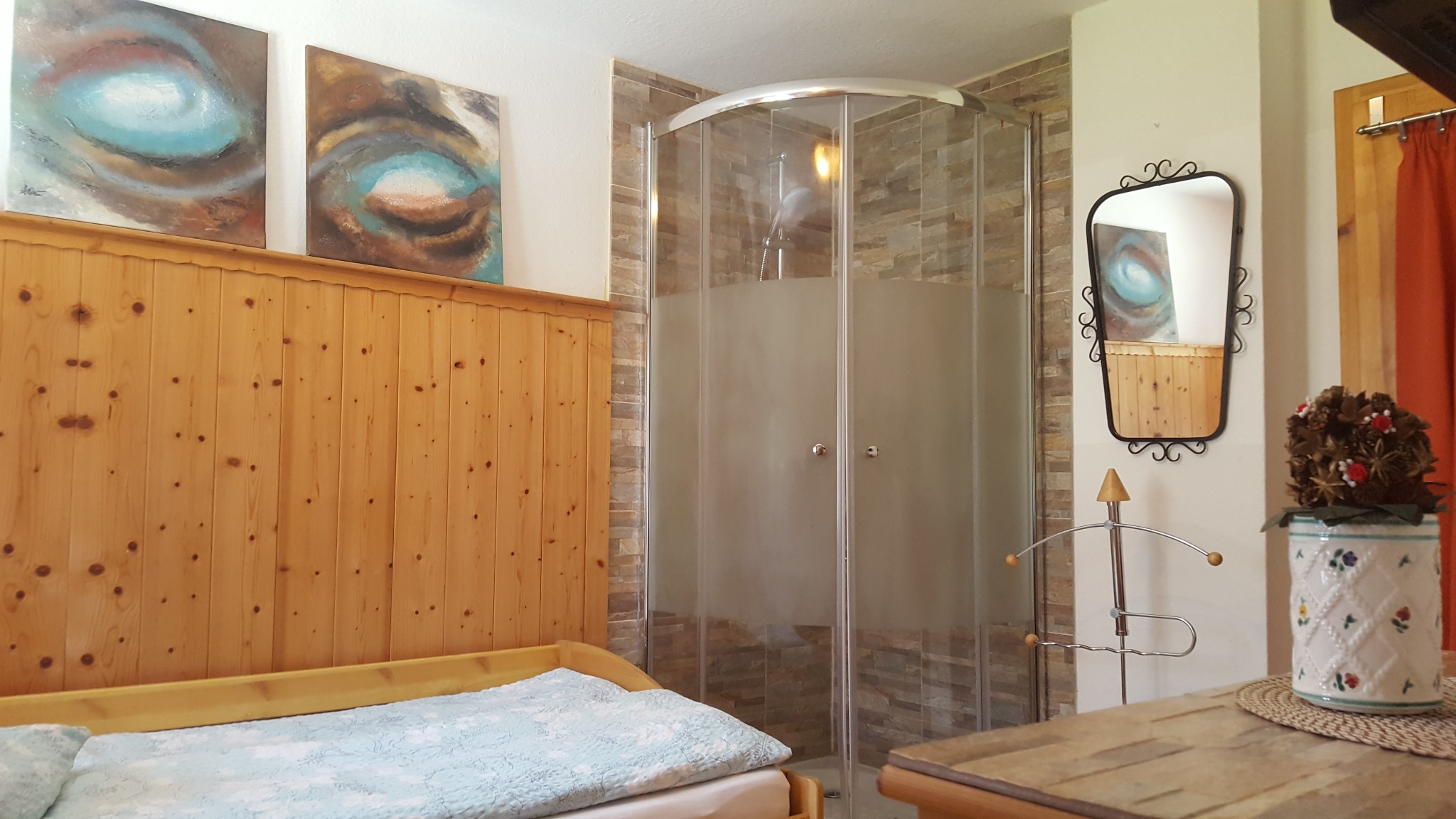 Klein aber fein! Die 12 m² des »Bergsteigerkammerls« bieten alles für einen angenehmen Aufenthalt: Ein Einzelbett (90×200 cm), Dusche, Bad mit WC, SAT-TV, WLAN, Wasserkocher, Kaffeemaschine, Tisch mit Stuhl und eine zugehörige Sitzmöglichkeit auf der Terrasse im Erdgeschoss mit Morgensonne und Bergblick. Dieses kleine Appartment lässt sich auch wunderbar als drittes autarkes Schlafzimmer zu unserer Fewos Jenner und Grünstein dazubuchen.