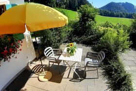 Eigene, möblierte Sonnenterrasse nach Osten mit Bergblick; zusätzlich große Wiese mit Freisitz und Kampenwandblick vor dem Haus zur Gemeinschaftsnutzung. Bettwäsche und Handtücher vorhanden. Ein Hund darf gegen Aufpreis gerne mitgebracht werden.