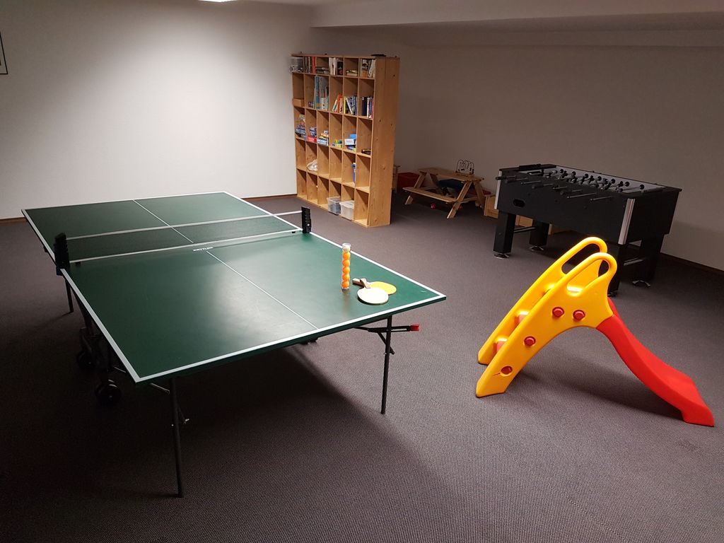 Ein gepflegter Gemeinschaftsgarten mit Holzliegen, Freisitz, Grillplatz und offener Feuerstelle lädt zum Entspannen und geselligen Beisammensein ein. Im Kellergeschoss stehen den Gästen eine Sauna, eine Münz-Waschmaschine und ein Münz-Trockner zur Verfügung. Darüber hinaus gibt es einen Abstellraum, einen Trockenraum mit Skiraum sowie einen gemütlichen Aufenthaltsraum mit Tischtennisplatte, Kicker, Spielecke und Sitzgelegenheiten. WLAN und ausreichend Parkplätze sind kostenfrei nutzbar.