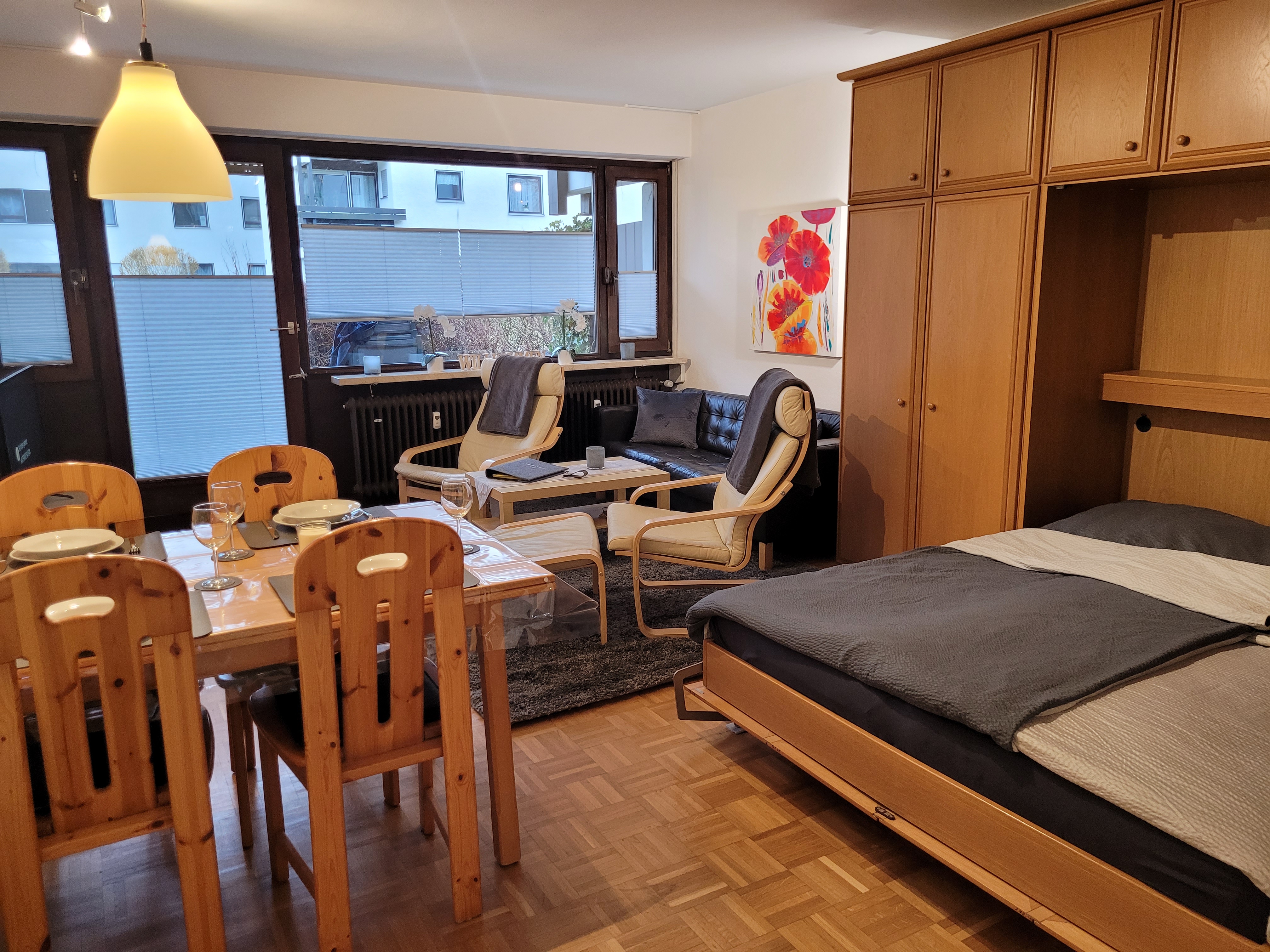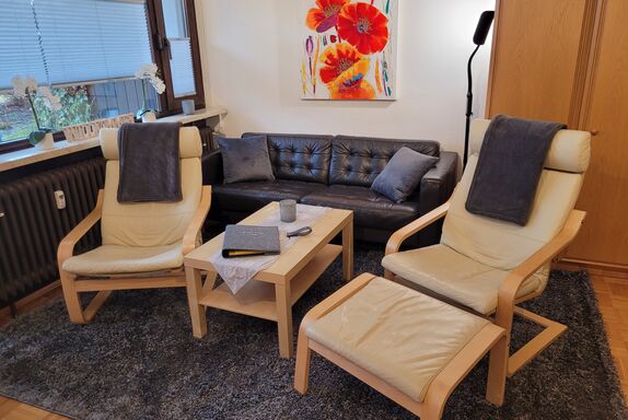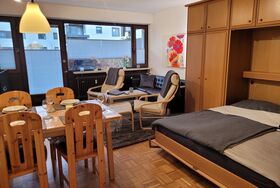 Im Keller befindet sich eine Waschmaschine (gegen Gebühr).Zur Wohnung gehört eine Sonnenterrasse mit großer Bank, Stühlen, Tisch und Sonnenschirm.