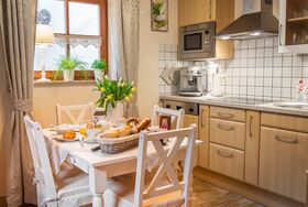 Die helle, gemütliche und geschmackvoll eingerichtete Wohnung betritt man direkt über die komplett ausgestattete Küche. Hier finden Sie eine Einbauküche mit Backofen, Mikrowelle, Ceran-Kochfeld mit Dunstabzug, Kühl-/Gefrierschrank und Geschirrspüler. In der Küche lädt eine kleine Sitzgruppe zum Frühstücken oder Essen ein. Kaffeemaschine, Kaffee-Vollautomat, Wasserkocher, Toaster und Handrührgerät runden die Ausstattung ab. Von der Küche geht es in das großzügige Wohnzimmer mit Schlafcouch, separater Leseecke und einem kleinen Schreibtisch. Damit keine Langeweile aufkommt, sind Bücher, Gessellschaftsspiele, ein Flachbildfernseher, ein DVD-Player sowie eine Stereoanlage vorhanden. Durch die drei Fenster des Wohnzimmers hat man einen Blick auf die zur Wohnung gehörige Terrasse. Das angrenzende Schlafzimmer mit großem Doppelbett ist zum Wohnzimmer teilweise offen, kann aber durch einen Vorhang abgetrennt werden. Durch einen kleinen Flur betritt man das Bad mit Fenster, welches über eine Dusche verfügt. Fön, Handtücher und diverse Hygieneartikel sind vorhanden. Zur Wohnung gehört eine eigene Terrasse mit Sitzgruppe und Liege, welche ausschließlich zur Ferienwohnung gehört. Hier gibt es auch einen Gasgrill zur exklusiven Nutzung. Ebenfalls finden Sie hier ein kleines Gartenhaus, in welchem sich unter Anderem zwei Fahrräder befinden, die während des Aufenthaltes kostenlos von unseren Gästen genutzt werden können. Die Wohnung ist nur über Stufen erreichbar und deshalb nicht behindertengerecht.