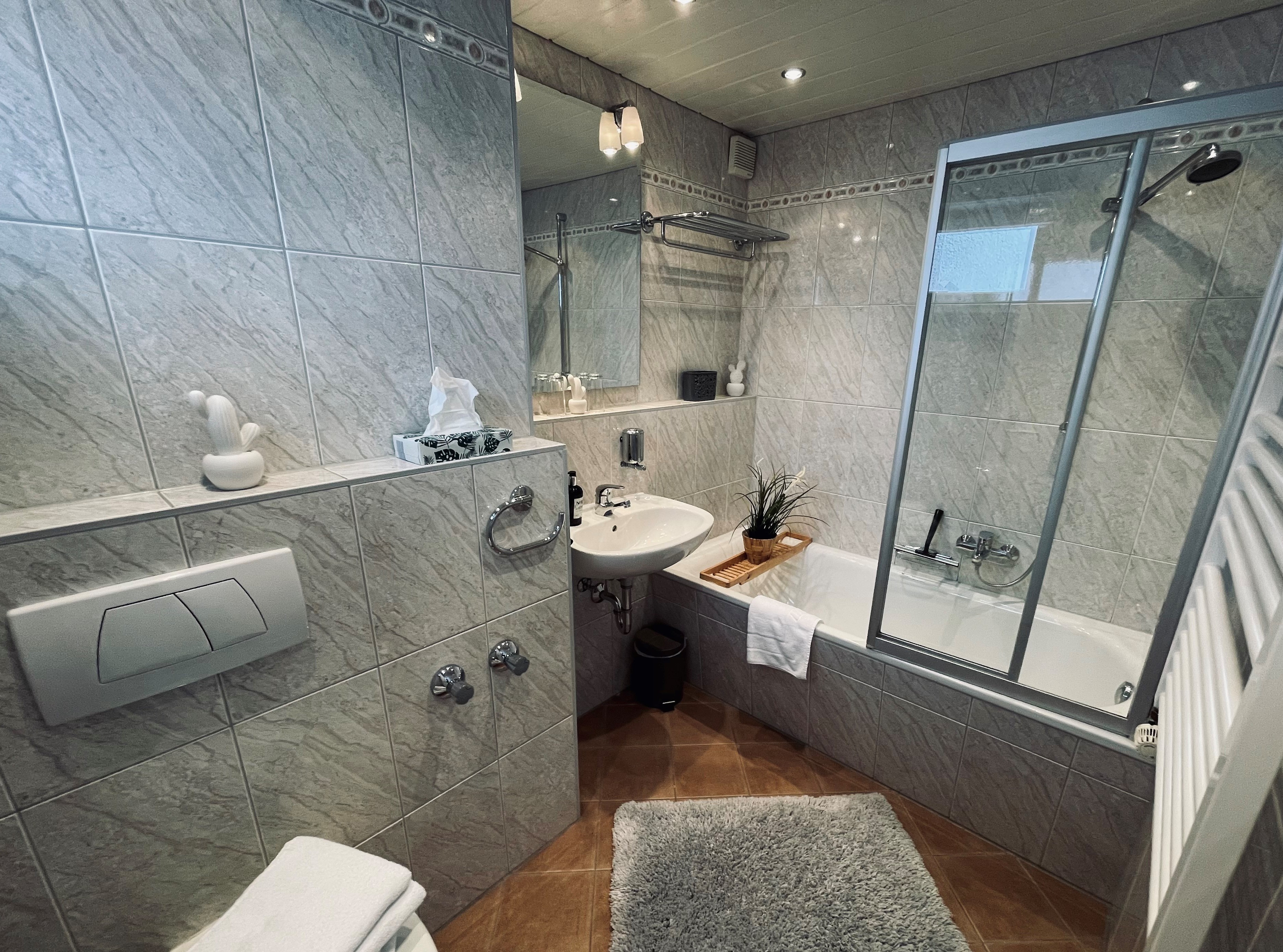 Die Ferienwohnung liegt im 1. Stock und bietet Platz auf 50 qm. Sie ist ausgestattet mit einem separaten Schlafzimmer, einem Schlaf- Wohnbereich mit Sitzgruppe, TV und Kochnische (2-Plattenherd, Kühlschrank, Tiefkühlfach, Kaffeemaschine, Wasserkocher uvm.), mit Essecke, Sitzgruppe, TV, WLAN, Stereoanlage und Zimmersafe.Im großen Bad mit Badewanne stehen Handtücher und Fön für Sie bereit. Der Balkon mit Balkonmöbel lädt zum Entspannen ein.