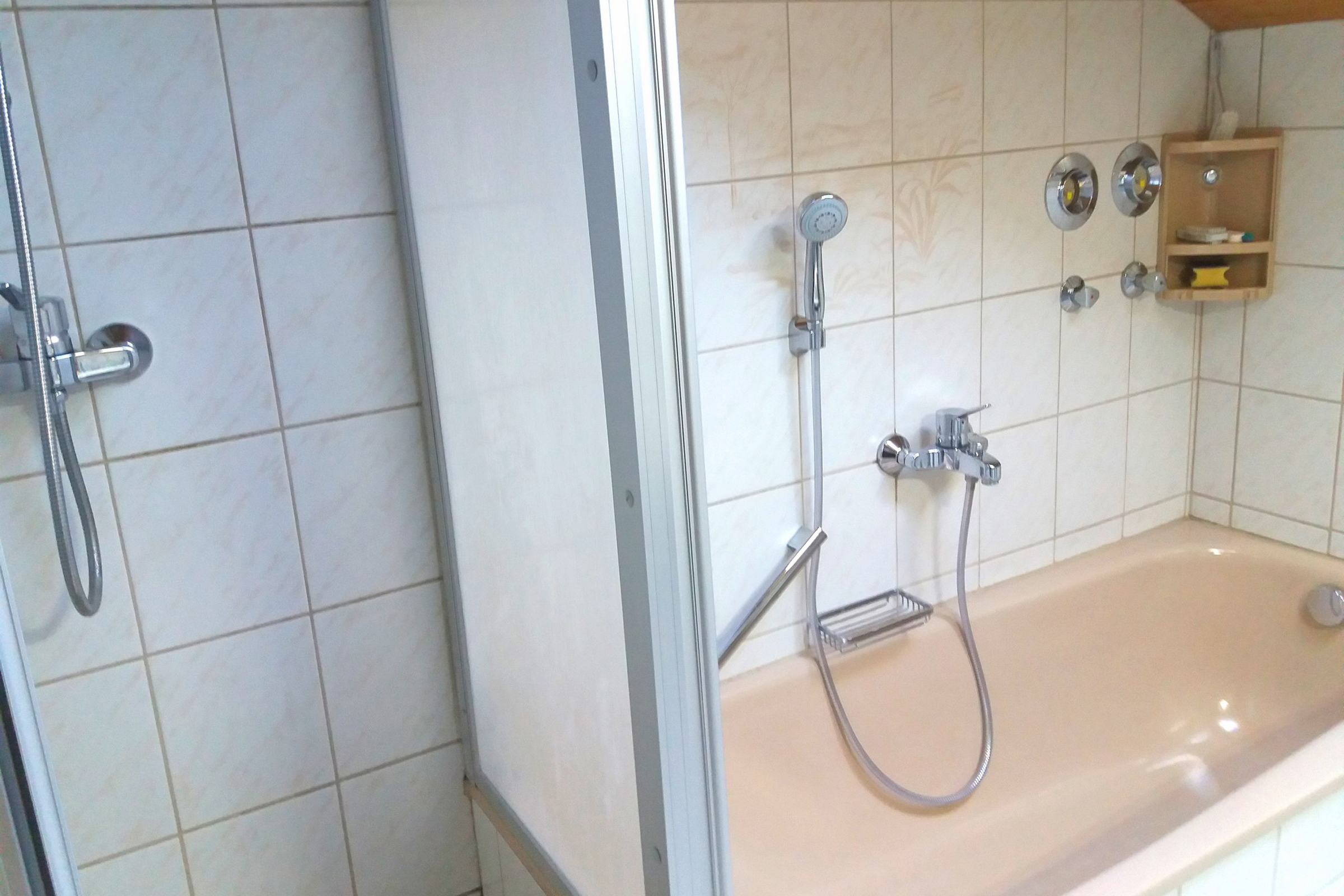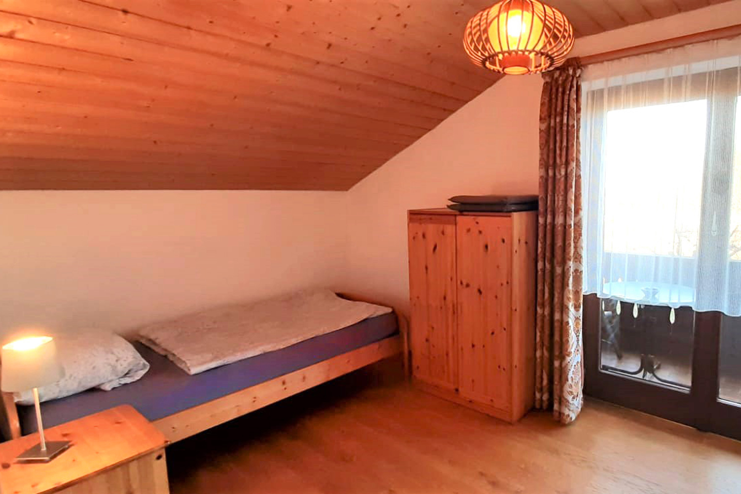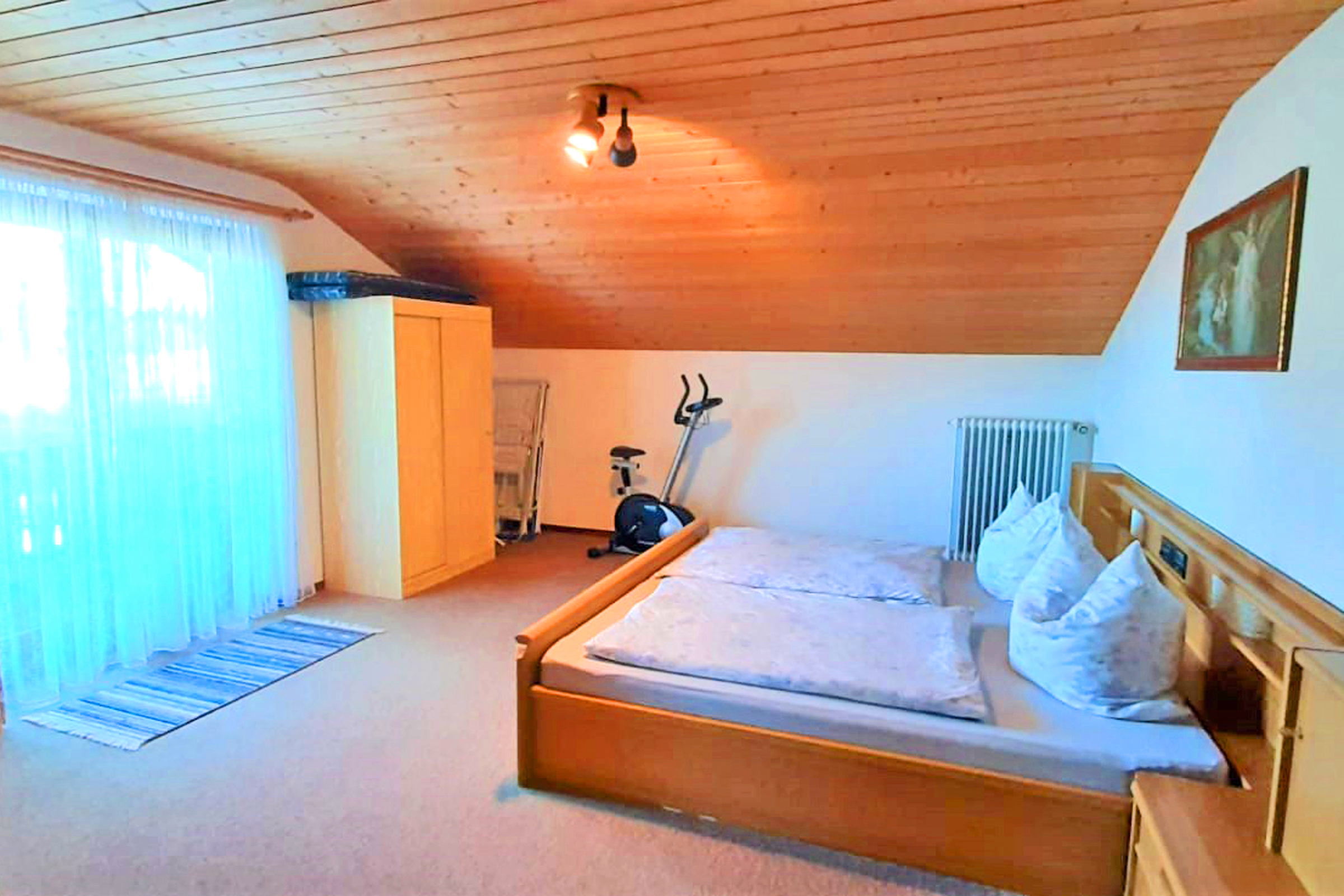 Helle Nichtraucher Ferienwohnung 105 qm mit Ost-Balkon und herrlichem Ausblick. Großes Wohnzimmer, Couchgarnitur zum gemütlichen fernsehen, kostenloses WLAN, SAT-TV und Sitzecke mit Tisch. Separate Küche (großer Kühlschrank mit 3 Gefrierfächer), Geschirrspüler, Mikrowelle, Herd, Eckbank mit großem Tisch zum Essen. Badezimmer mit Fußbodenheizung, Fön, Dusche und Badewanne. Separates WC. Ein Schlafzimmer mit Doppelbett und Balkon, ein Einzelzimmer (Parkettboden) mit Zugang zum gleichen Ost-Balkon und ein großes Kinderzimmer mit einem Einzelbett und einem Kinder-Hochbett (1,70 m lang) oder einem Babybett. Ein Gartenanteil mit Gartenmöbeln und die Liegewiese am Haus mit Grillplatz können gerne genutzt werden.