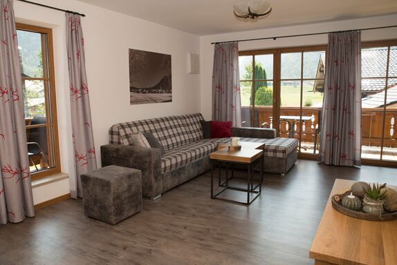 Dieses schöne Ferienwohunung für 4 Personen befindet sich im ersten Stock des Haus Im Moos. Die Wohnung ist geräumig und hell und aufgrund der vielen hölzernen Akzente zugleich gemütlich und warm. Vom Balkon an der Hinterseite der Wohnung haben Sie einen wunderschönen Blick auf die Berge. Die große Picknickbank hinter dem Haus dürfen Sie ebenfalls nutzen. Das Wohnzimmer verfügt über eine behagliche Sitzecke mit einer 3-Personen (Schlaf-) Couch, Sessel und Hocker. Es gibt ein Smart-TV und natürlich WLAN. In der vollständig ausgestatteten offenen Küche können Sie herrlich frühstücken und kochen. Die gemütliche Essecke besteht aus einem Esstisch, drei Stühlen und einer Sitzbank für drei Personen. Es gibt zwei Schlafzimmer; das erste Schlafzimmer hat ein Doppelbett und das zweite Schlafzimmer verfügt über zwei Einzelbetten. In beiden Räumen steht ein Schrank mit Fächern und Kleiderstange. Bei Ihrer Ankunft sind die Betten schon für Sie bezogen. Im Badezimmer finden Sie eine Dusche und ein Doppel Waschbecken und liegen Handtücher per Person bereit. Es gibt eine separate Toilette.