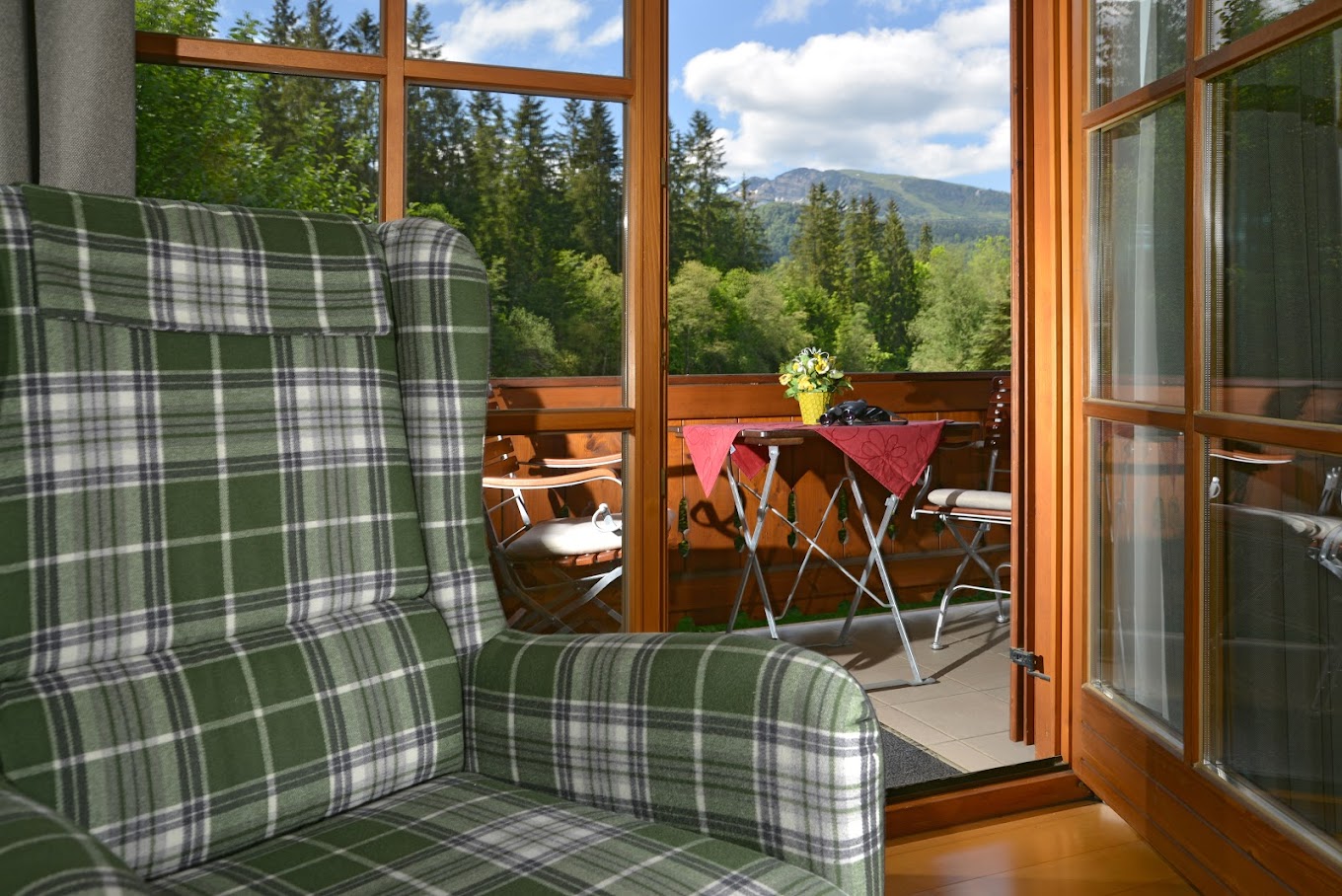 Genießen Sie die herrliche Sicht vom überdachten Balkon direkt auf den Unterberg und den Zahmen Kaiser. Sitzmöbel und Liegestühle warten hier auf Sie.