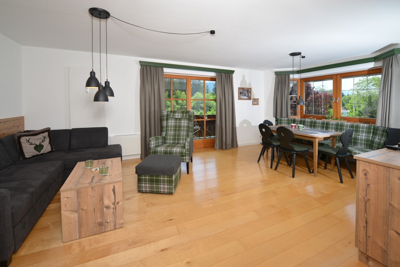 Am Waldbahnhof 2 c, 83242 Reit im Winkl, sehr ruhig im Ortsteil Groißenbach, direkt an der Lofer mit Blick auf den Unterberg und den Zahmen Kaiser liegt Ihr komplett frisch renoviertes Urlaubsdomizil. Der Einstieg zur Langlaufloipe sowie der Penny Markt sind nur rund 200 Meter entfernt. Die Talstation Seegatterl zum Ski- und Wandergebiet Winklmoosalm, erreichen Sie mit Auto oder Bus (Haltestelle direkt vor der Tür) in knapp 3 Kilometern Entfernung. Zum Ortszentrum mit seiner großen Auswahl an Speiselokalen, Cafés und Shopping Möglichkeiten sind es zu Fuß nur rund 10 Minuten. Das Freibad ist ebenfalls wie viele weitere touristische Einrichtungen in wenigen Gehminuten erreichbar. Sowohl im Sommer, als auch im Winter ist der zur Wohnung gehörende und im Preis enthaltene großzügige Tiefgaragenstellplatz mit direktem Anschluss ans Haus eine Annehmlichkeit die man nicht missen möchte. Auf dem Weg von Ihrem Auto zum Apartment im 1. OG kommen Sie auch direkt an Ihrem eigenen Kellerabteil vorbei, welches neben einem Skiständer auch über einen Schuhtrockner, eine Garderobe und Sitzbänke verfügt. Ihre Ski- und Wanderausrüstung ist hier sicher untergebracht. Das Apartment „Alpenhip“ im 1. OG bietet Platz für max. 4 Personen und weißt alle Annehmlichkeiten für einen rundum erholsamen Urlaub auf. Vollausgestattet und mit ca. 82 qm Gesamtfläche ist es Ihr optimales Basislager in den bayerischen Bergen. Sollten Sie auch im Urlaub auf die Nutzung Ihrer elektronischen Helfer und Begleiter angewiesen sein, steht Ihnen hierfür das leistungsstarke W-LAN im Apartment zur Verfügung.