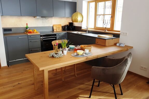 Die Ferienwohnung Kaiserwinkl liegt im Erdgeschoss und verfügt über eine Terrasse mit direktem Gartenzugang. Sie ist nach Süden ausgerichtet - mit Panoramablick auf das Kaisergebirge. Die Wohnung ist 70 qm groß und verfügt über ein Wohnzimmer mit Wohnküche und ein Schlafzimmer mit Boxspringbetten - perfekt für 2 Personen. Die Wohnung ist sehr hochwertig mit Vollholzparkett, Fußbodenheizung, Markenküche mit Spülmaschine und Backofen, großzügigem Wohnzimmer, 2 großen Flachbildschirmen, High-Speed-Internet, Walk-In-Regendusche ausgestattet.