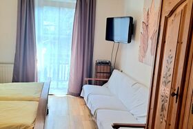 ein gemütliches Schlafzimmer mit Doppelbett und Couch, TV 2. Schlafzimmer mit 2 Einzelbetten und ein Waschbecken Küche mit einer Kochnische und eine Sitzecke Sanitärraum mit Dusche und WC
