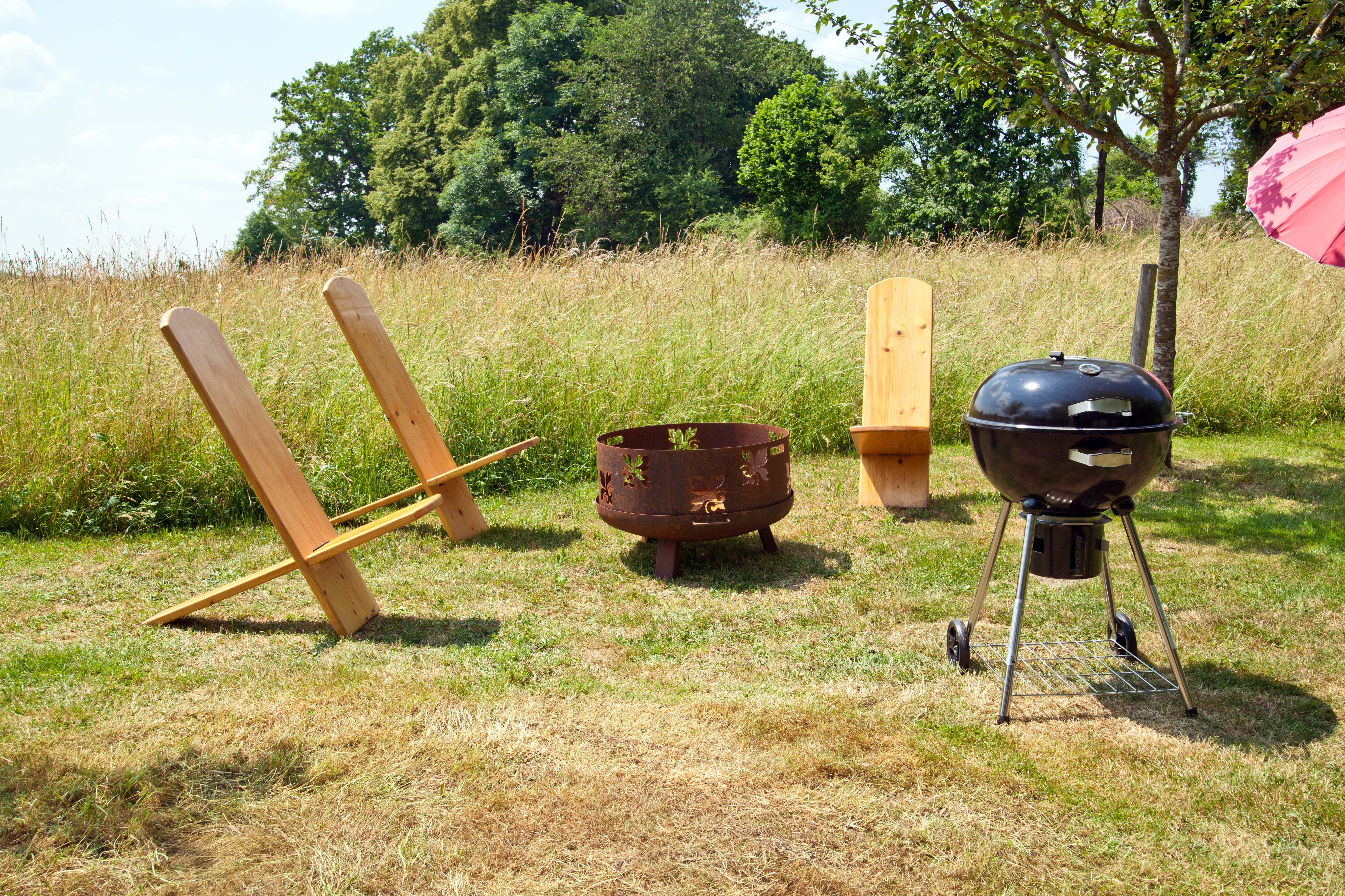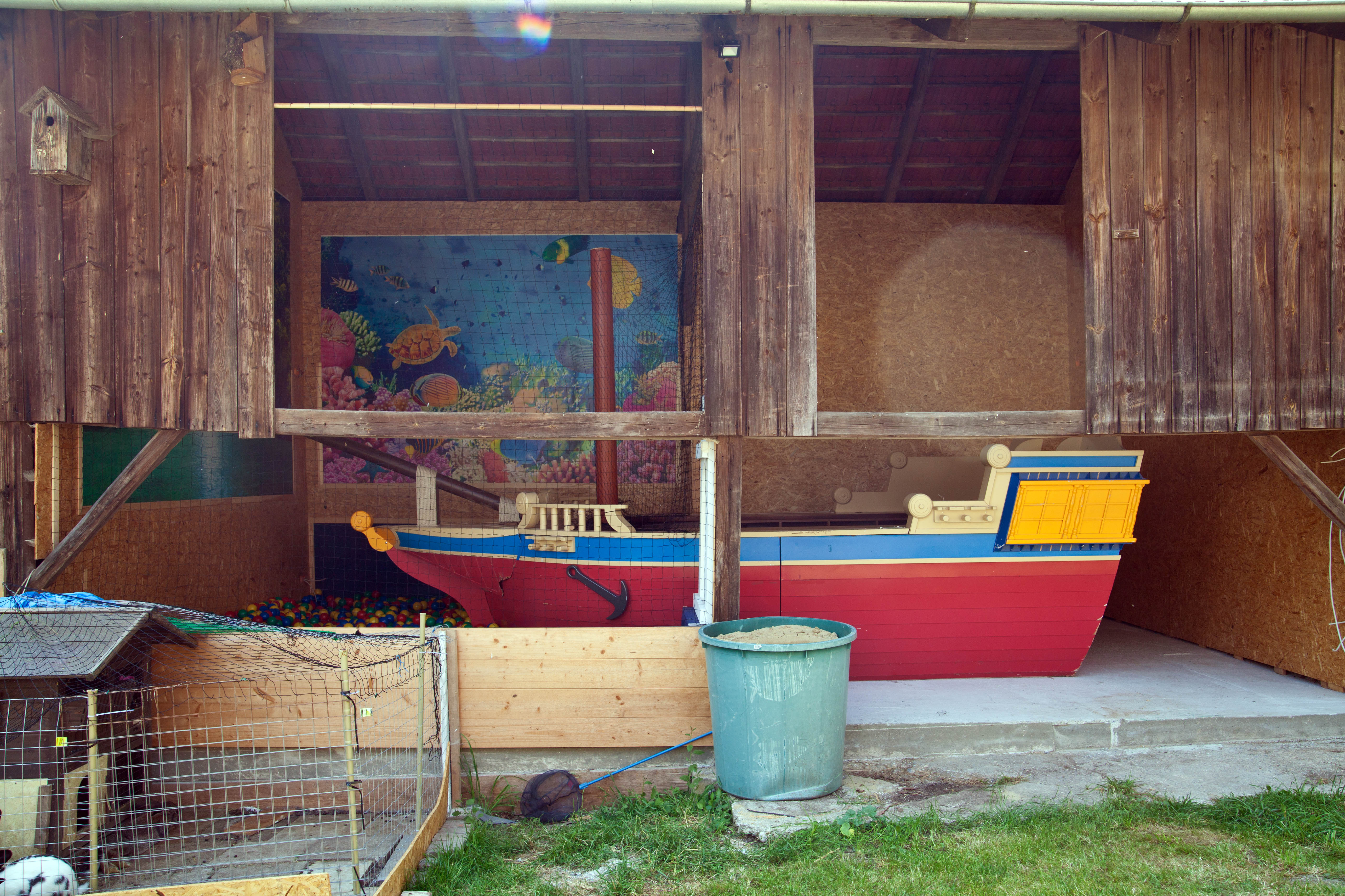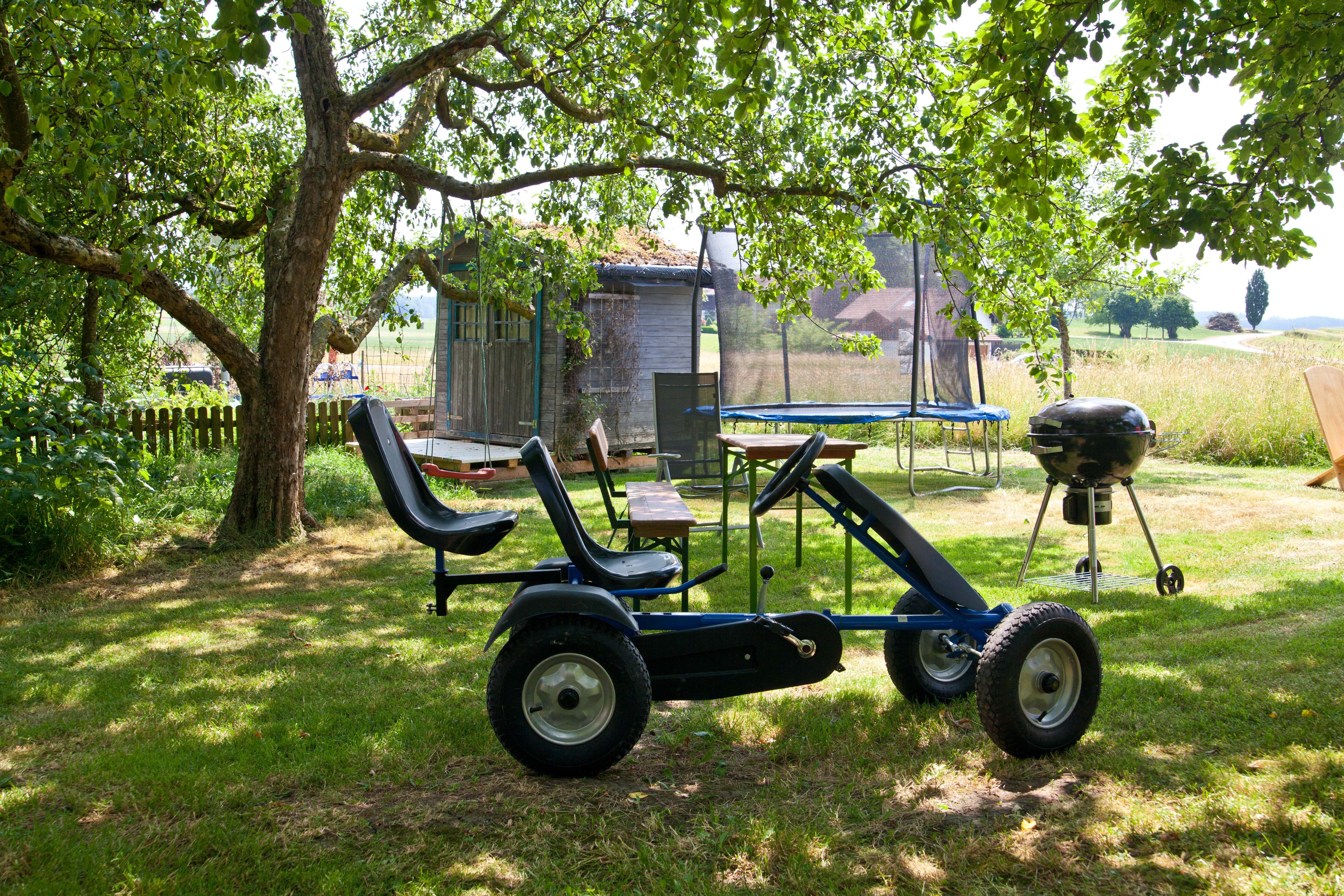 Blick in die Berge, den Obstanger und den Gästegarten mit Spielplatz .