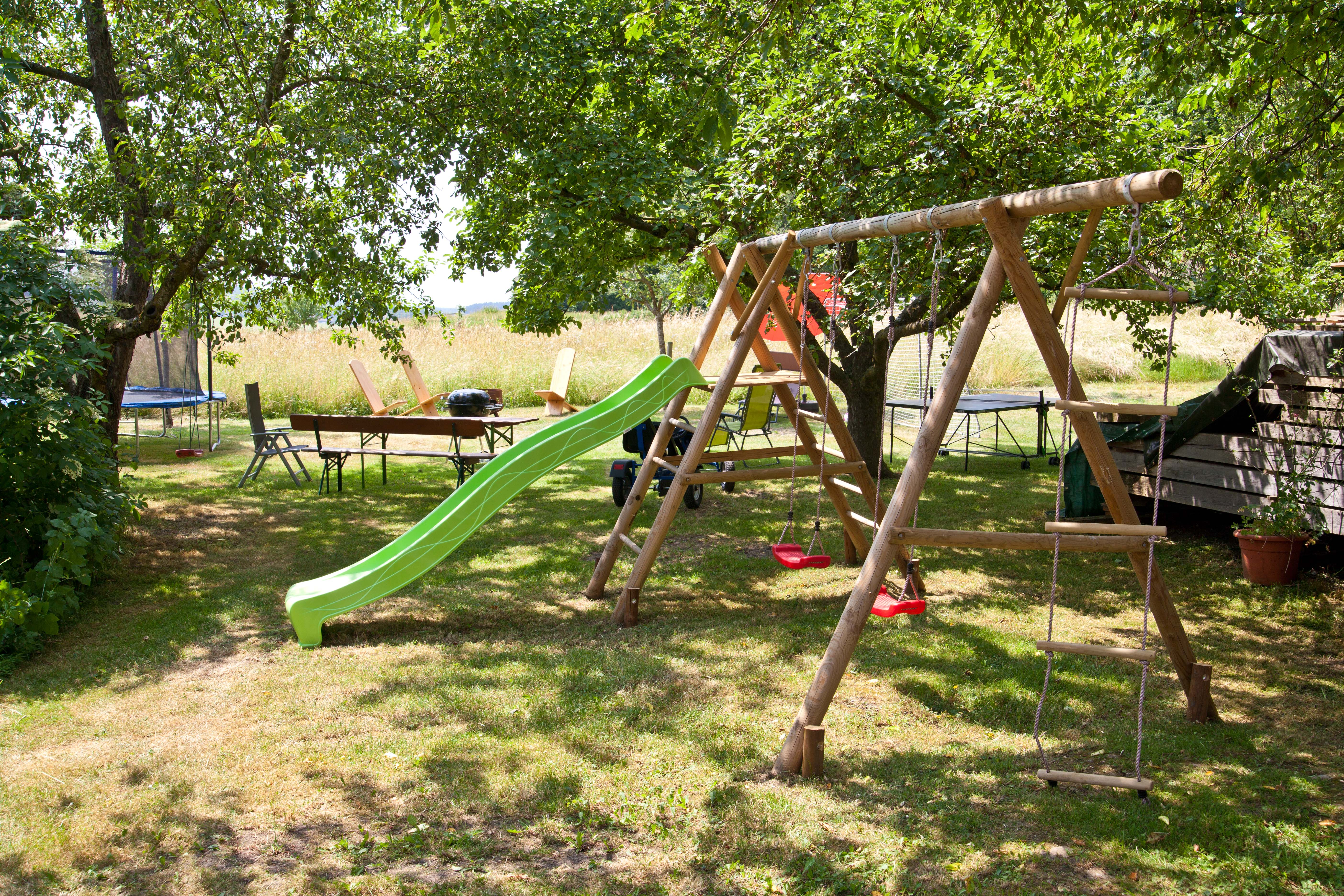 Von den 2 Balkonen aus, haben Sie einen herrlichen Blick in den Obstanger und den Gästegarten mit Spielplatz.