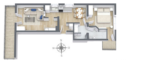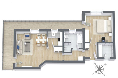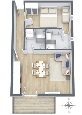 Diese Ferienwohnung mit 40m² bietet Platz für 2 Personen. Die Wohnung verfügt über ein Wohn-/Esszimmer (Essecke und gemütlicher Couchgarnitur) und ein separates Schlafzimmer mit Doppelbett. Zwei getrennte Badezimmer, Balkon, Kabel-TV, Telefon und Radiowecker gehören ebenfalls zur Ausstattung dieser Wohnung.