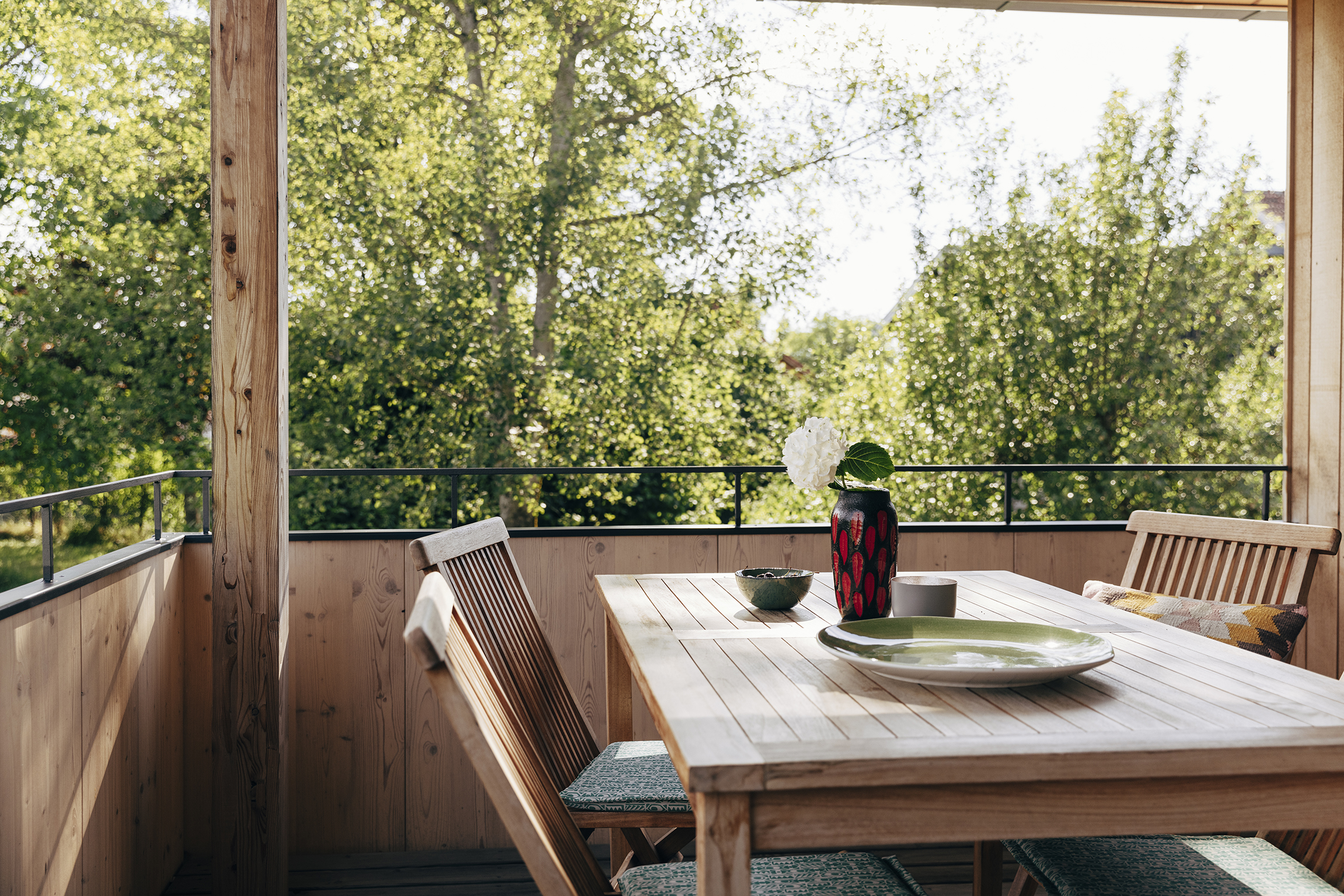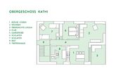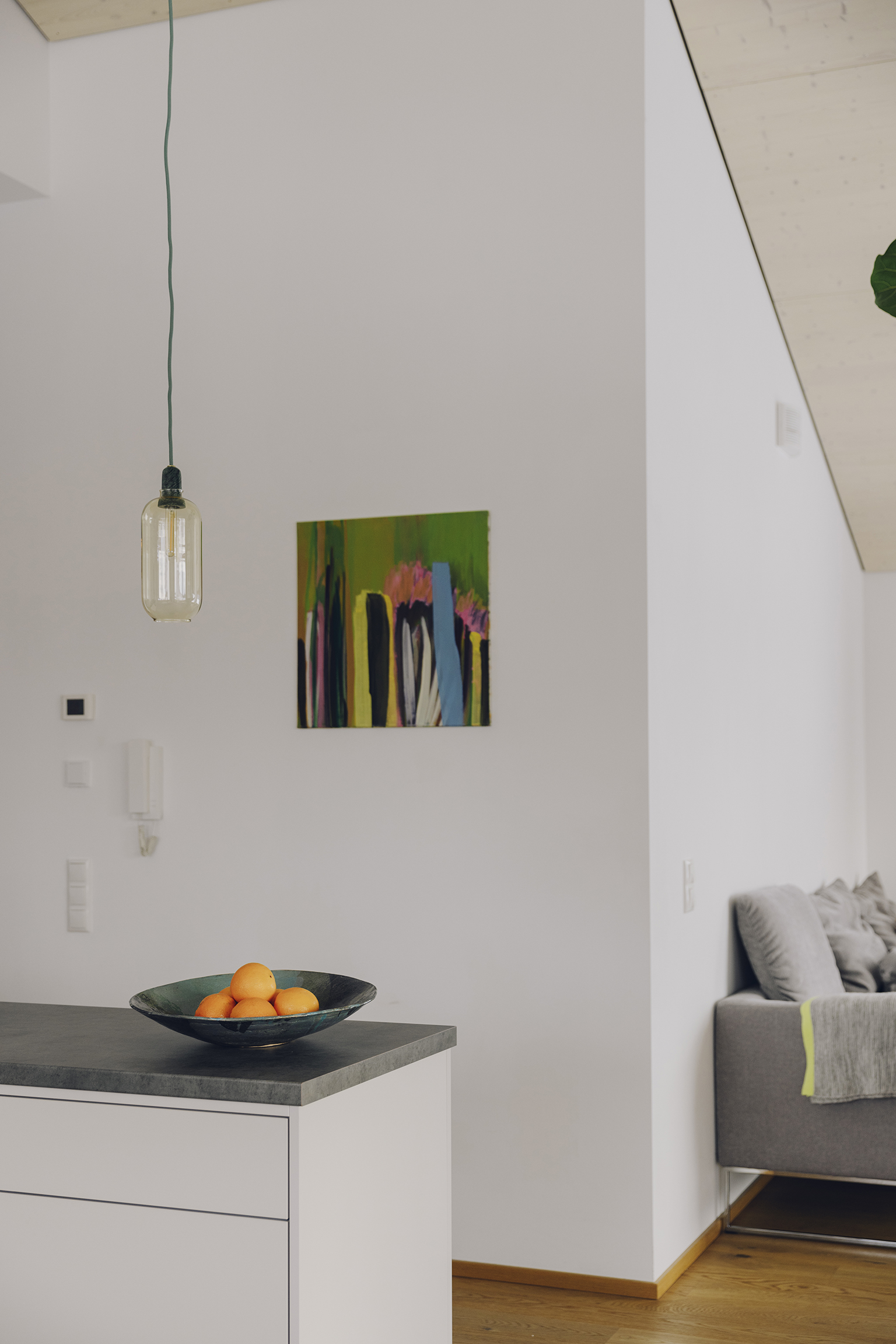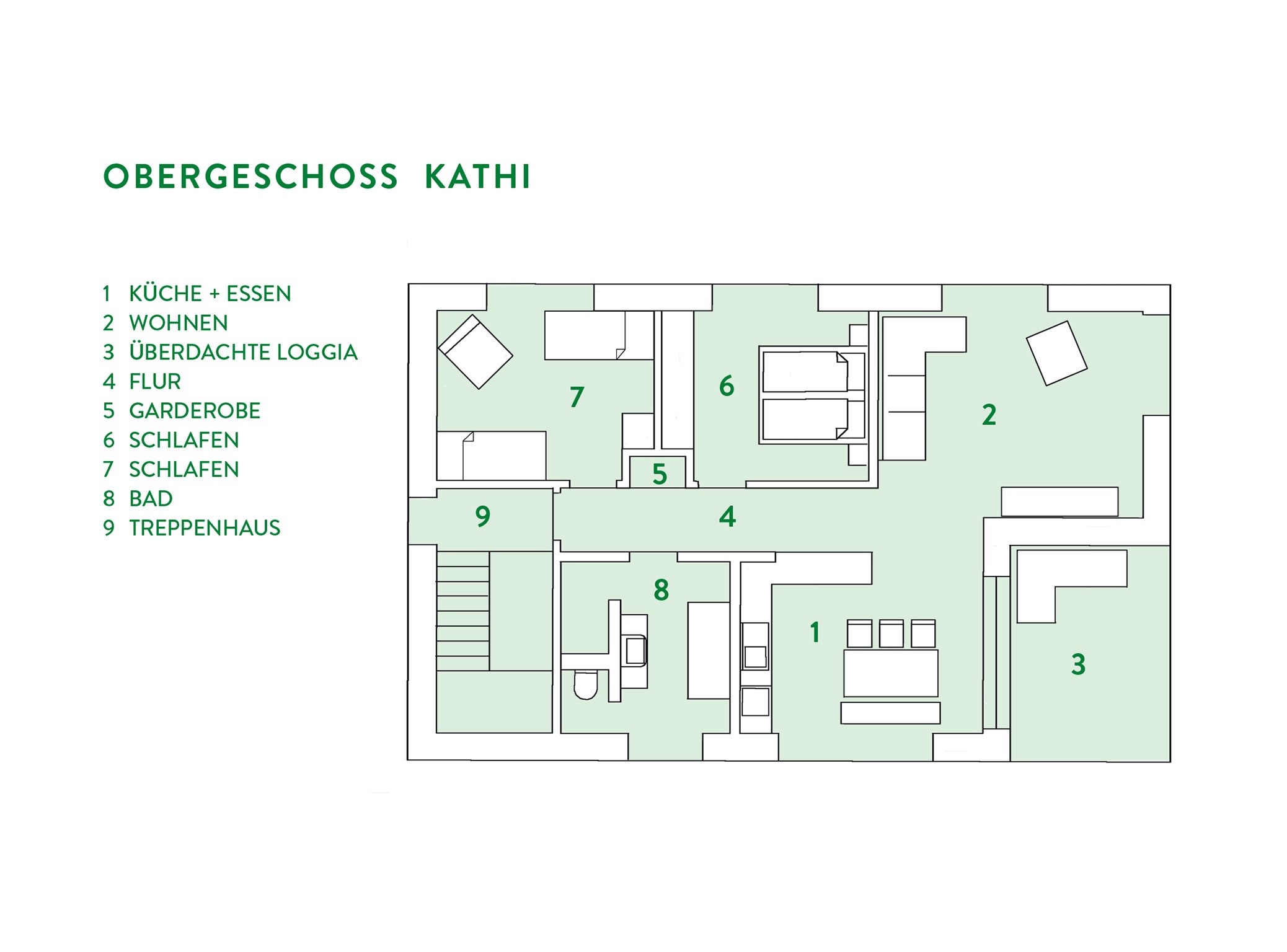 Die Ferienwohnung KATHI im Obergeschoss besticht durch ihre Raumhöhe von bis zu 4 m. Sie bietet viel Privatsphäre und Geborgenheit. Beim Blick aus dem Küchenfenster in die Kronen hoher Bäume fühlt man sich beinahe wie in einem Baumhaus. Das Wohnzimmer mit exklusiver Sofalandschaft, dänischem Sideboard und Lounge-Chair besitzt zudem ein Panoramafenster mit integrierter Sitzbank und Bergblick. Von der maßgefertigten Schreinerküche mit gemütlichem Essplatz hat man Zugang auf die große, überdachte Loggia mit Frühstücks-Sitzplatz und Lounge-Sofa für den Drink zum Sonnenuntergang. Die beiden Schlafzimmer sind mit hochwertigen Betten ausgestattet. Das Elternschlafzimmer mit einem Boxspringbett (180 x 200cm), das Kinderzimmer mit zwei Einzelbetten (90 x 200cm). Das großzügige Tageslichtbad verfügt über Regendusche, WC-Nische, Badewanne und hochwertigen Accessoires.
