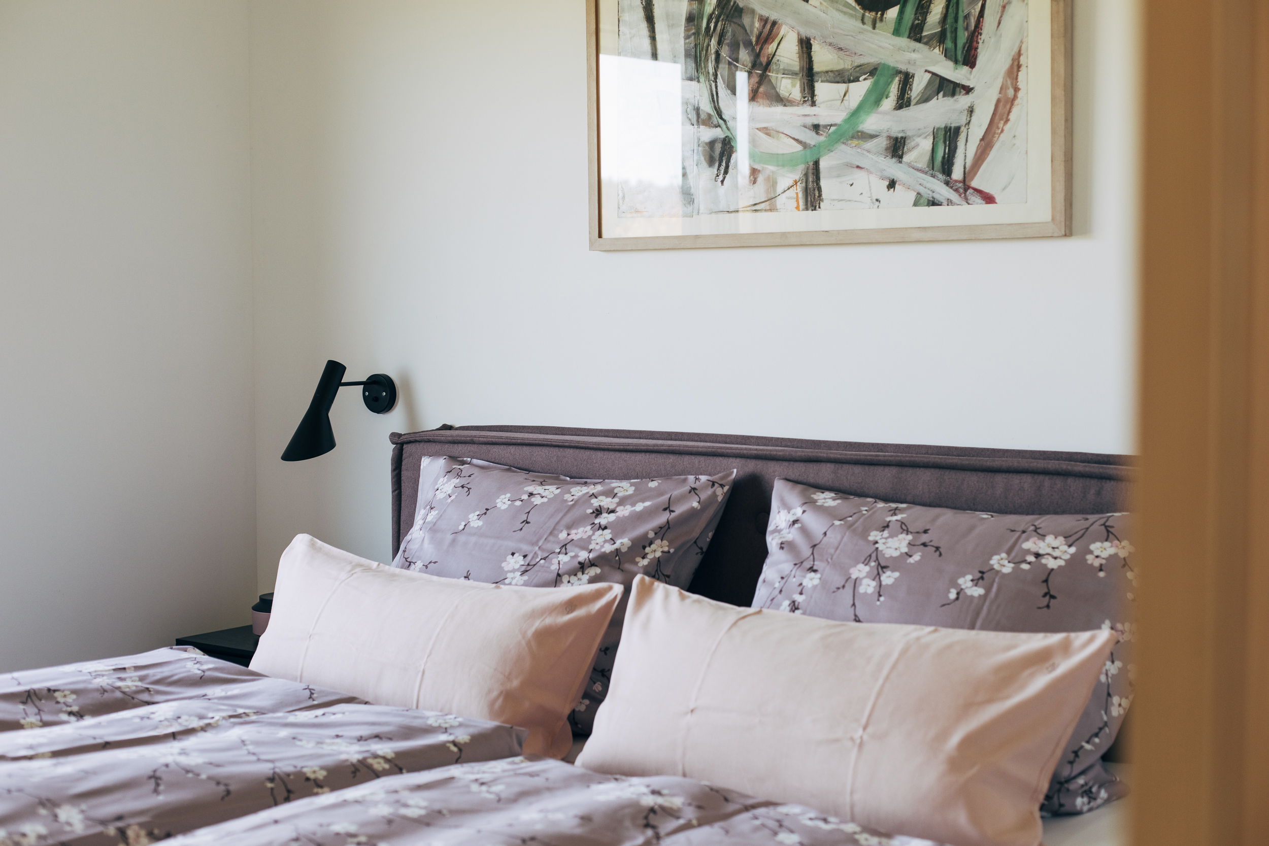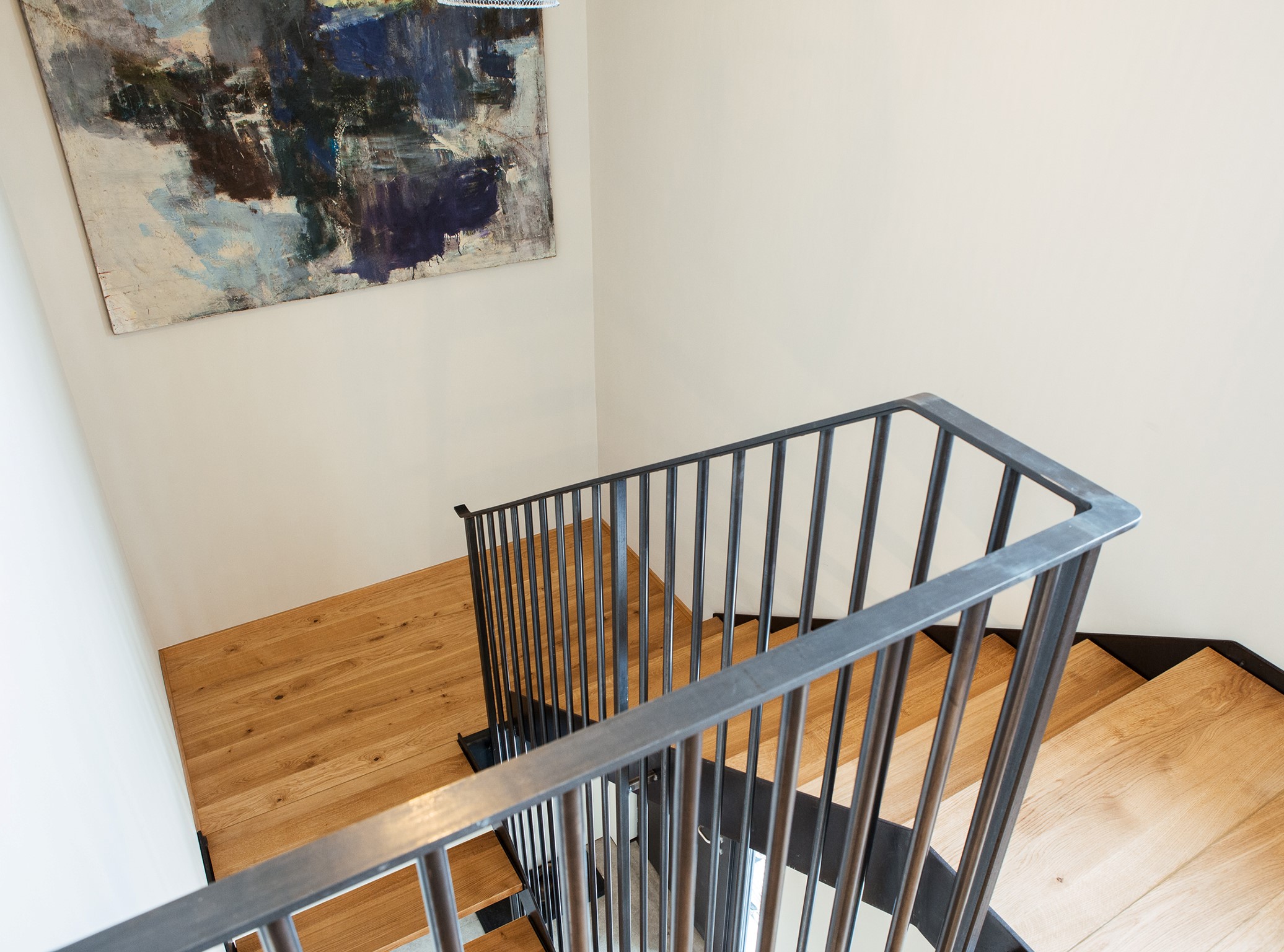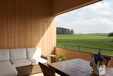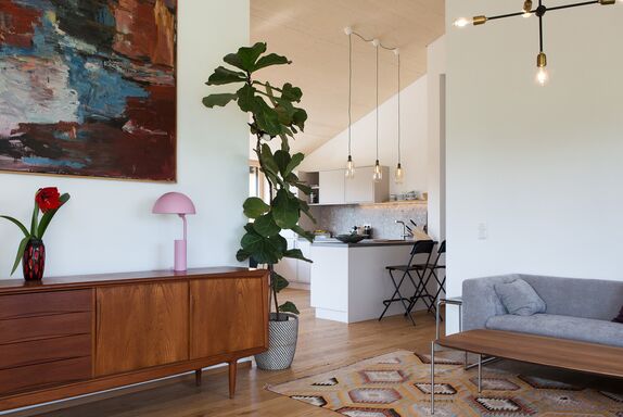 Die Ferienwohnung KATHI im Obergeschoss besticht durch ihre Raumhöhe von bis zu 4 m. Sie bietet viel Privatsphäre und Geborgenheit. Beim Blick aus dem Küchenfenster in die Kronen hoher Bäume fühlt man sich beinahe wie in einem Baumhaus. Das Wohnzimmer mit exklusiver Sofalandschaft, dänischem Sideboard und Lounge-Chair besitzt zudem ein Panoramafenster mit integrierter Sitzbank und Bergblick. Von der maßgefertigten Schreinerküche mit gemütlichem Essplatz hat man Zugang auf die große, überdachte Loggia mit Frühstücks-Sitzplatz und Lounge-Sofa für den Drink zum Sonnenuntergang. Die beiden Schlafzimmer sind mit hochwertigen Betten ausgestattet. Das Elternschlafzimmer mit einem Boxspringbett (180 x 200cm), das Kinderzimmer mit zwei Einzelbetten (90 x 200cm). Das großzügige Tageslichtbad verfügt über Regendusche, WC-Nische, Badewanne und hochwertigen Accessoires.