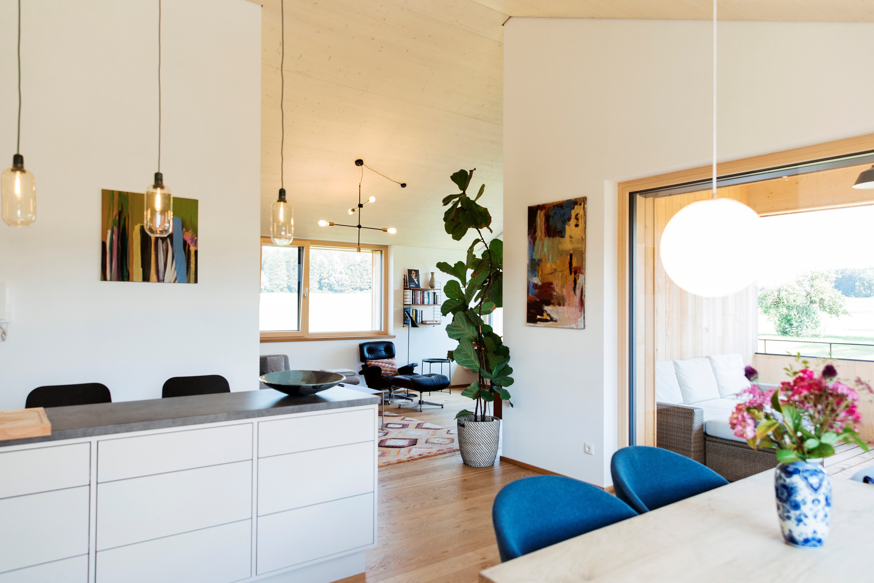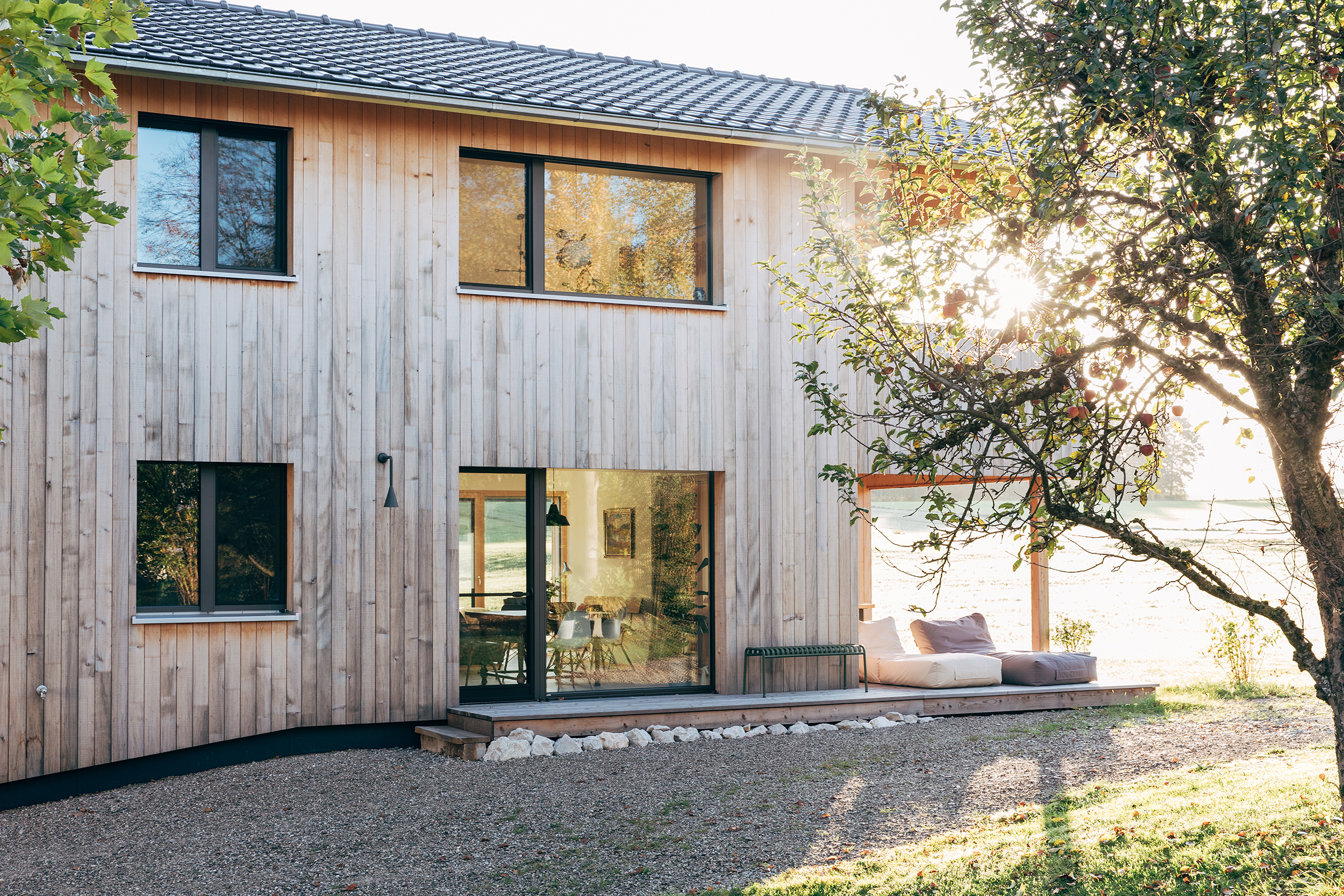 Das Ferienhaus Schmidhuber liegt neben dem historischen Schmidhuberhof in einem Obstanger am Ortsrand von Tabing. Das moderne Holz-Passivhaus wurde 2019 fertig gestellt und beherbergt zwei außergewöhnliche Ferienwohnungen. Jede Wohnung verfügt über einen offenen Wohnbereich mit großer Küche und Essplatz, zwei Schlafzimmer sowie ein Bad mit Regendusche und Badewanne. Die Wohnungen haben nach Süd/West ausgerichtete Loggien. In der EG-Wohnung MAX gibt es eine weitere nach Osten gelegene Frühstücksterrasse. Die Wohnung KATHI im OG besticht durch ihre Raumhöhe und den traumhaften Blick. Alle Räume verfügen über Fußbodenheizung in Kombination mit kontrollierter Wohnraumlüftung, elektrischen Außenjalousien und Mückenschutz. Der weitläufige Garten mit Wiese zum Austoben, Riesentrampolin, Tischtennis, Grillplatz, Hängematte, Naturteich und Kräutergarten steht allen Gästen zur Verfügung. Ruhe, Natur, schöne Architektur und der Chiemsee um die Ecke machen diesen Ort zum idealen Urlaubsziel für Paare und Familien.Inklusive: W-Lan, Parkplatz mit E-Ladesäule, Bettwäsche, Handtücher, Endreinigung, Soundbox, Nutzung von Waschmaschine, Trockner uvm.