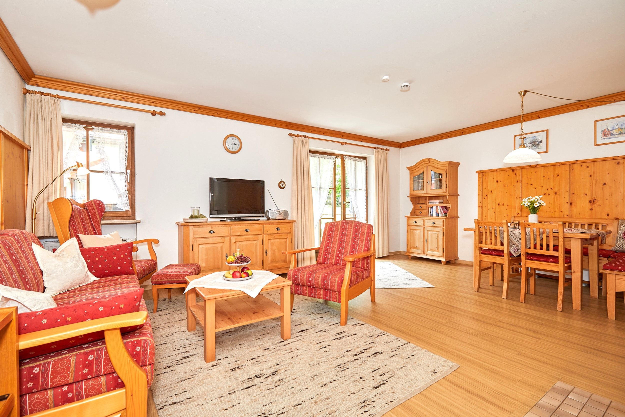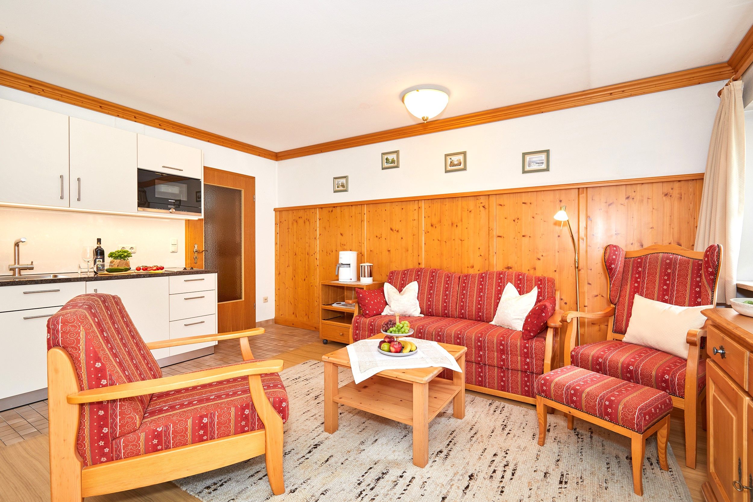 Die 2-Zimmer-Wohnung verfügt über eine Sitzecke, Sofa, Essecke, Kabel-TV, Flachbildschirm und W-LAN. Das separate Schlafzimmer verfügt über ein Doppelbett, und ist absolut ruhig zur Walmbergseite hin ausgerichtet. Bei Belegung mit mehr als zwei Personen dient Ihnen das Sofa im Wohnraum als vollwertiges Doppelbett-Schlafsofa. Das moderne Bad verfügt über Dusche und WC, ein Föhn ist vorhanden. Die Ferienwohnung bietet eine vollständig eingerichtete Küchenzeile, unter anderem mit Kühlschrank inkl. Gefrierfach, Herd, Mikrowelle, Kaffeemaschine, Wasserkocher und Toaster. Von der südwestlich gelegenen Terrasse mit Liegewiese haben Sie einen herrlichen Ausblick auf das umliegende Bergpanorama.