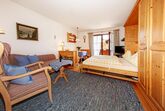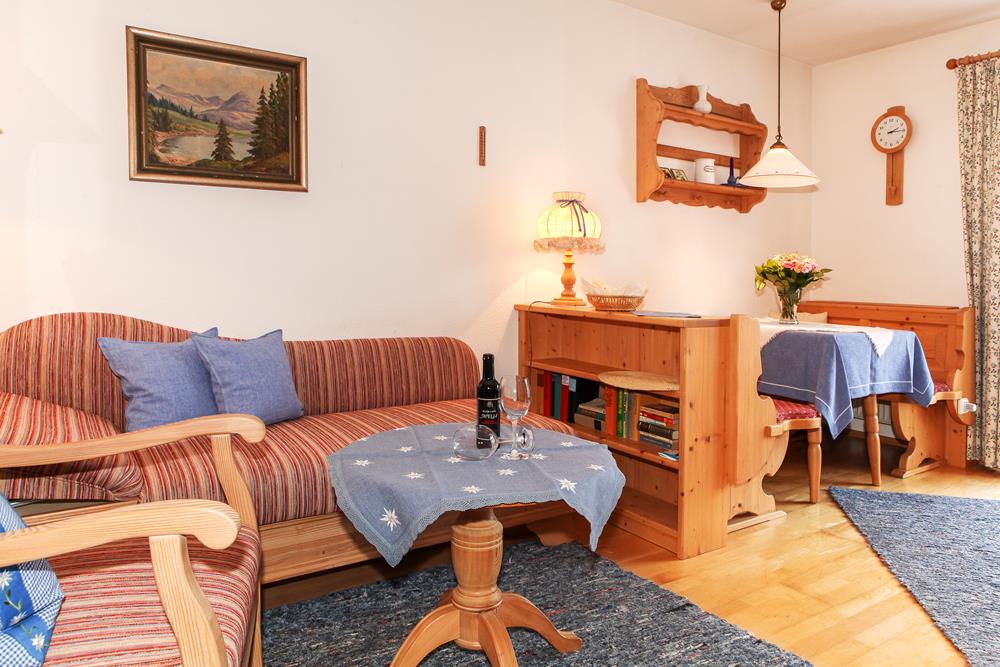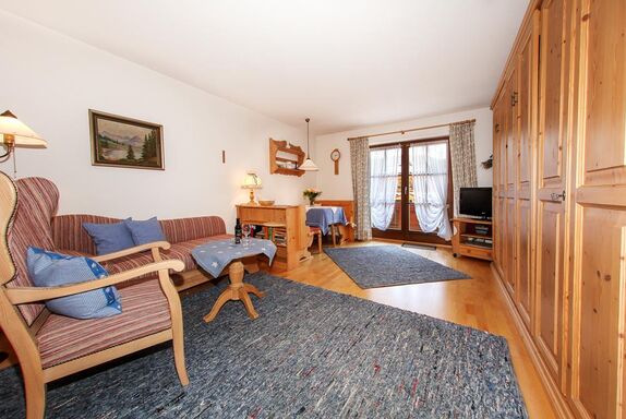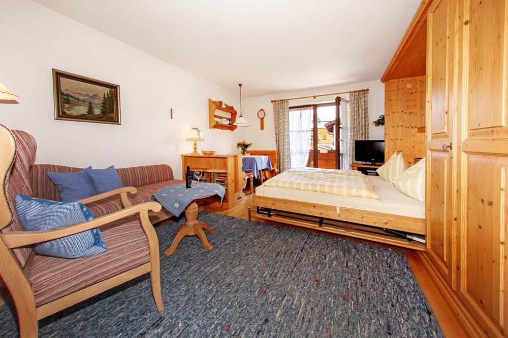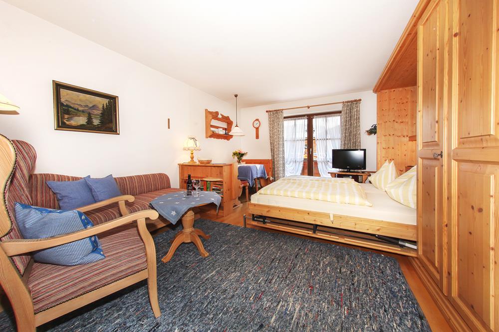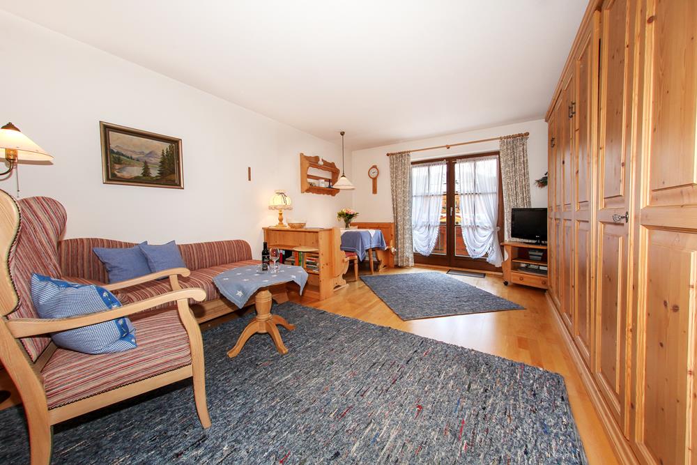 Die 1-Zimmer-Wohnung verfügt über eine Essecke, Sofa, Kabel-TV, Flachbildschirm und W-LAN. Das Doppelbett kann in einem Kleiderschrank verstaut werden (klappbares Doppelschrankbett). Das Badezimmer hat eine Dusche und WC, ein Fön ist vorhanden. Die Ferienwohnung verfügt über eine voll ausgestattete Küchenzeile mit Kühlschrank inkl. Gefrierfach, Herd, Mikrowelle, Kaffeemaschine, Wasserkocher und Toaster. Der Südbalkon ist mit einer Sitzgelegenheit ausgestattet und lädt zum Genießen des umliegenden Bergpanoramas (Blick auf den Kaiser) ein. Dort finden Sie auch einen beheizten Skiraum und einen Fahrradabstellraum. Haustiere sind in der Wohnung nicht erlaubt.