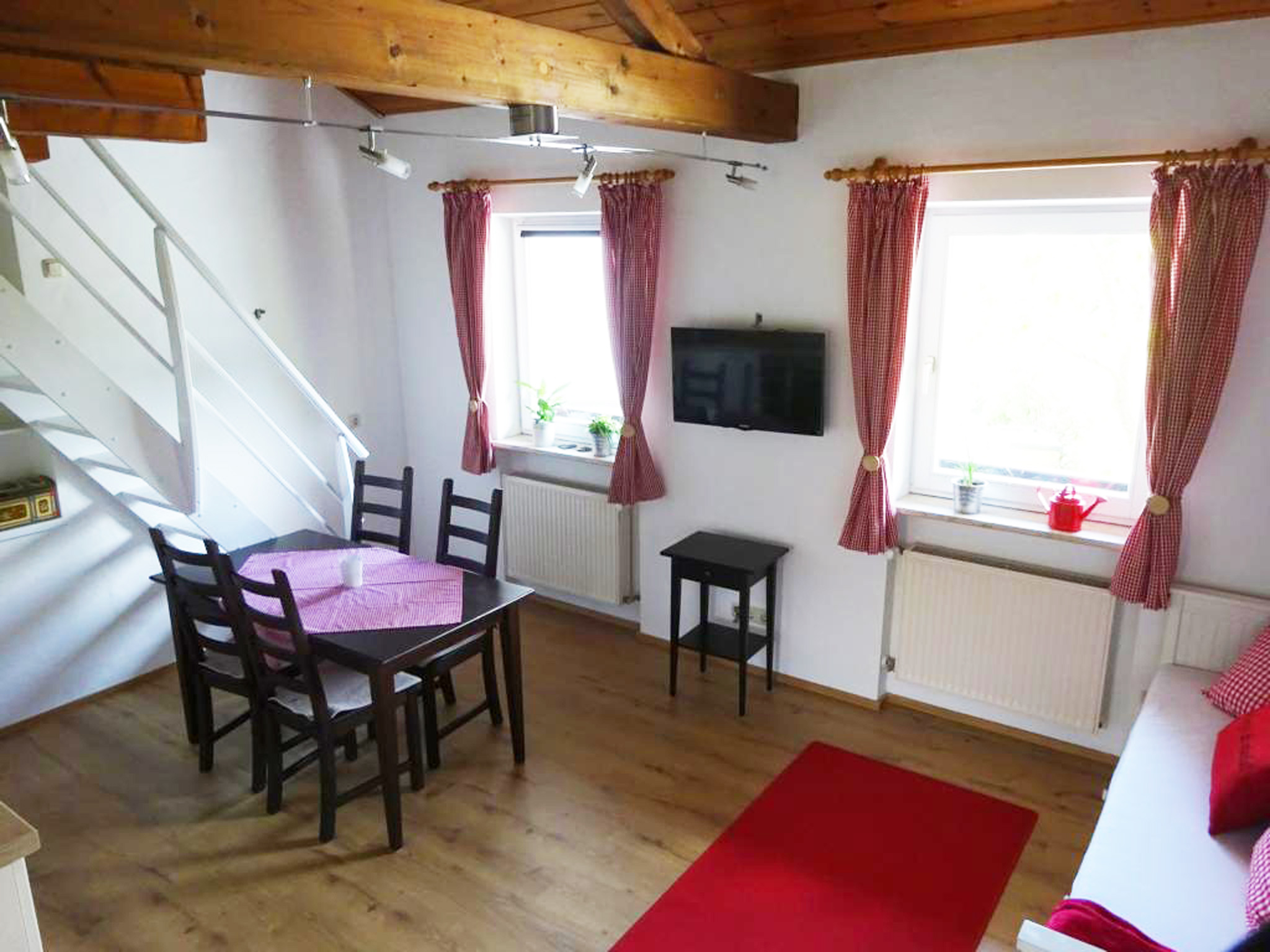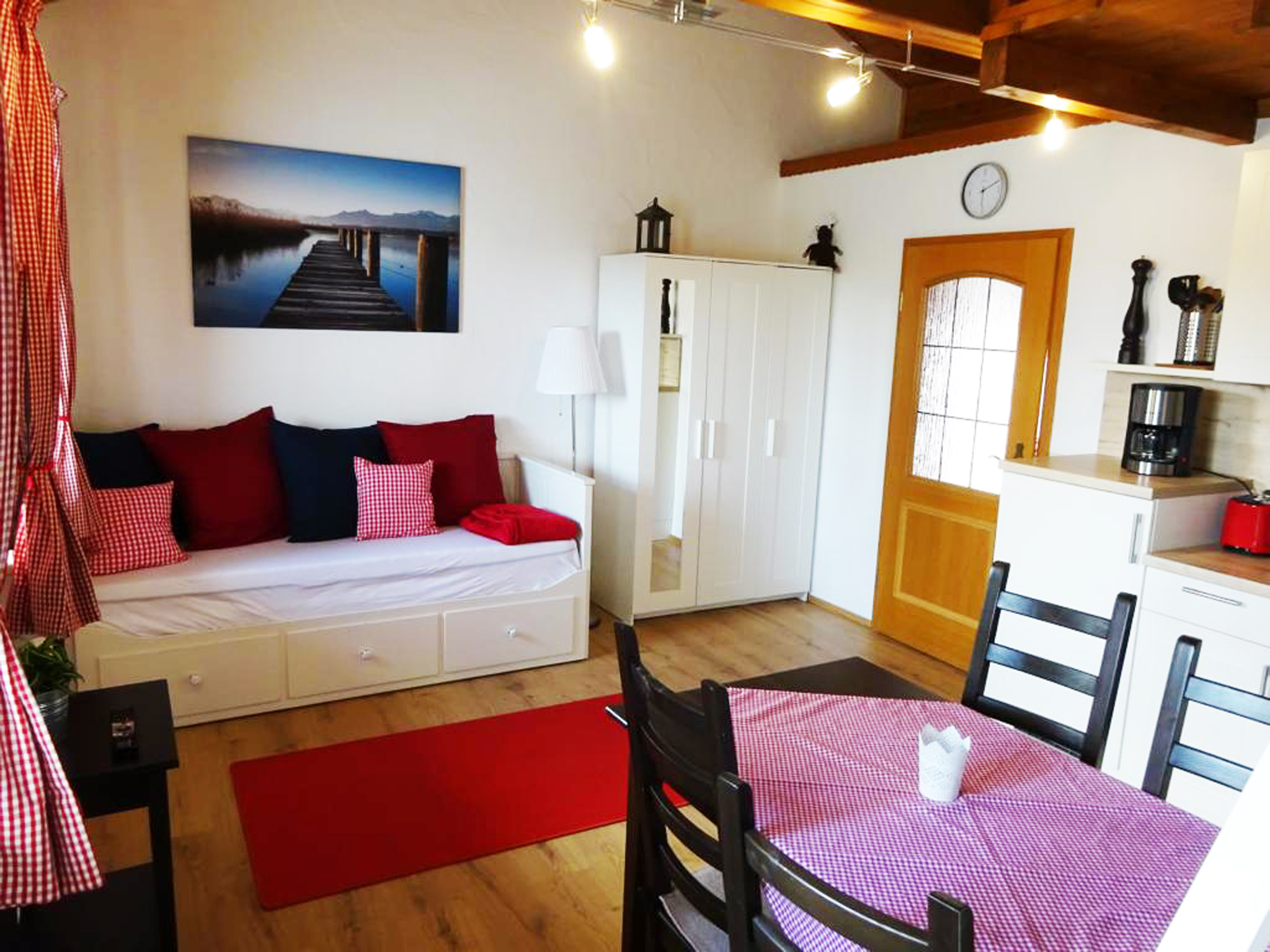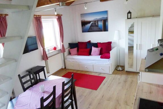 Unser Haus liegt absolut ruhig auf einer Anhöhe in Bad Endorf, in ca. 15 Gehminuten ist der Bahnhof bzw. der Ortskern mit diversen Einkaufsmöglichkeiten und Restaurants zu erreichen. Die Ferienwohnung befindet sich im 1. Stock unseres Hauses und ist über einen separaten Eingang erreichbar. Vor dem Haus steht ein Privatparkplatz für die Feriengäste zur Verfügung.Die 25qm große Ferienwohnung wurde XXXXXX aufwendig saniert und im Mai 2019 fertiggestellt und neu eingerichtet. Die Ferienwohnung verfügt neben der Garderobe und dem Badezimmer über ein Wohn-/Schlafraum mit Galerie, in der ein Doppelbett (1,60 m x 2,00 m) auf die Gäste wartet. Wem die Treppe zur Galerie zu steil ist, kann auch gerne das Schlafsofa (1,60 m x 2,00 m) nutzen.Für Kinder kann ein Reisebett sowie ein Kinderhochstuhl kostenlos zur Verfügung gestellt werden.