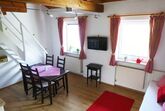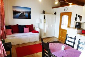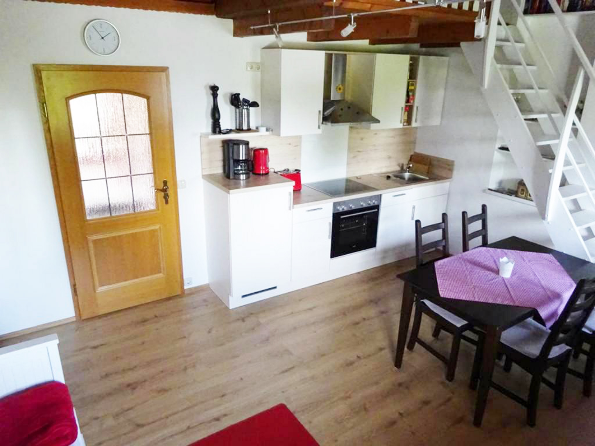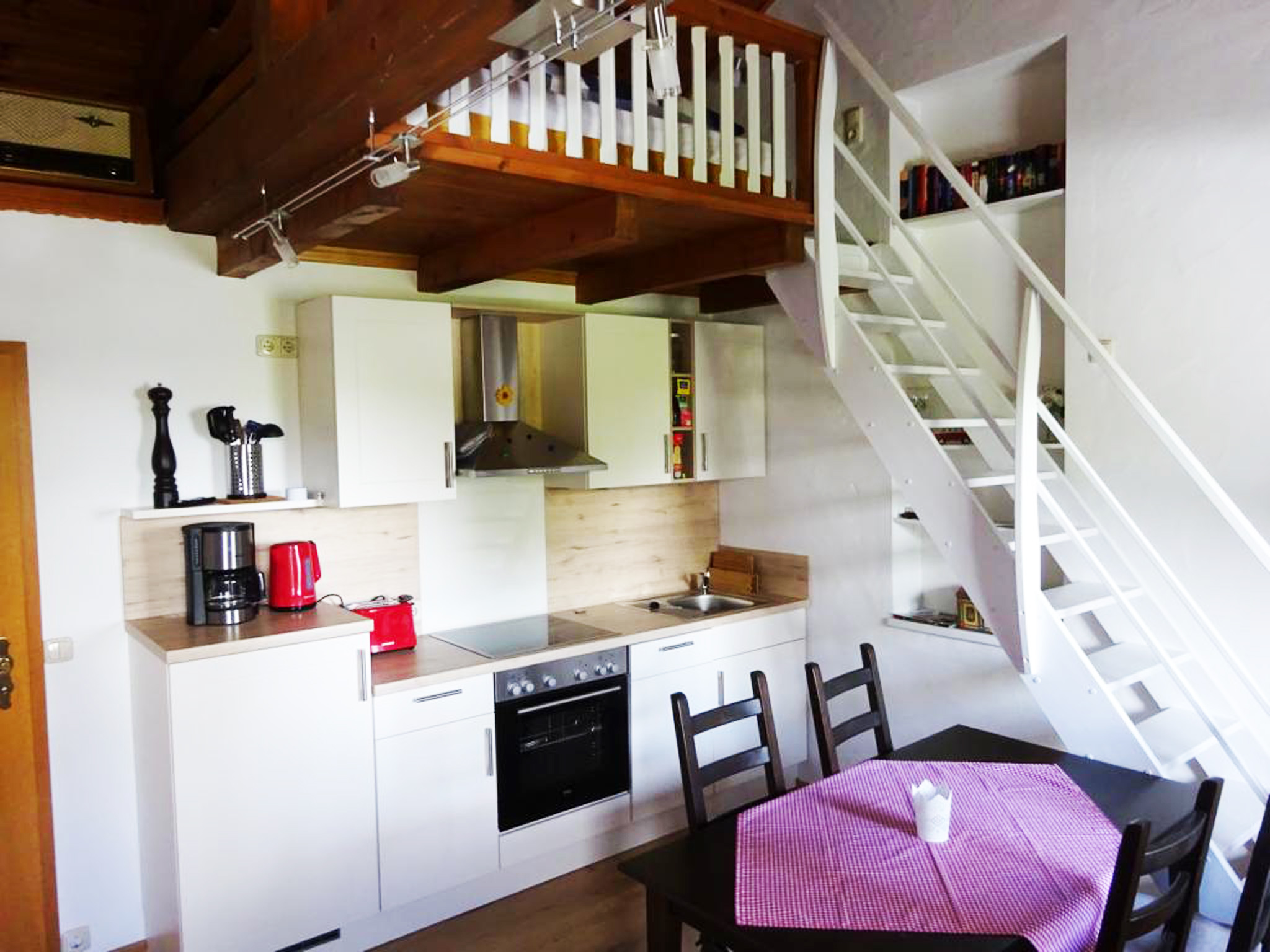 Die Ferienwohnung befindet sich im 1. Stock unseres Hauses und ist über einen separaten Eingang erreichbar. Vor dem Haus steht ein Privatparkplatz für die Feriengäste zur Verfügung. Die 25qm große Ferienwohnung wurde XXXXXX aufwendig saniert und im Mai 2019 fertiggestellt und neu eingerichtet. Die Ferienwohnung verfügt neben der Garderobe und dem Badezimmer über ein Wohn-/Schlafraum mit Galerie, in der ein Doppelbett (1,60 m x 2,00 m) auf die Gäste wartet. Wem die Treppe zur Galerie zu steil ist, kann auch gerne das Schlafsofa (1,60 m x 2,00 m) nutzen.