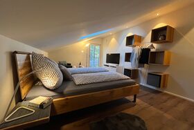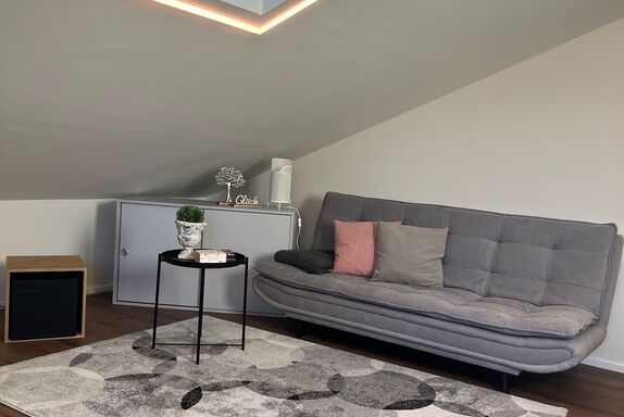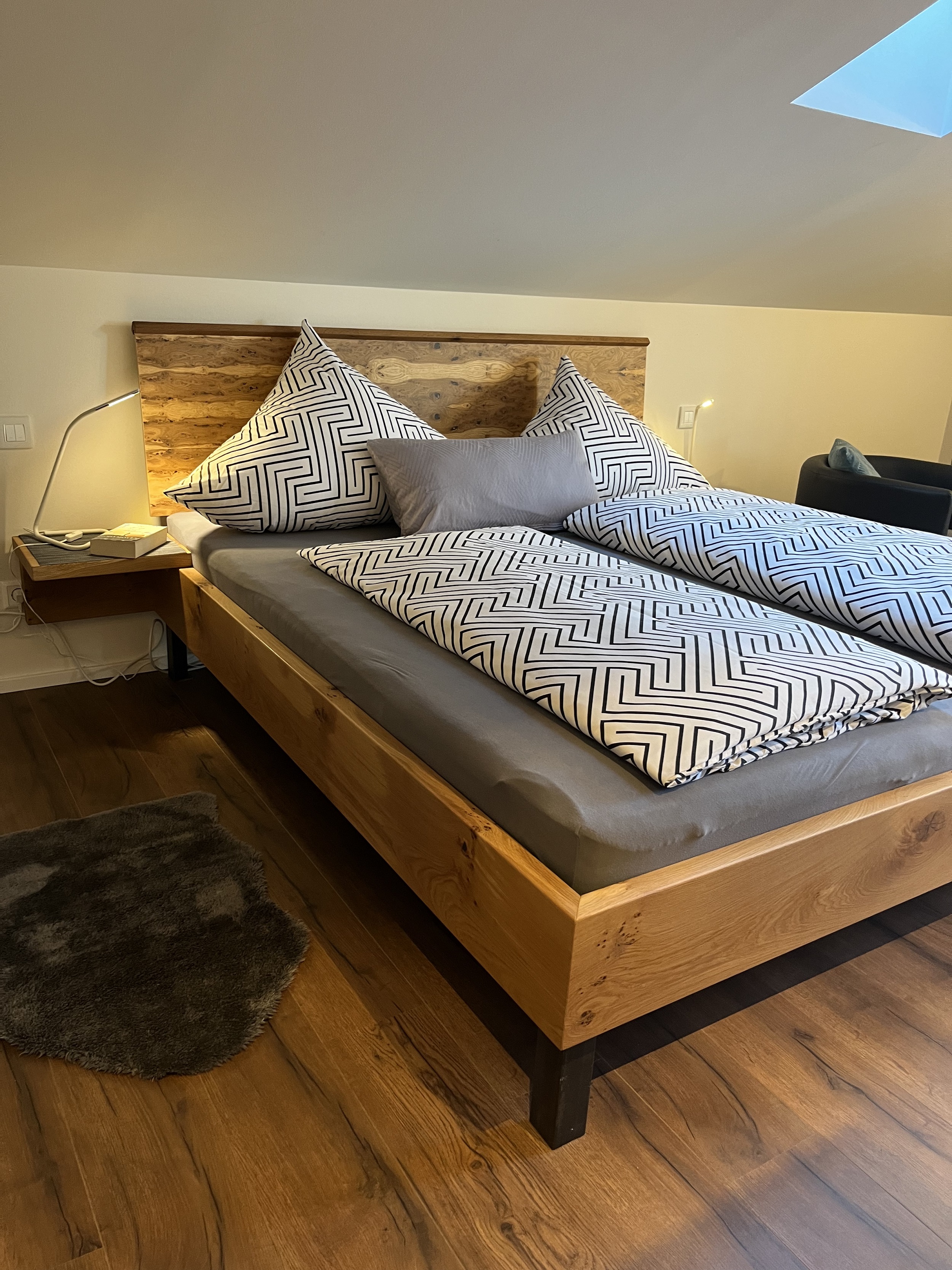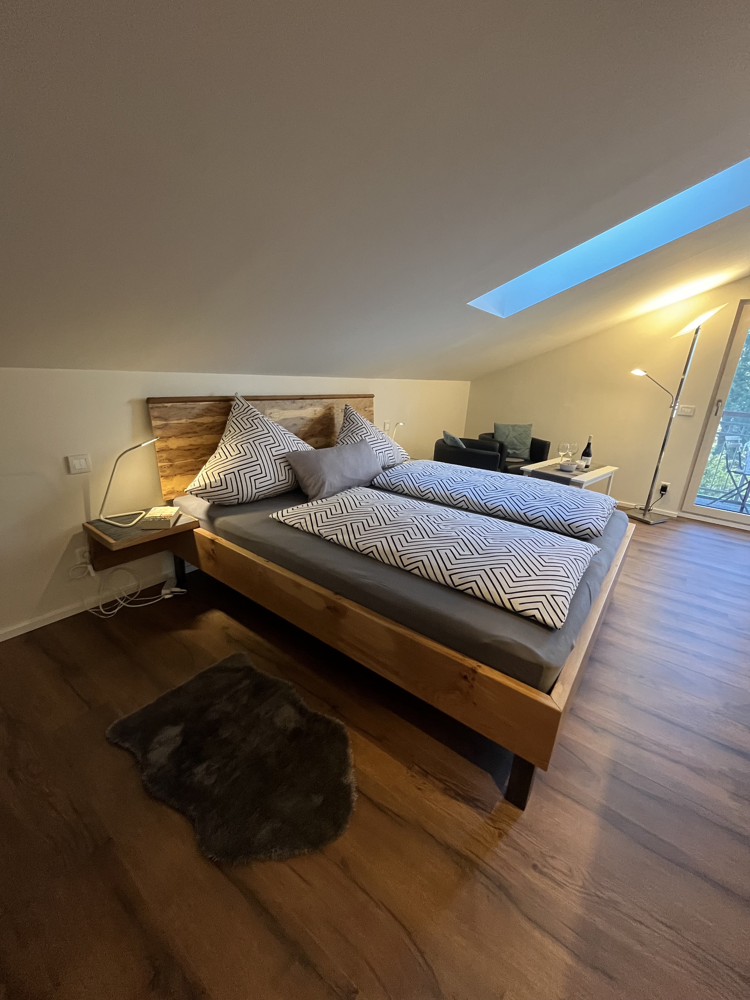 Das Apartement im Dachgeschoss besticht mit einem atemberaubenden Blick über den Waginger- und Tachinger See und über die Chiemgauer Alpen. Das Doppelbett mit Komfortmatratze lädt zum Träumen ein, der offene Kleiderschrank bietet viel Stauraum. Ein Highlight stellt das modern gestaltete Badezimmer mit großer Walk-in-Dusche, Waschtisch und WC dar. Die neue und moderne Küche ist mit einem großen Kühlschrank mit separaten Eisfach, einem Backofen und einem großen Kochfeld ausgestattet. Der Stellplatz für ihren PKW ist inbegriffen, eine E-Ladesäule mit Stecker Typ 2 ist vorhanden. Das Apartement besteht aus Schlafzimmer mit Sitzecke und TV, einem Wohn-/Esszimmer mit einer Schlafcouch und Schreibtisch, einer großen Küche im Gang und einem großen Badezimmer mit Walk-In-Dusche und WC. Auf dem Balkon an der OStseite haben Sie einen traumhaften Blick über den Tachinger- und Waginger See und die bayerischen und österreichischen Alpen.