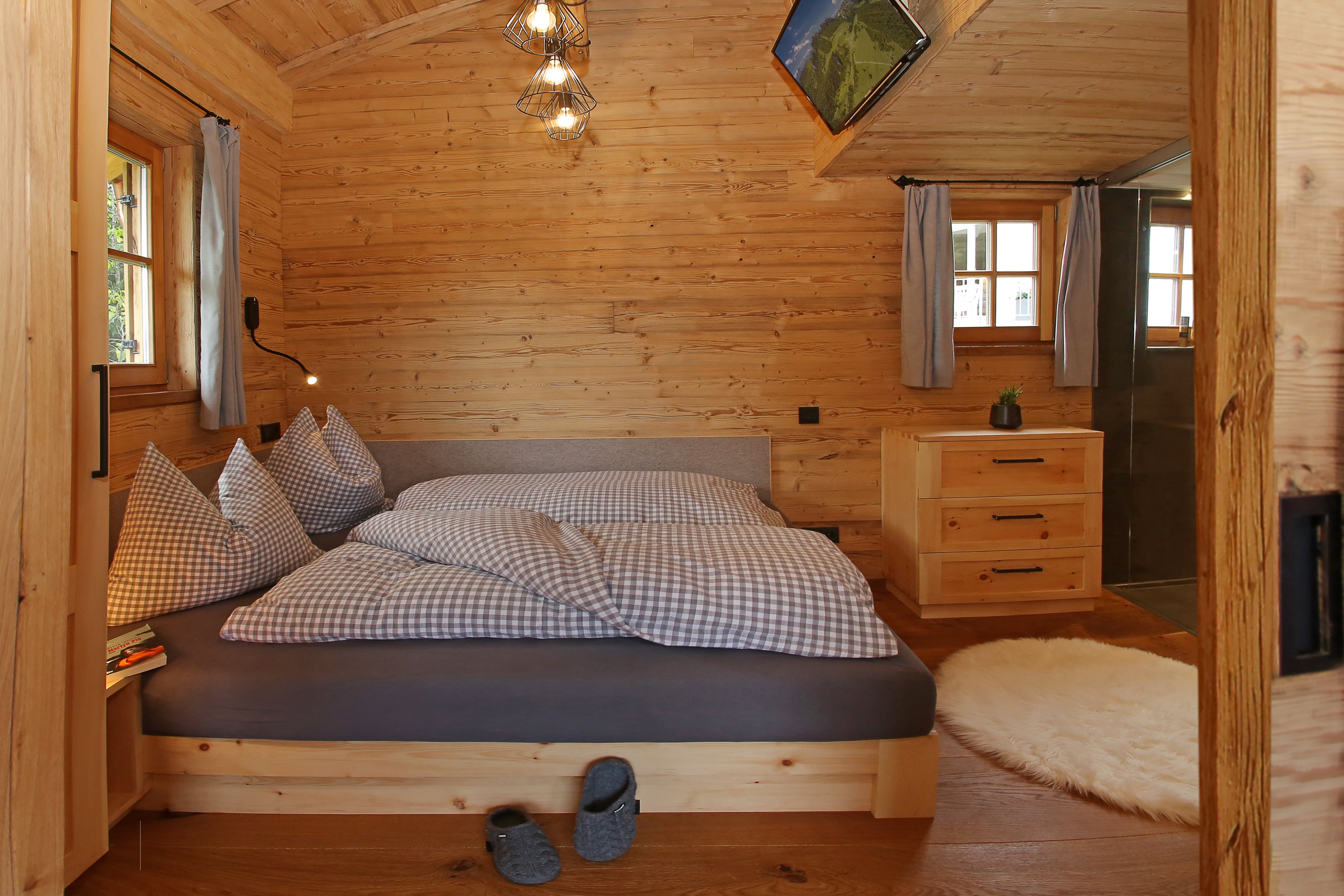 • 1 Schlafzimmer im Eg aus Zirbenholz mit Karierter Bettwäsche Ganzkörperspiegel u.TV