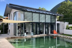 In 2019 erbautes Poolhaus mit Schwimmteich in ruhiger Lage zwischen Alpen und Chiemsee. Perfekt geeignet für alle Wanderer, Rad- und Motorradfahrer. Es erwartet Sie auf 72qm ein modernes Ambiente, voll ausgestattete Küche, 2 Bäder und direkter Zugang zum Schwimmteich.Das Poolhaus ist offen gestaltet und lichtdurchflutet. Im Erdgeschoss können Sie alle Türen zum Schwimmteich hin öffnen, so dass Sie direkt am Wasser sitzen und nach Belieben vom Wohnzimmer aus in das klare Wasser springen können.Unser Poolhaus liegt unmittelbar am Rand der Chiemgauer Alpen. Wander- und Radwege beginnen praktisch hinter dem Haus, der Chiemsee ist bequem zu erreichen. Ideal auch als Ausgangspunkt für Motorradtouren durch die Chiemgauer Alpen. Ein Carport ist vorhanden mit einem Anschluß für Elektrofahrzeuge (2 Ebikes können ausgeliehen werden). Zu Fuss erreichen Sie die in der Nähe gelegenen kulinarischen und kulturellen Angebote leicht. Wir hoffen, Sie sind so begeistert wie wir und freuen uns auf Sie !