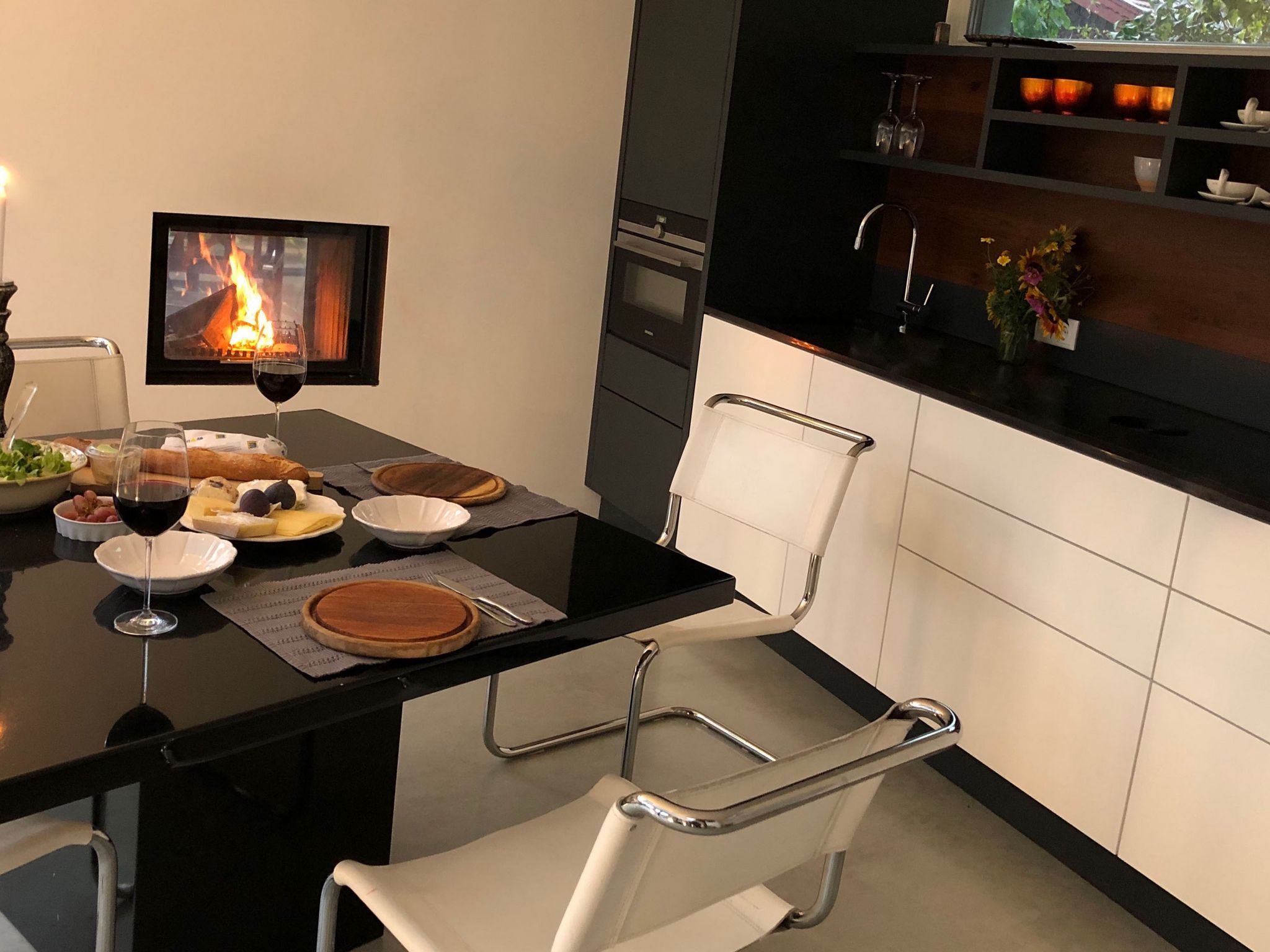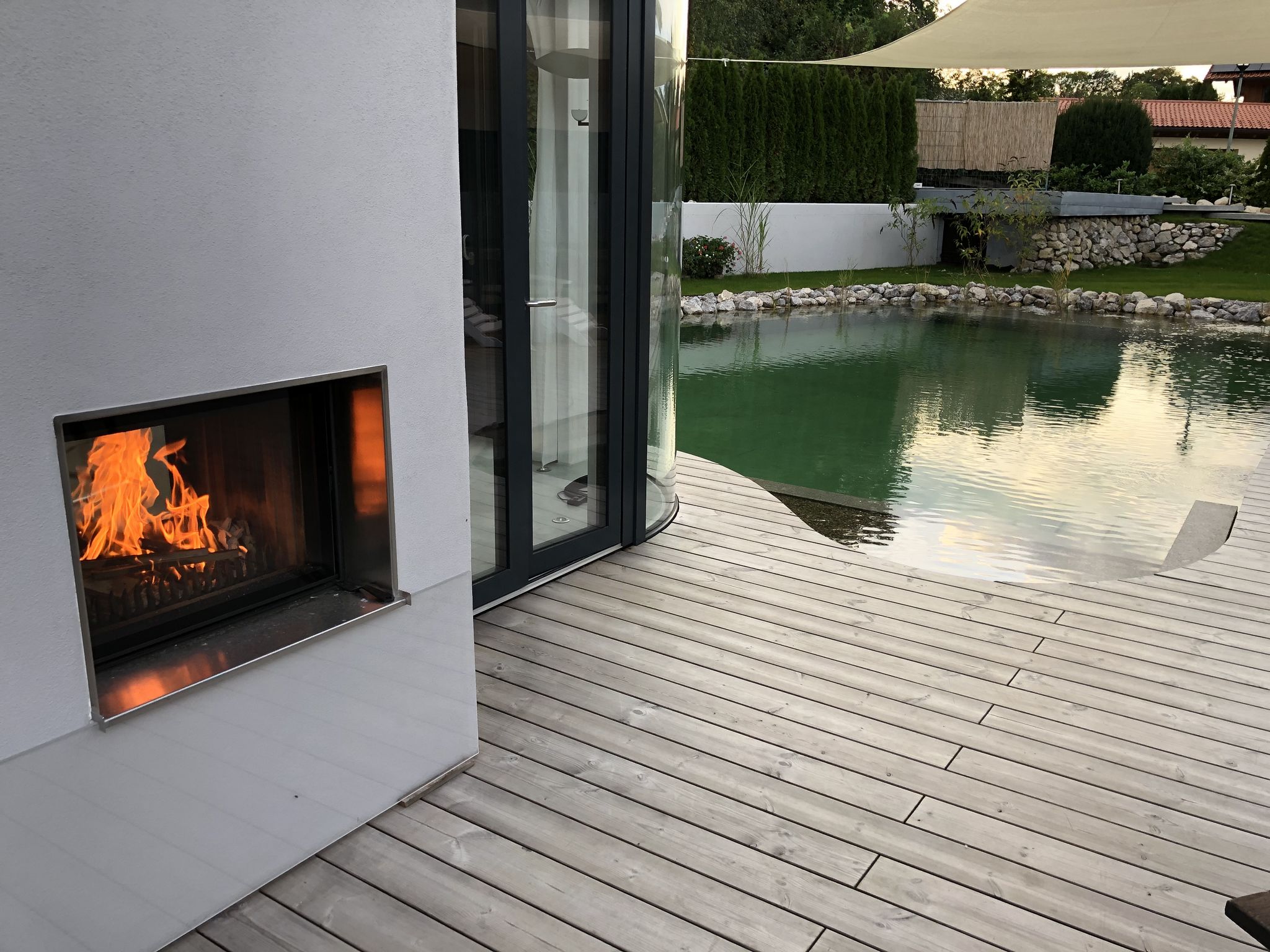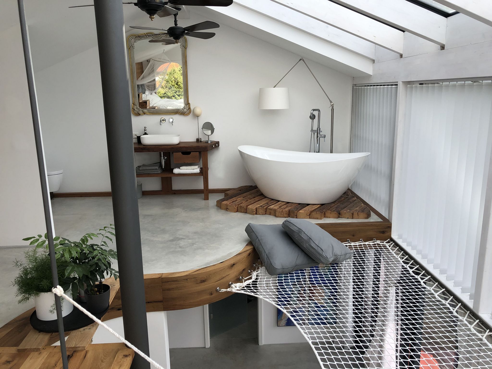 Zwei Geschosse sind über eine Wendeltreppe miteinander verbunden, der offene Raum wird zum Teil von einem Wohnraumnetz, auf dem es sich gemütlich liegen lässt, ür Schlafbereich mit Doppelbett (180x200) befindet sich im mit Althölzern im Alpenstil gestalteten oberen Bereich, ebenso eines der beiden Bäder mit Dusche, WC und grosser Badewanne. Durch die grossen Fenster können Sie nachts vom Bett aus in die Sterne schauen.Im Erdgeschoss findet sich die moderne Küche mit r Kamin kann von innen und von außen beschickt werden und sorgt für gemütliche Wärme. Eine Pergola über der Terrasse verbindet das neue Poolhaus mit dem alten Grundstück.Ebenfalls im Erdgeschoss befindet sich der Wohnzimmerbereich mit Internet HD-TV. Vom Hauptbadezimmer aus gelangen Sie zur Aussendusche und natürlich ebenfalls zum Schwimmteich.