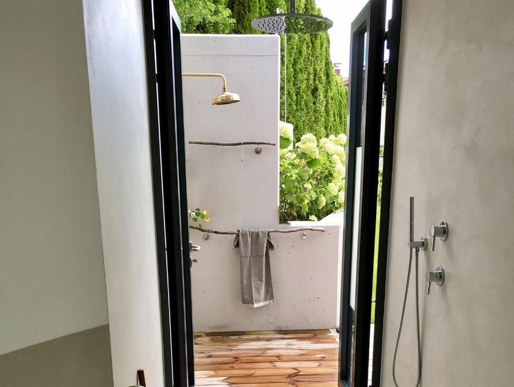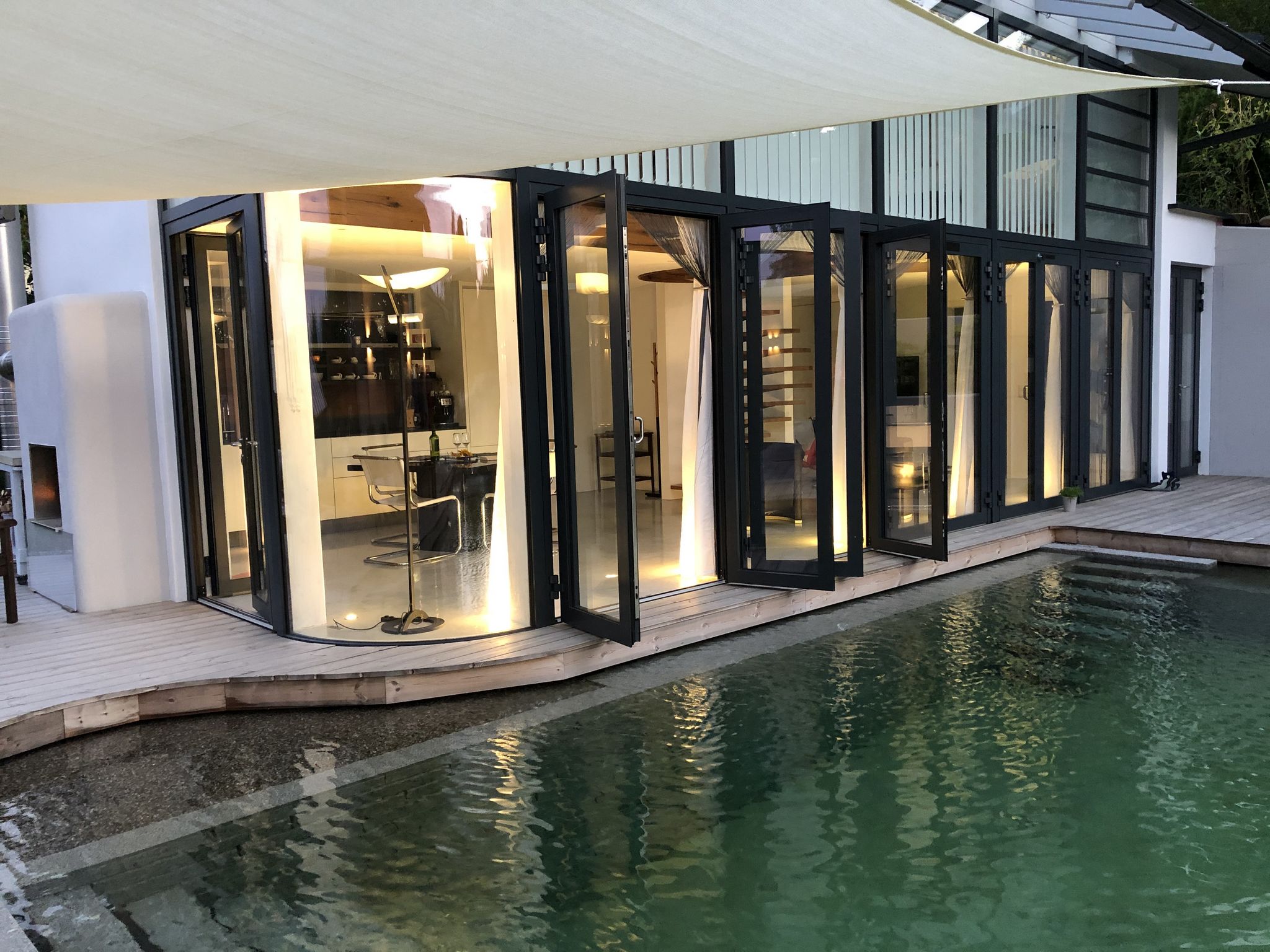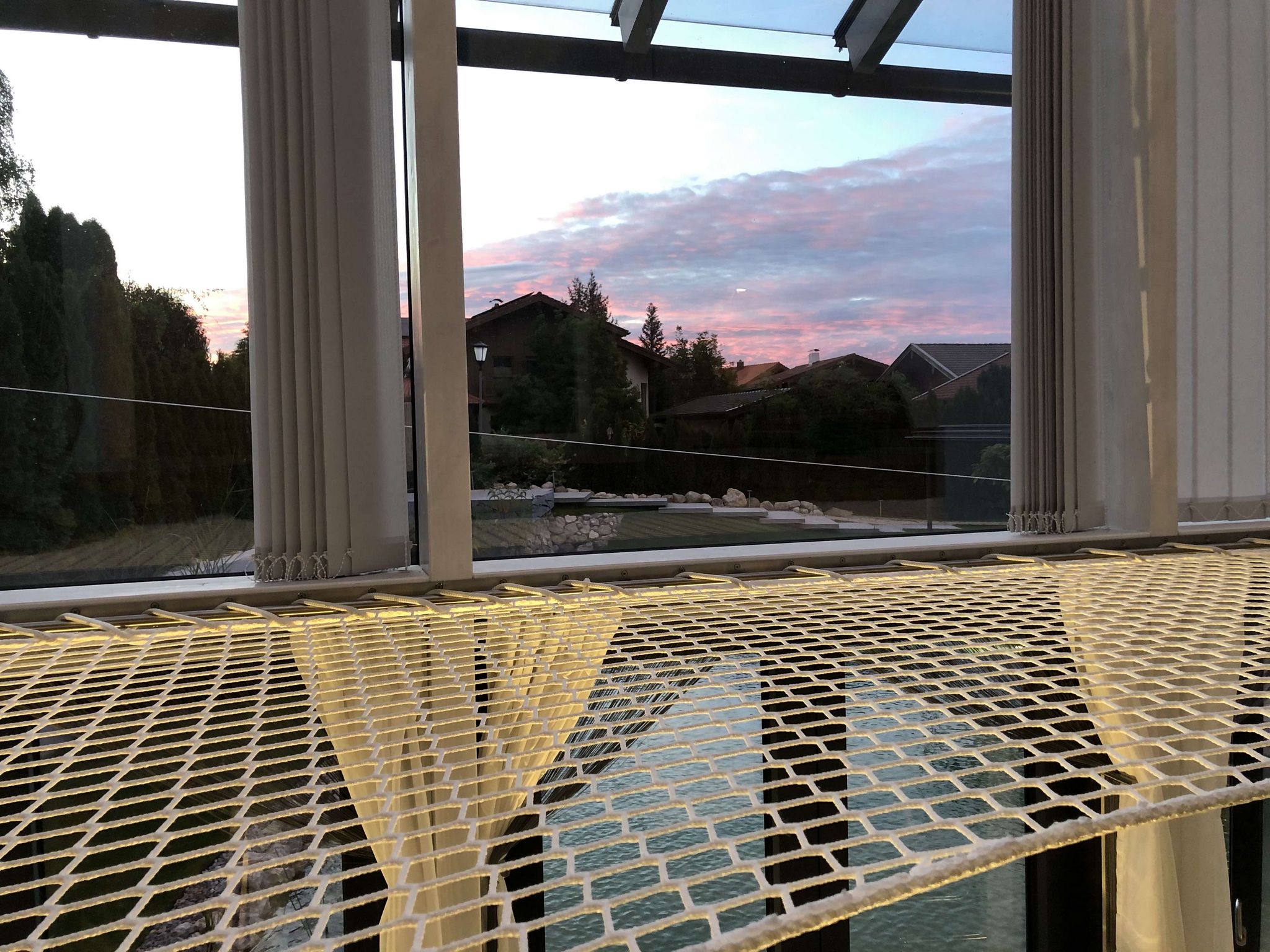 Zwei Geschosse sind über eine Wendeltreppe miteinander verbunden, der offene Raum wird zum Teil von einem Wohnraumnetz, auf dem es sich gemütlich liegen lässt, ür Schlafbereich mit Doppelbett (180x200) befindet sich im mit Althölzern im Alpenstil gestalteten oberen Bereich, ebenso eines der beiden Bäder mit Dusche, WC und grosser Badewanne. Durch die grossen Fenster können Sie nachts vom Bett aus in die Sterne schauen.Im Erdgeschoss findet sich die moderne Küche mit r Kamin kann von innen und von außen beschickt werden und sorgt für gemütliche Wärme. Eine Pergola über der Terrasse verbindet das neue Poolhaus mit dem alten Grundstück.Ebenfalls im Erdgeschoss befindet sich der Wohnzimmerbereich mit Internet HD-TV. Vom Hauptbadezimmer aus gelangen Sie zur Aussendusche und natürlich ebenfalls zum Schwimmteich.