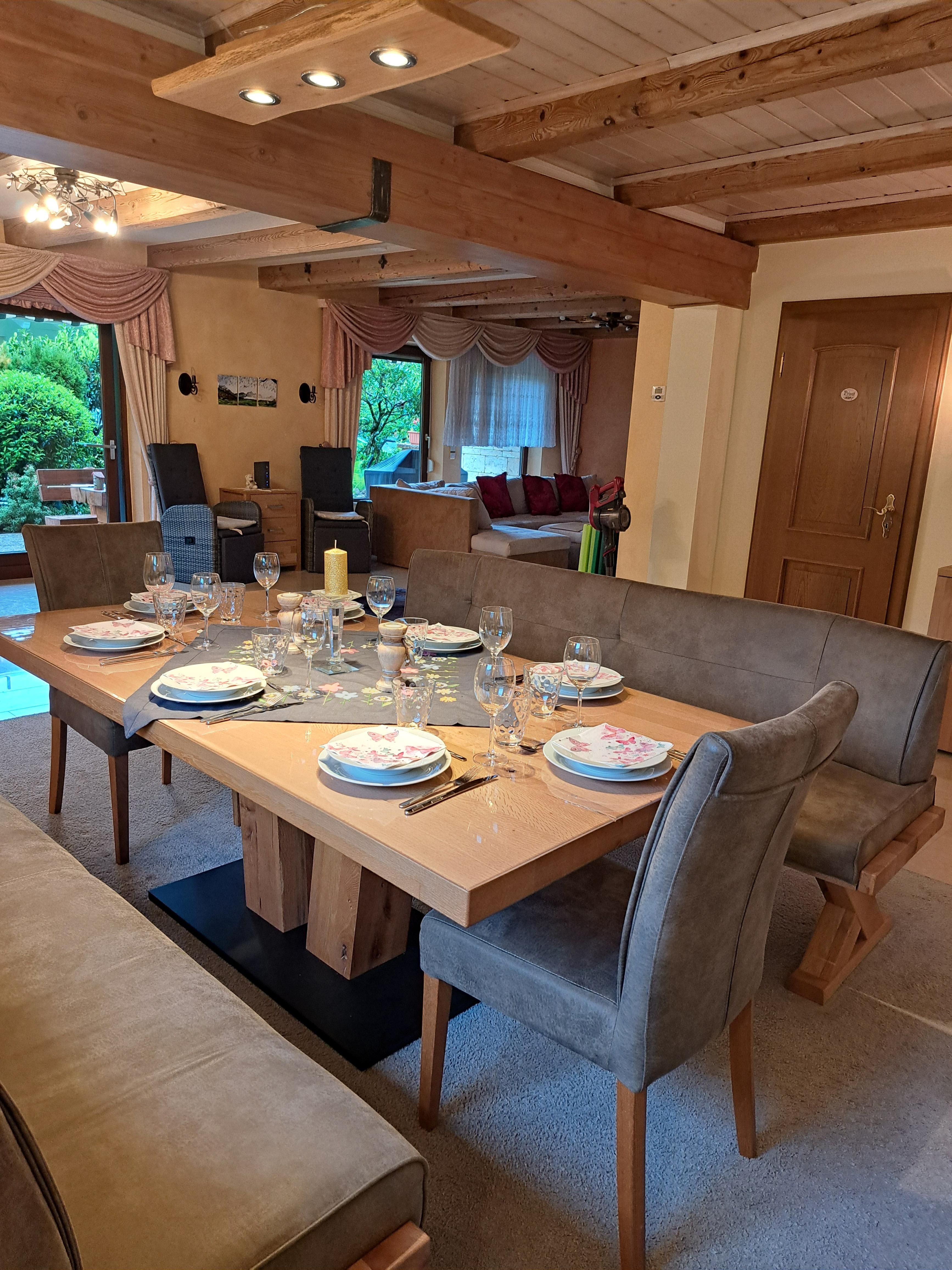 Die großzügige Ferienwohnung „Speckbichlhaus“ liegt sehr ruhig am Ortsrand von Ruhpolding. Sie verfügt über eine Terrasse und zwei Balkone mit herrlichem Ausblick. Die 200 qm Wohnung verfügt über ein großes Wohn-/Esszimmer, eine Küche, zwei Bäder, eine separate Dusche, zwei separate WCs und einen absperrbaren Abstellraum für Sportgeräte. Mit 4 Schlafzimmern bietet die Wohnung genug Platz für bis zu 8 Personen. Das Wohnzimmer verfügt über eine Wohnlandschaft und Fernseher, die großzügige Essecke über einen großen Tisch mit Bänken und Stühlen. Die Küche ist vollständig ausgestattet, inkl. Geschirrspüler, Herd, Backofen, Kaffeemaschine und Kühl-Gefrier-Kombination. WLan, Bettwäsche, Handtücher werden bereitgestellt und viele Spiele stehen für gemütliche Familienabende zur Verfügung. Drei Parkplätze sind direkt vor dem Haus verfügbar. Mit dem Aufenthalt in unserem Haus erhalten Sie gratis die Chiemgau Karte, mit der Sie zusätzlich zu unseren eigenen Leistungen, zahlreiche kostenlose Leistungen in und um Ruhpolding erleben können. Folgende Gratisleistungen bietet Ihnen die Karte: Bergbahnen, Museen, Erlebnisbäder, Skilifte, Führungen, Radverleih, Tennis, geführte Wanderungen, freies Fahren mit den lokalen und regionalen Bussen und der Bayerischen Regiobahn zwischen Ruhpolding und Traunstein u.v.m. Die detaillierten Inhalte und die Nutzungsbedingungen senden wir Ihnen auf Wunsch gerne zu.