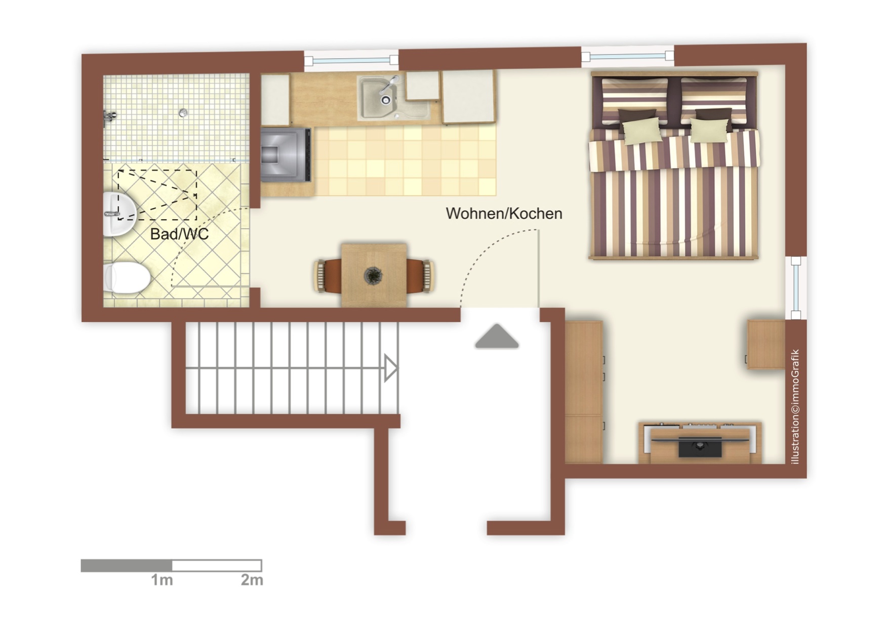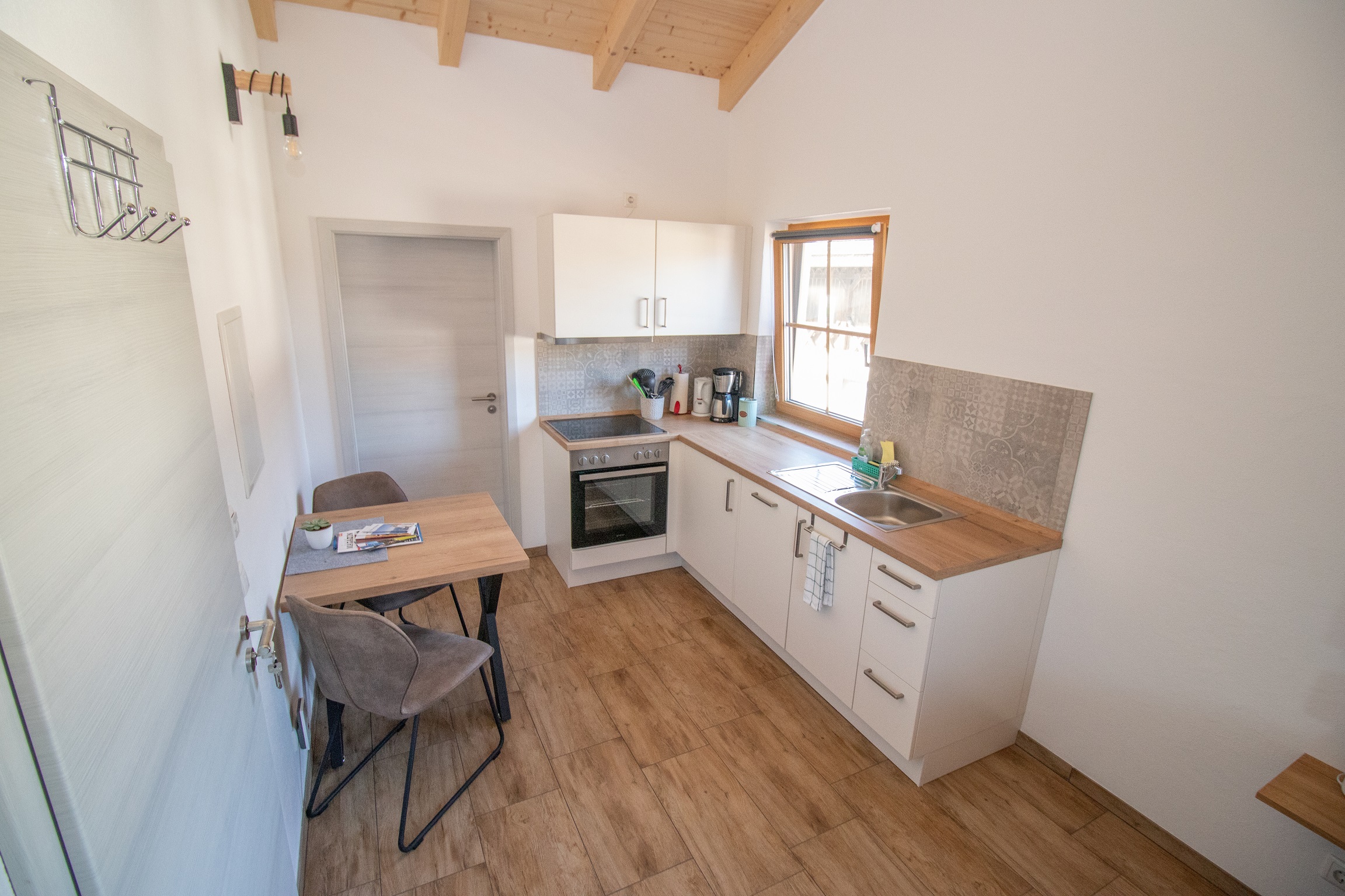 Das gemütliche Apartment (24 m²) für zwei Personen verfügt über ein Badezimmer mit Dusche und WC, eine Küche mit Essbereich sowie einen Schlafbereich. Zudem könnt ihr den Garten inklusive der Sitzgelegenheiten und dem Grill zu nutzen.