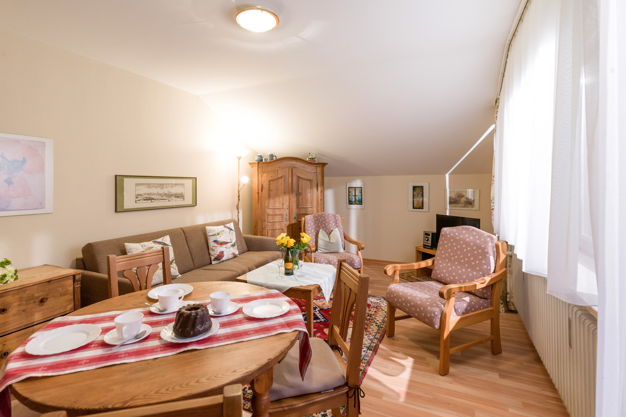 Freundlich eingerichtete Ferienwohnung im 2. Stock mit separater Küche, neu renovierten  Bad mit Dusche, sowie separatem WC, Schlafzimmer mit einem Doppelbett und einer Schlafcouch für eine Person, einem hellen Wohnraum mit gemütlicher Essecke. Platz genug für 2 oder mehr Erwachsene oder einer kleinen Familie. Das Wohnzimmer ist mit einer Ausziehcouch für 2 Personen und einem Esstisch für 4 Personen ausgestattet. Der Balkon lädt nach einem ereignisreichen Tag  zum Sitzen im Freien ein. Die Küche verfügt über einen Backofen, Kühlschrank und einen  4- Plattenherd, sowie Kaffeemaschine, Toaster, Wasserkocher und Küchenutensilien. Die Wohnung liegt in einer familienfreundlichen Anlage mit Spielplatz, Ruheinseln im Garten  in ruhiger Lage am Tor zu den Alpen. Sie haben direkten Zugang zum Hallenbad, Sauna, Spielezimmer und Fitnessraum .