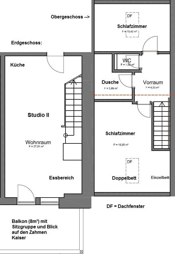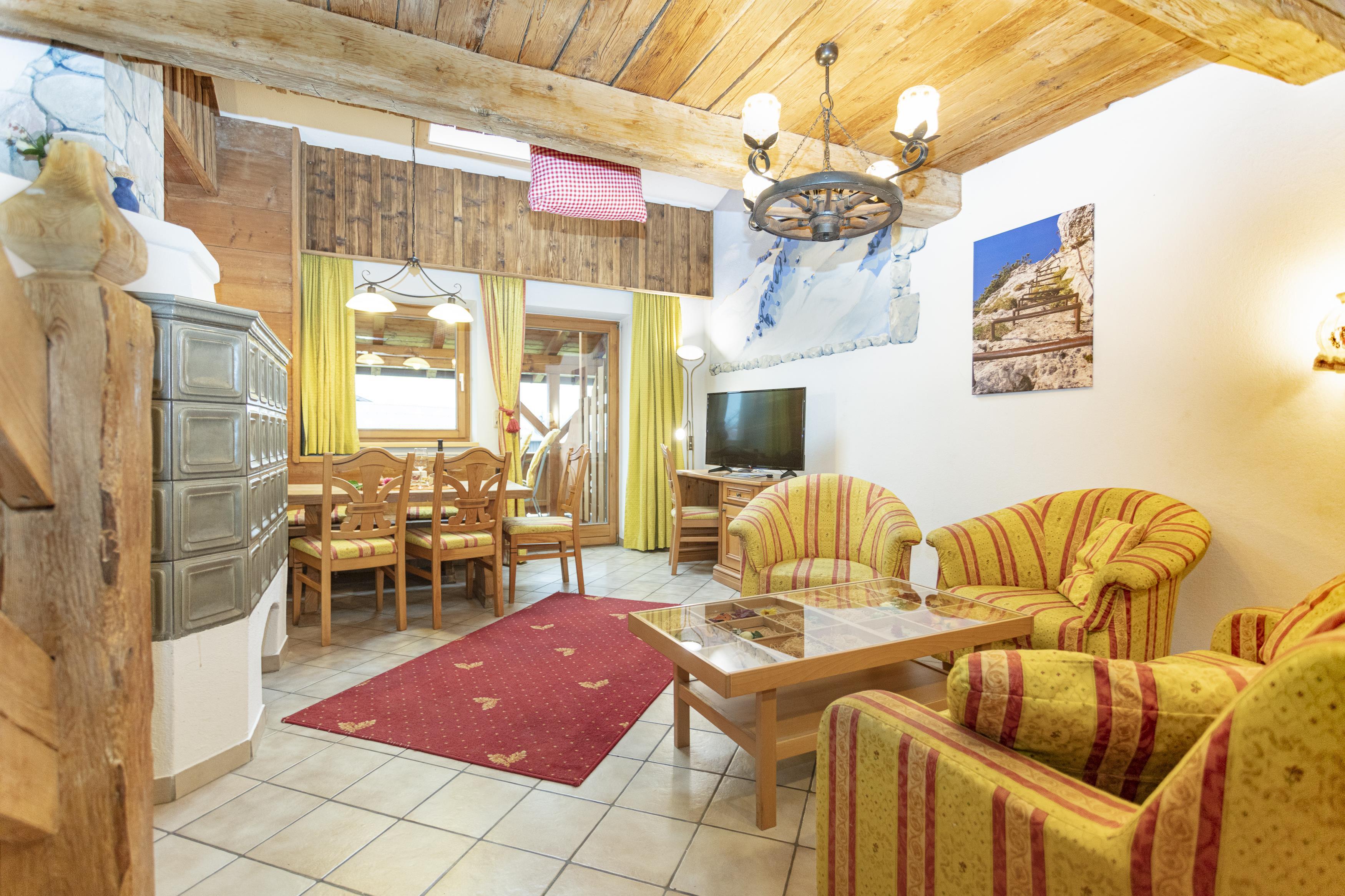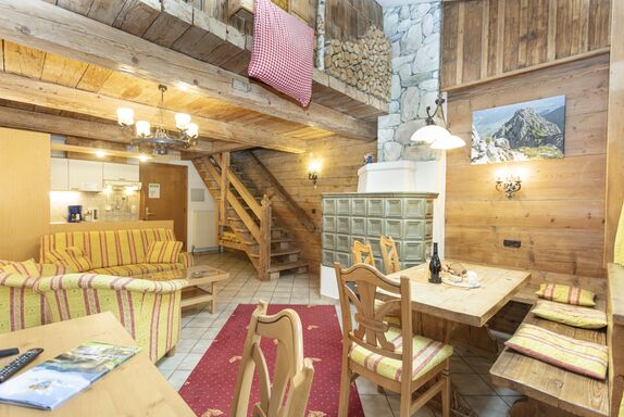 Ein Kachelofen sorgt hier für ein wohliges Ambiente und lädt zum geselligen Beisammensein im großen Wohnraum mit Küche, integriertem Essbereich und ausziehbarer Couch. Ein Doppelzimmer und ein Dreibettzimmer, Dusche und ein separates WC schafft Platz für max.7 Personen (auf 2 Stockwerken).