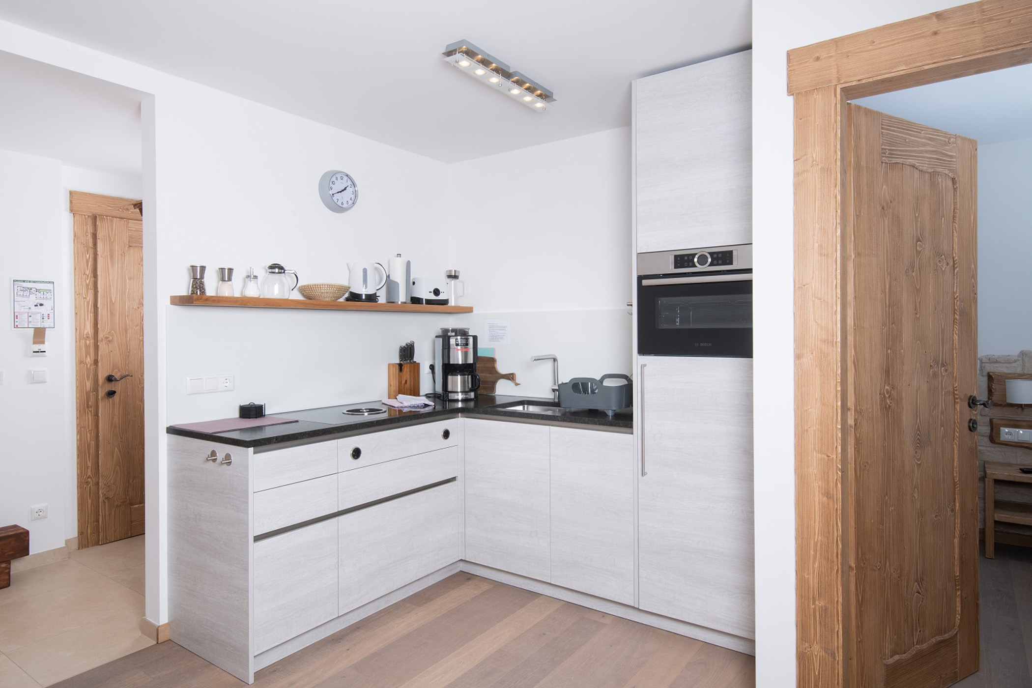 Einrichtung in alpin-modernem Stil, Echtholzparkett, Fußbodenheizung, moderne vollausgestattete Küche, Bad mit Walk-In-Dusche, Schlafzimmer mit Boxspring-Doppelbett, überdachte Aussichtsterrasse.