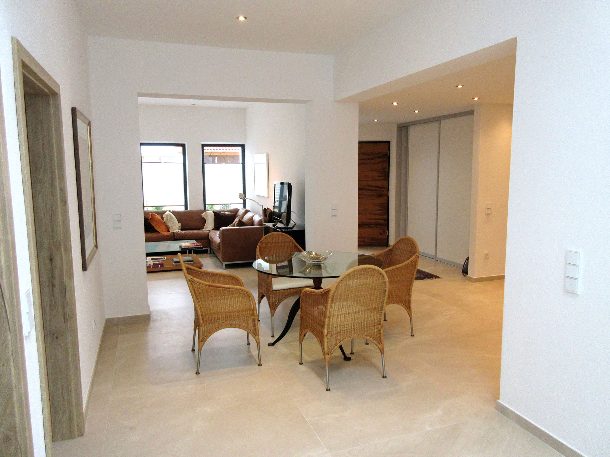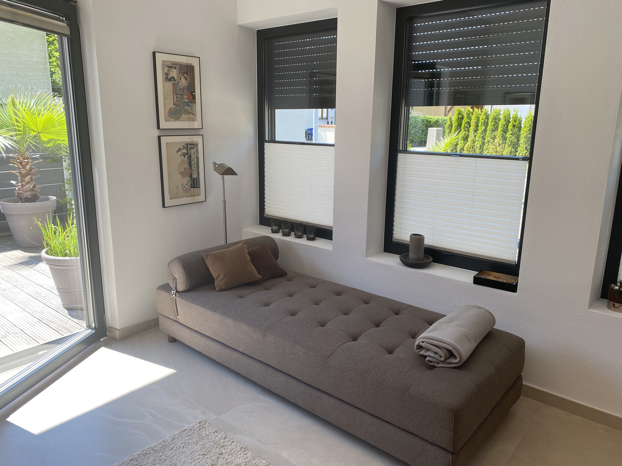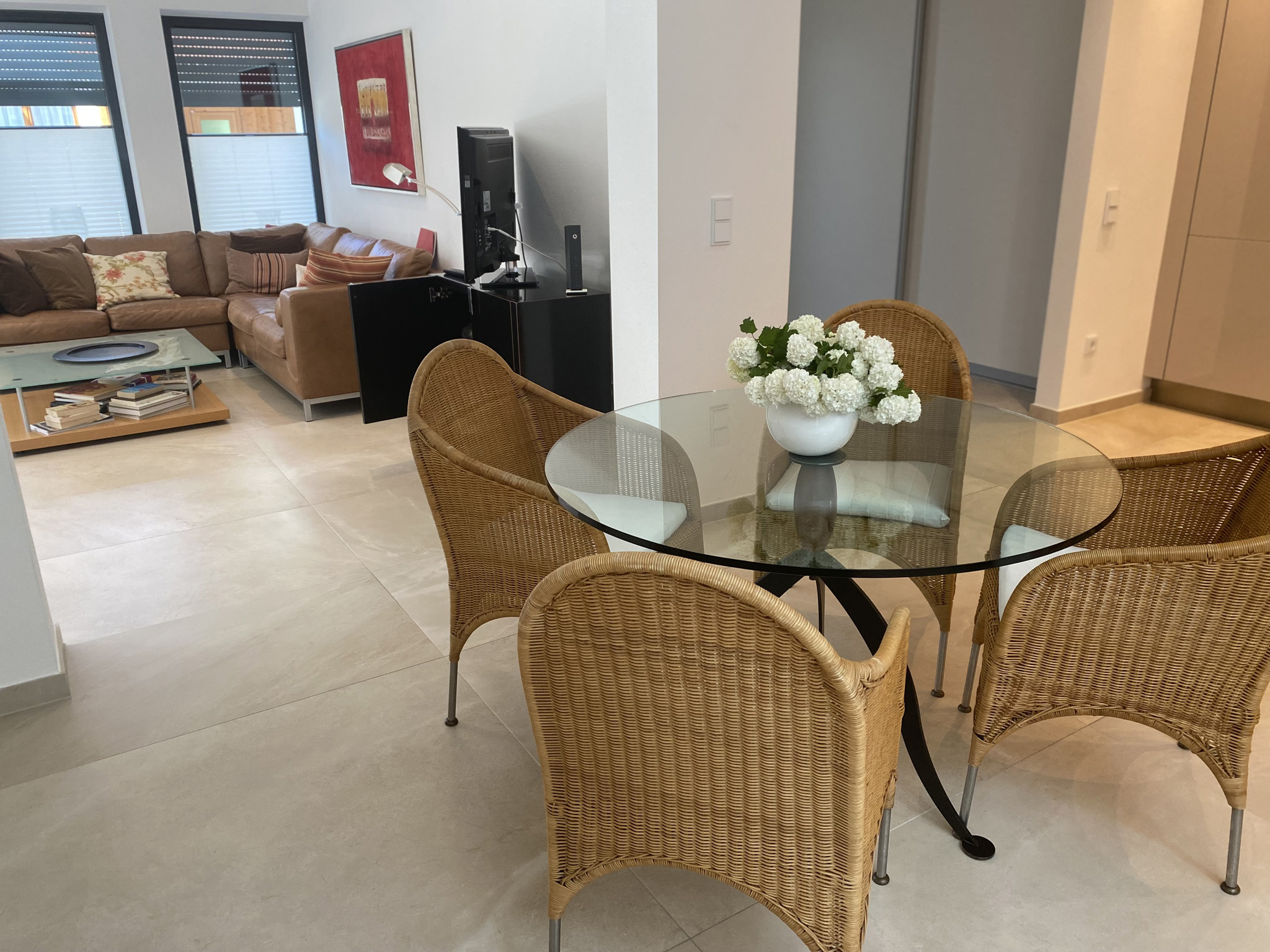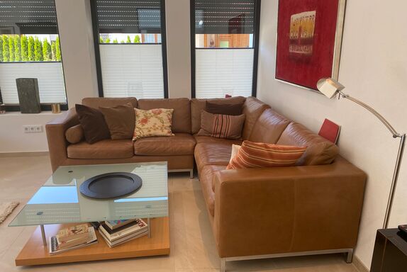 Hochwertig ausgestattete Ferienwohnung für 2 Personen, die Wohnung liegt im Erdgeschoss und ist 90 m² groß und behindertenfreundlich, weil sie ebenerdig liegt und keinerlei Schwellen verbaut sind. Sie verfügt über ein Schlafzimmer mit Flachbild-TV, ein großzügiges Badezimmer mit Rainshower-Dusche und Handtuchtrockner, einen großen offenen Wohnraum mit komplett ausgestatteter Küchenzeile, einen Esstisch, eine Leseecke, eine gemütliche Wohnlandschaft mit Flachbild-TV und eine Terrasse mit Gartenmöbeln und Liege.