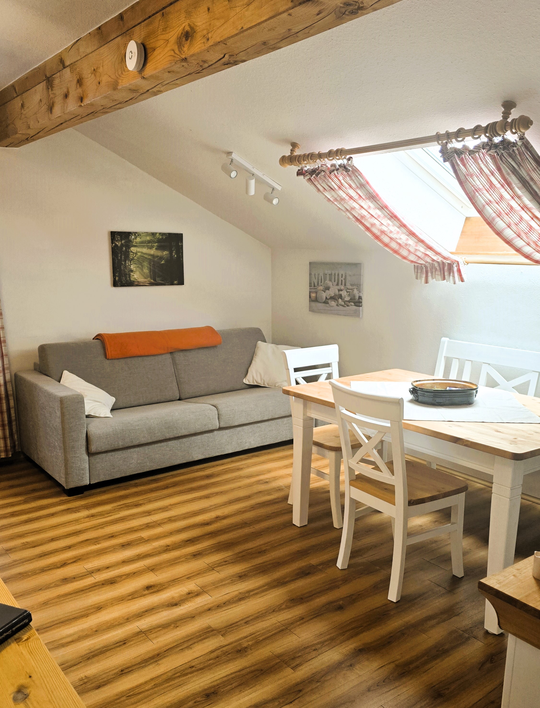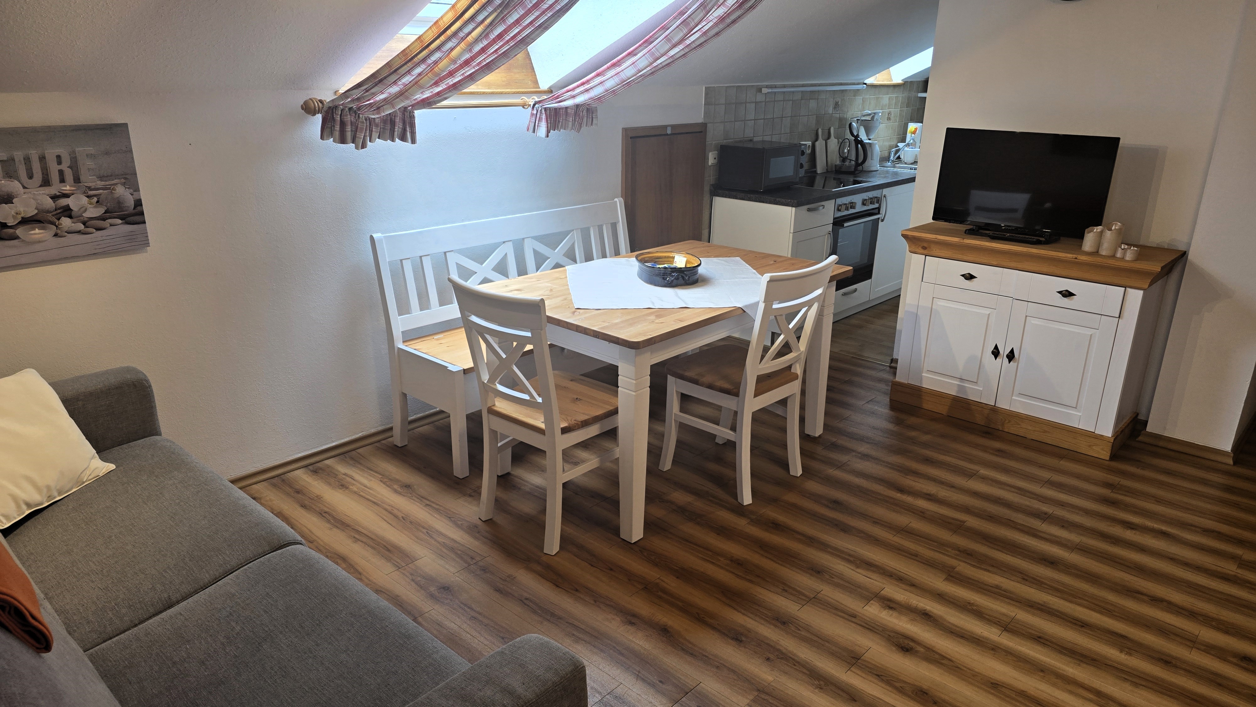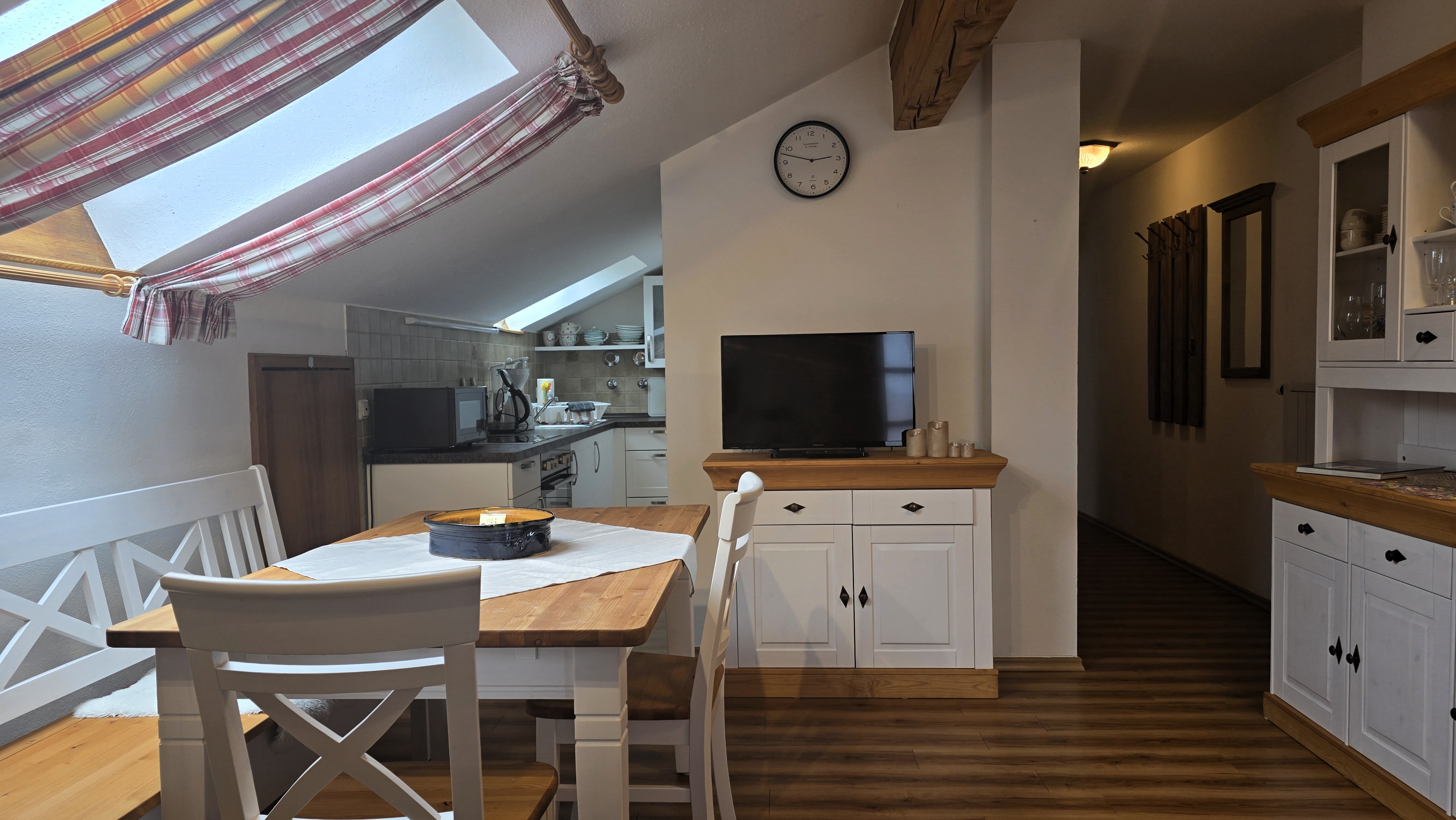 Sie sind romantisch veranlagt? Dann buchen Sie unsere Wohnung Hochfelln. Sie betreten die Wohnung und befinden sich gleich im Wohnbereich, mit typisch bayerischen Kanapee, das ausziehbar ist und so zwei Zusatz-Schlafplätze bietet. Die Eckbank mit Eßtisch ist ebenfalls typisch bayerisch! Hier steht auch ein großer TV-Flatscrene-Fernseher mit Bluerayplayer. Ein großes Dachflächenfenster lässt viel Licht und Sonne herein, vor allem, weil es nach Osten gerichtet ist. Hier haben Sie auch den Zugang zum extrabreiten Balkon (Norden), der überdacht ist und einen Balkontisch mit Stühlen für die Brotzeit bereit hält. Vom Wohnraum geht eine kleine Küchenzeile ab, mit zusätzlichen Dachfenster, die neben Herd und Spüle, Kühlschrank (mit Gefrierfach) und reichlich Geschirr, alles bietet, was man so für das Herrichten der Mahlzeiten so benötigt. Ein CD-Radio sorgt morgens für die gute Laune. Weiter geht es durch den Flur. Hier gehen das Duschbad und das separate WC ab. Schließlich betreten Sie das Schlafzimmer. Hier, wie in der ganzen Wohnung, wurde kürzlich ein heller, moderner Boden in Holzdekor verlegt. Das Schlafzimmer hat einen großen komfortablen Einbauschrank, das bequeme Doppelbett steht unter der Dachschräge. Direkt darüber eröffnet ein großes Dachflächenfenster den Blick auf die Sterne. Das Fenster läßt sich aber auch, zum Schutz vor der Sonne, mit einer Jalousie verdunkeln. Die Wohnung Hochfelln ist somit eine nette, romantische Wohnung, ideal für ein Paar, das sich Ruhe und Zweisamkeit wünscht.